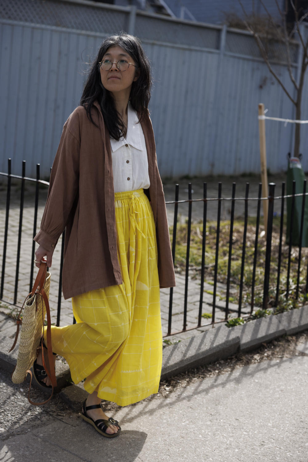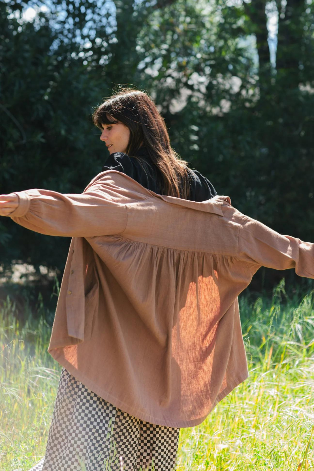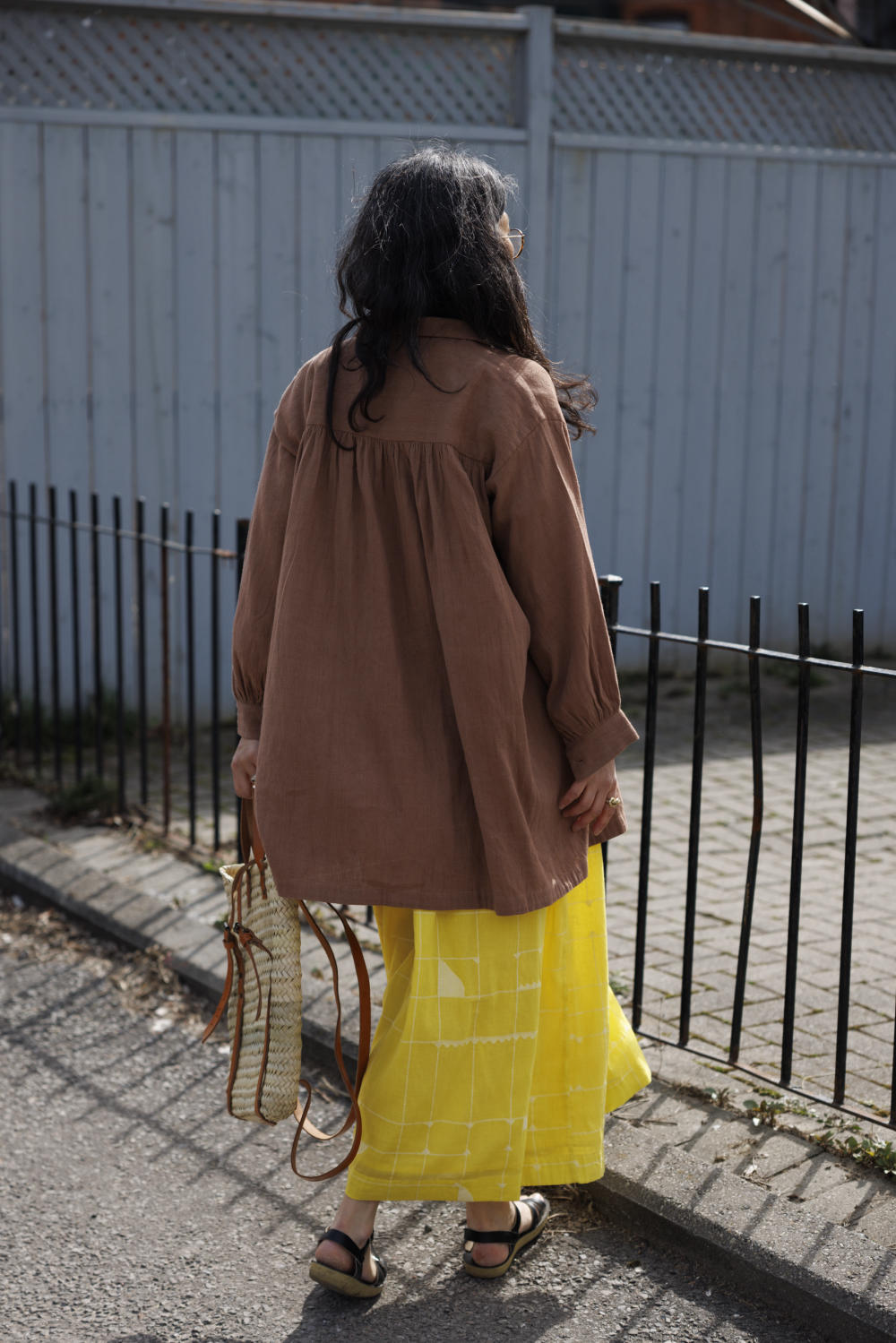 Their silhouettes—relaxed, modern, quietly poetic—carry a language of ease and intention. Natural dyes, azo-free pigments, and slow-woven textiles result in garments that feel honest: soft on the skin, kind to the earth, and deeply respectful of the communities who create them. Each piece is cut and stitched only when ordered, honouring the principle that beauty need not come at the cost of excess.