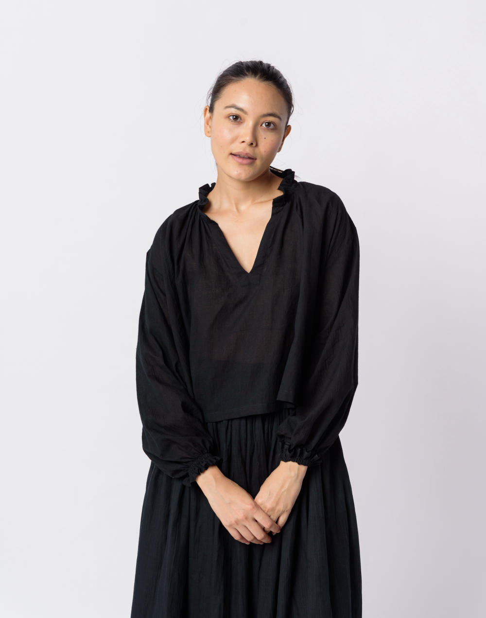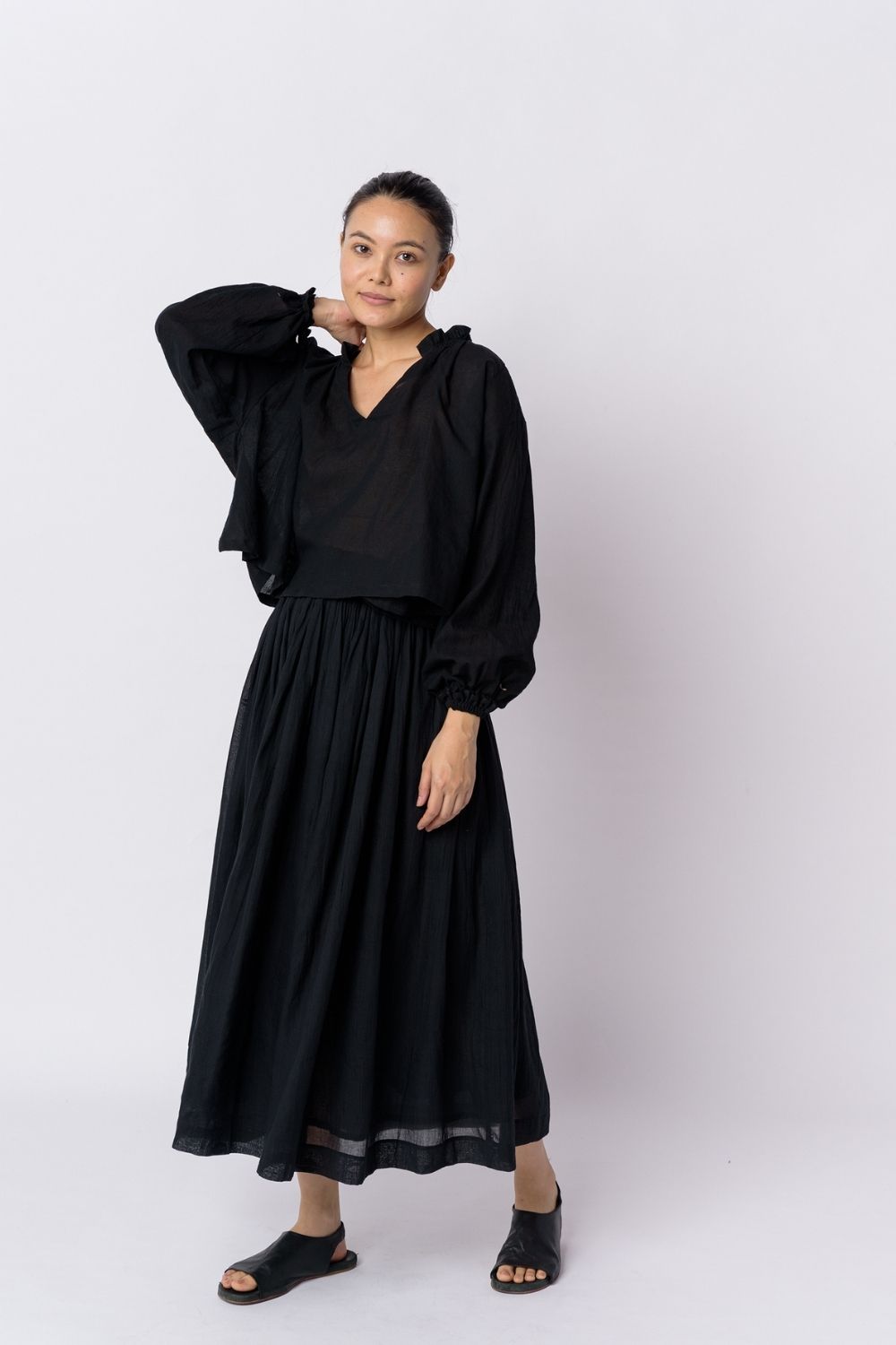 Monochrome black ensemble designed using breathable handwoven cotton fabric from the eastern region of India. Add style and comfort to everyday dressing in this swingy oversized short top with gentle gathers and roomy flare. Everyday staples that work just right for desk to dinner.