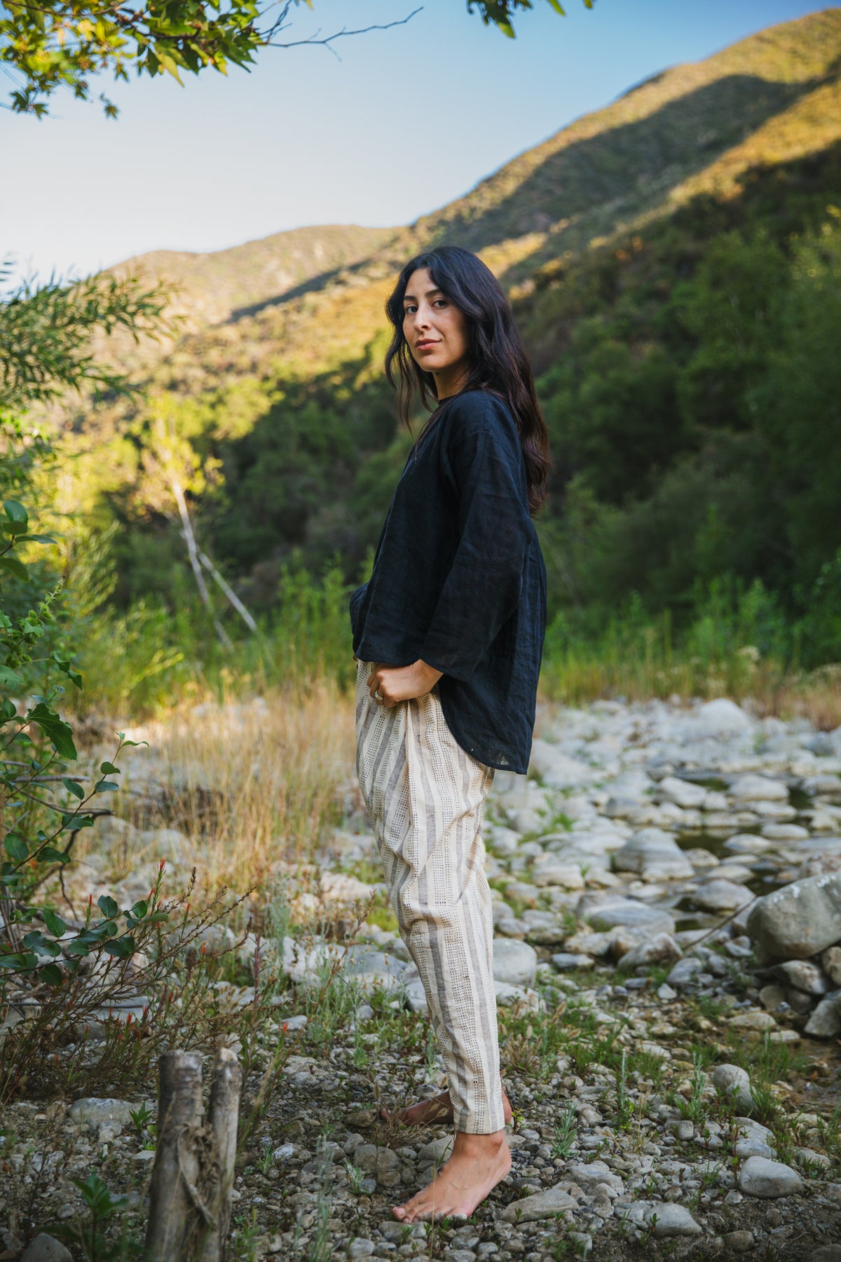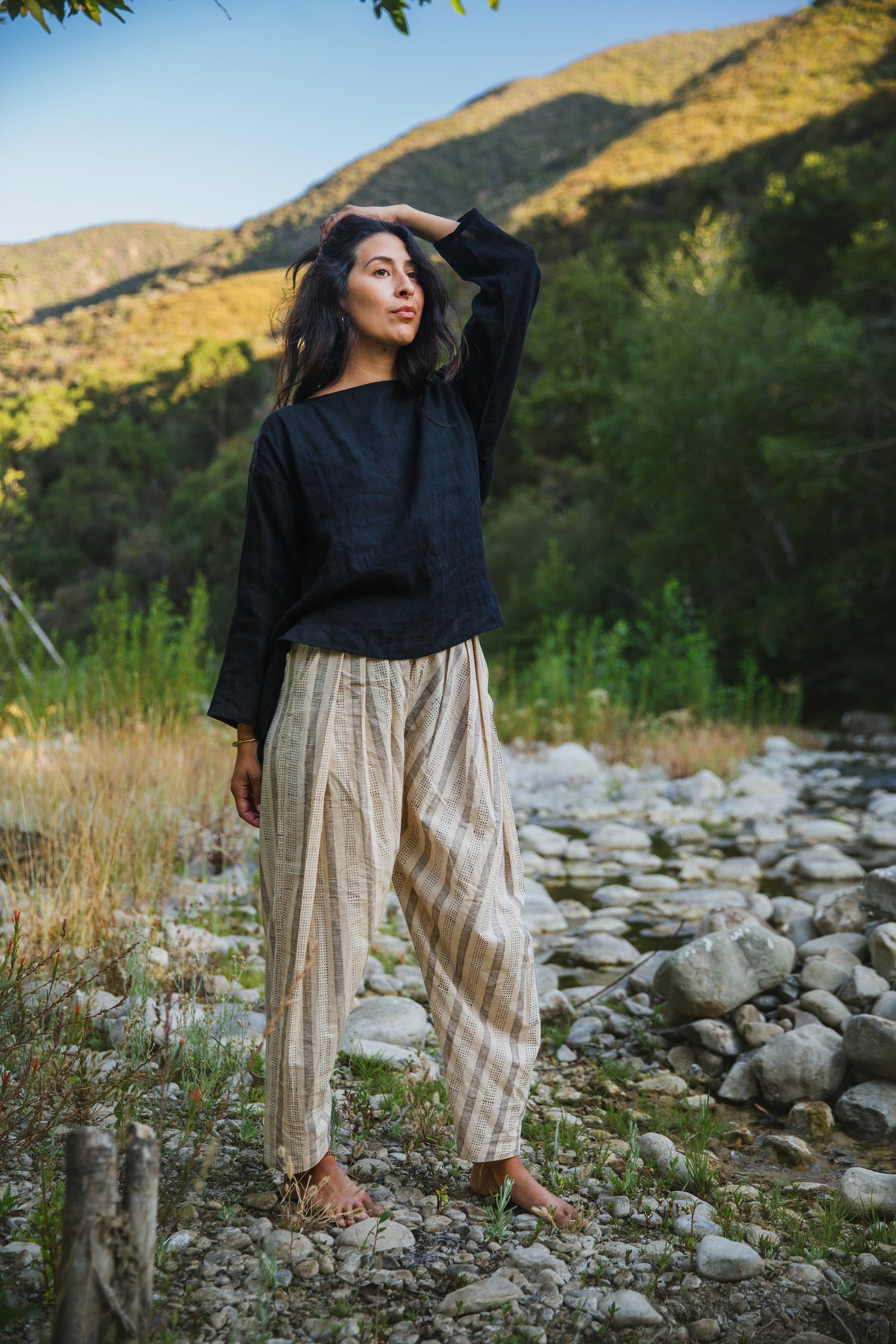 Their silhouettes—relaxed, modern, quietly poetic—carry a language of ease and intention. Natural dyes, azo-free pigments, and slow-woven textiles result in garments that feel honest: soft on the skin, kind to the earth, and deeply respectful of the communities who create them. Each piece is cut and stitched only when ordered, honouring the principle that beauty need not come at the cost of excess.