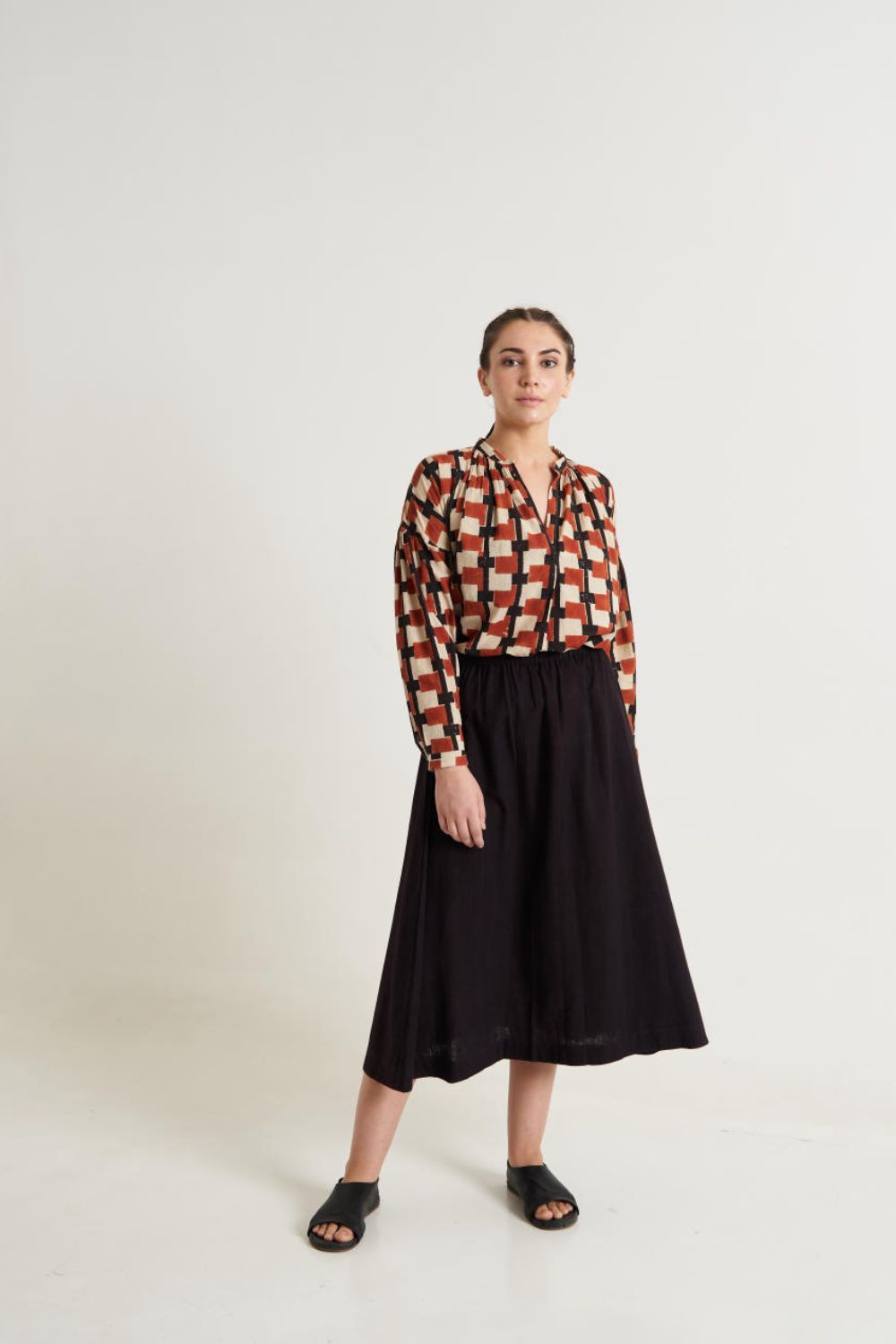 Classic Organic Black Skirt from our Fall '23 Collection. Expertly crafted, this skirt is designed using our iconic organic cotton fabric. Perfect for casual outings and layering it up, its classic design ensures effortless style. Pair with simple footwear like sandals or ballet flats for a refined yet relaxed look.