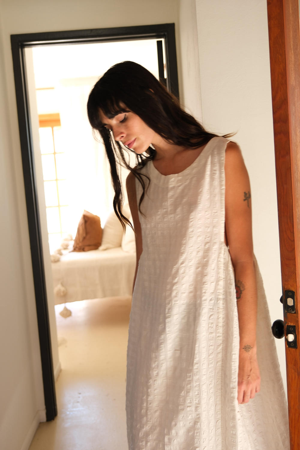 Introducing our Seersucker Midi Dress, a perfect blend of timeless elegance and comfort. Crafted from handwoven cotton, this dress showcases a classic white fabric adorned with the signature seersucker texture. The boat neck adds a touch of sophistication, while the straight hem and midi length create a graceful silhouette. Please note, this dress runs one size up, ensuring a comfortable fit over the bust and a relaxed, flowing fit around the body.