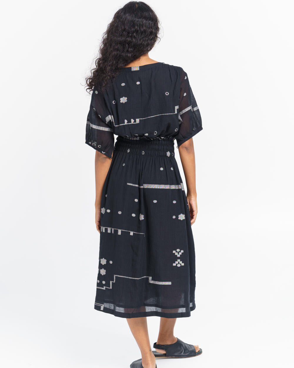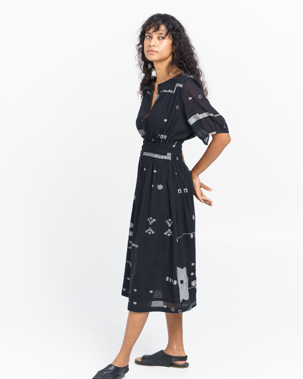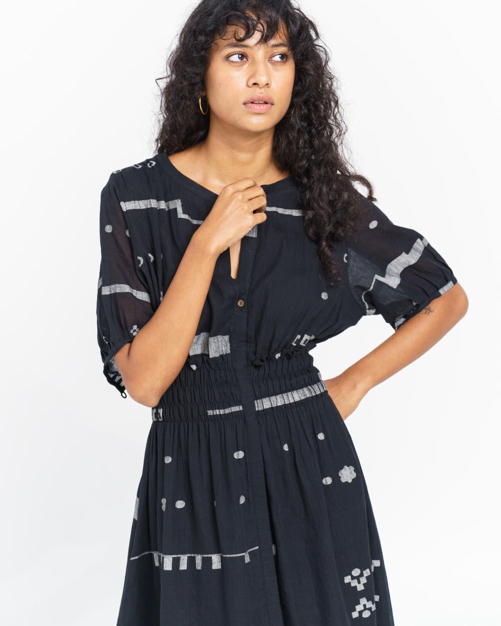 A monochrome hand-detailed midi dress that lets you make a statement with its exquisite abstract motifs handwoven to perfection by inspiring weavers of India. This relaxed-fit dress has a round V-shaped neckline with button-down front enhanced with elasticated waist, short sleeves and inseam side pockets. You can style the dress for laid-back evenings, holidays or summer soirees.