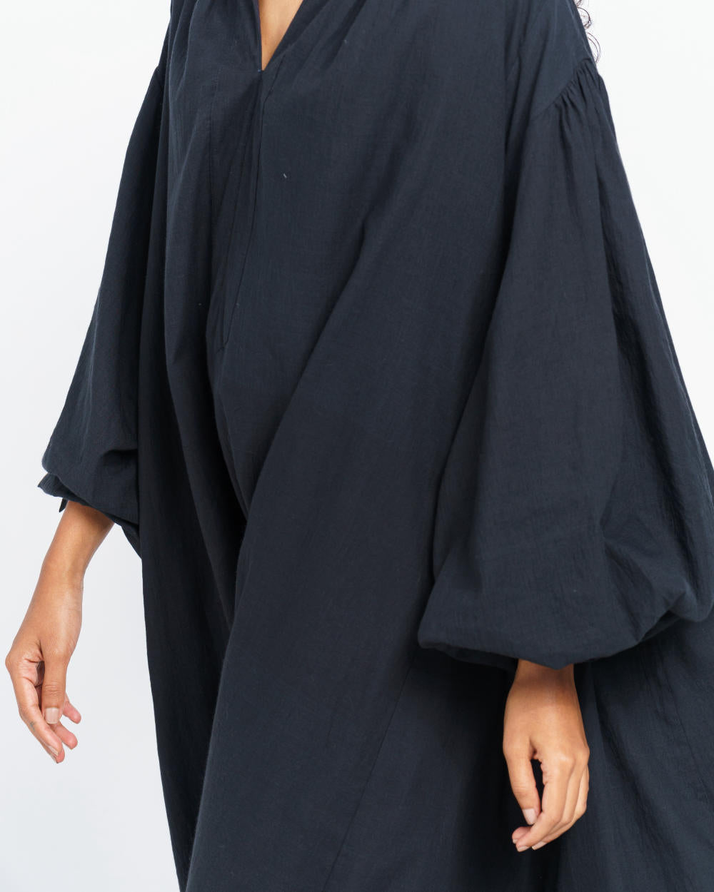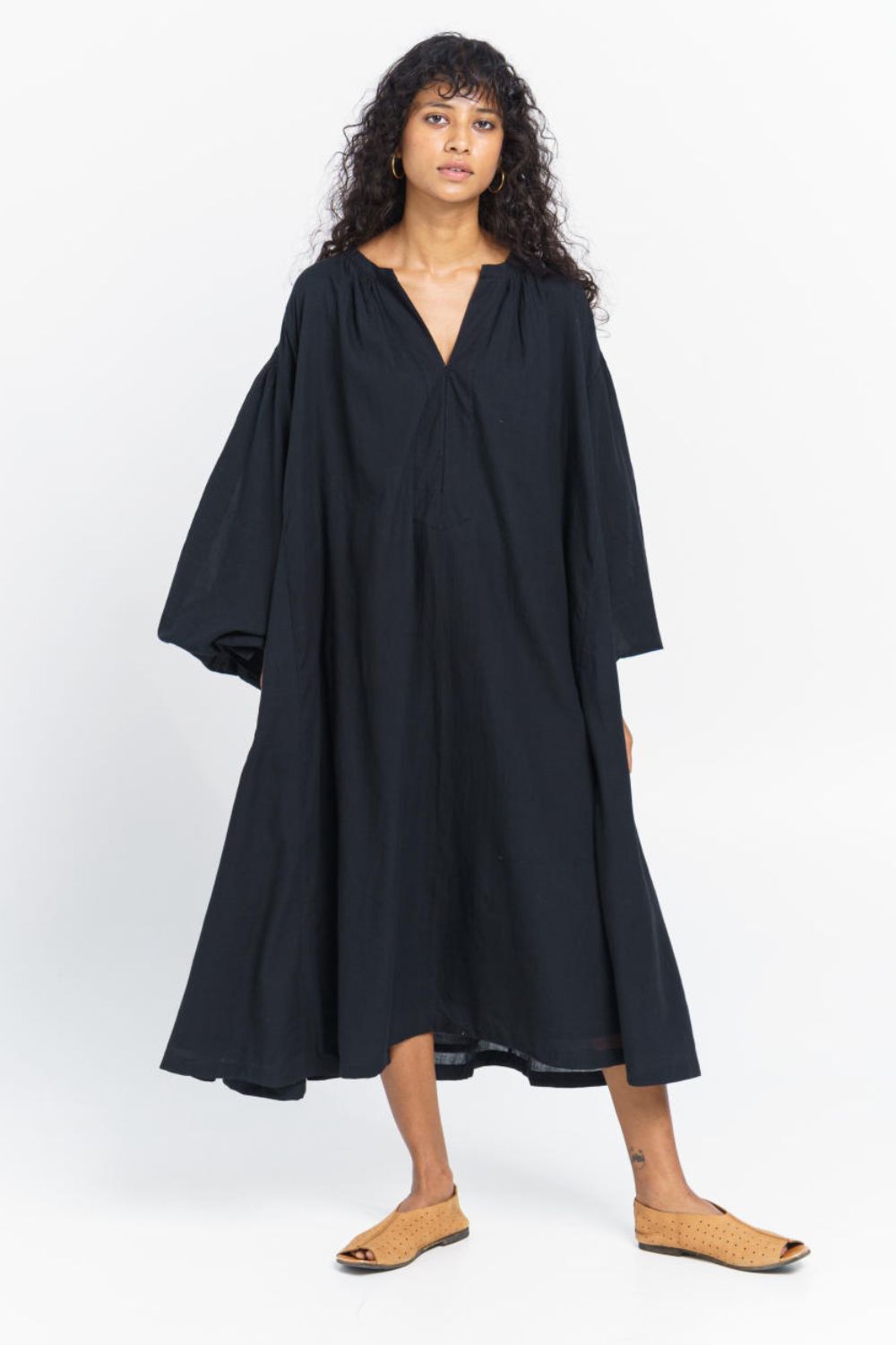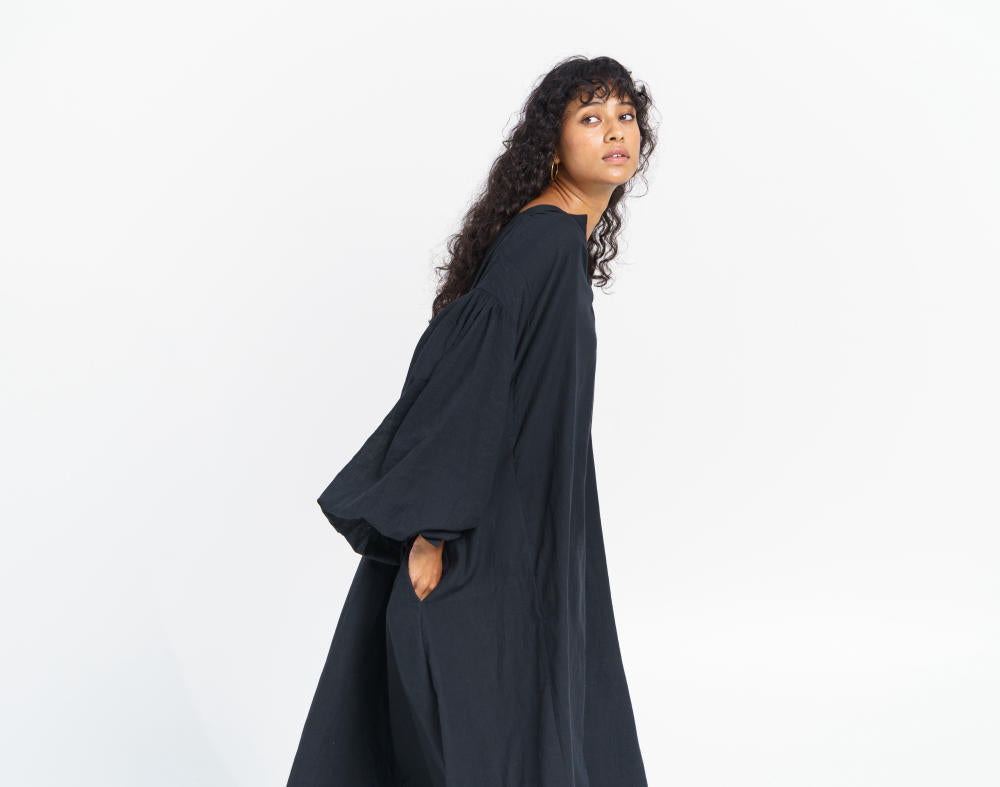 A floaty midi-length dress designed for an oversized fit, softly gathered at the shoulders and sleeves for a roomy flare. An all-day comfort staple detailed with long loosely fitted sleeves, round V-shaped neckline and inseam side pockets. The dress is made from handwoven cotton fabric, carefully crafted by local artisans of India.