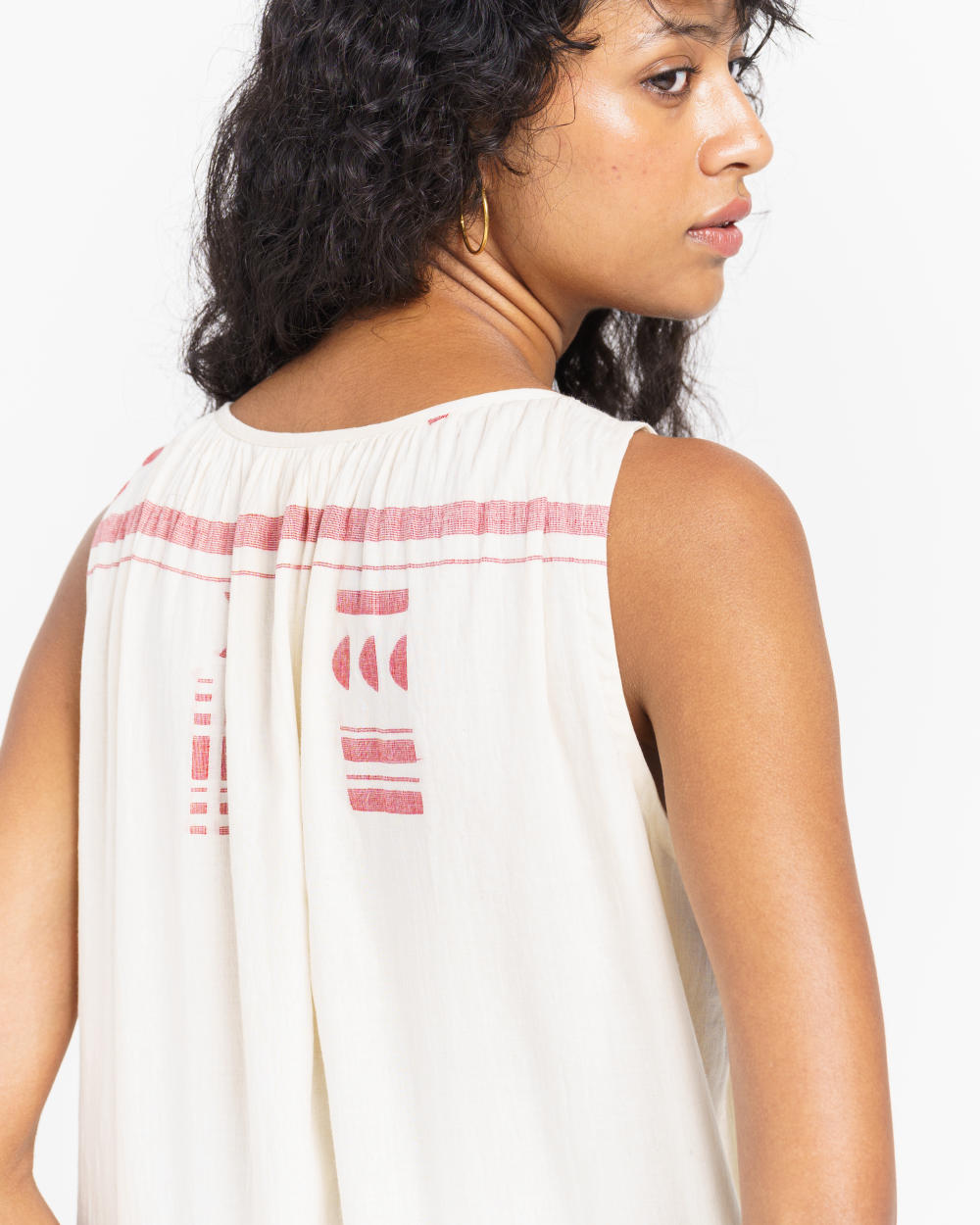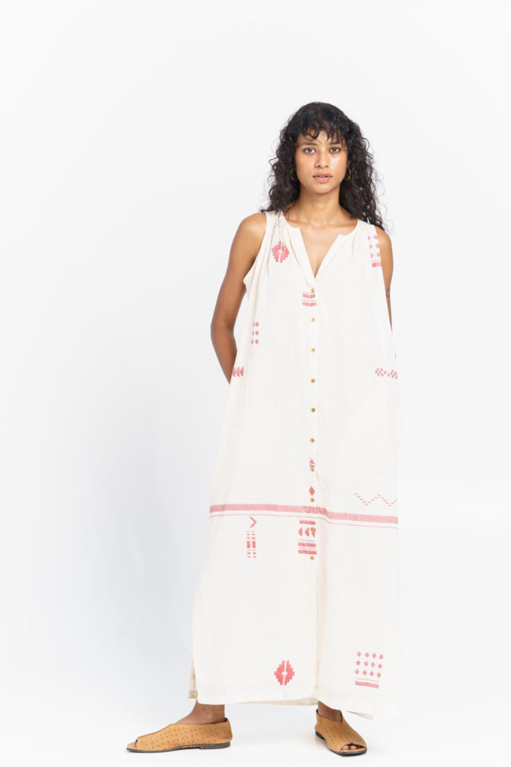 Designed to elevate freedom, this easy slip-on beach tunic is a tropical delight. Crafted from softest cotton fabric hand-detailed with intricate tribal motifs by weavers of Eastern India. This side-slit long tunic features a relaxed V-neckline with button-down front, gentle gathers around the neck and inseam side pockets. Style it as a beach cover-up or as a dress for warm summer days.