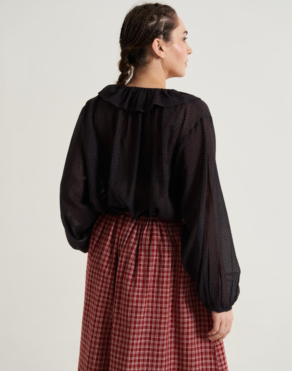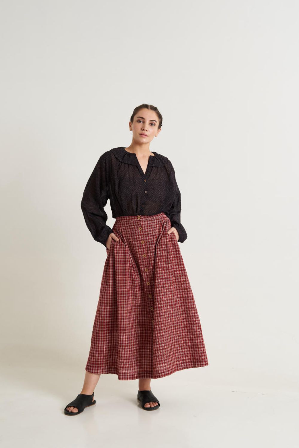 Madras Checkered Midi Skirt from the Fall '23 Collection, its checkered pattern makes the skirt perfect for fall and fall forward. Layer it with your coat. Pair with boots to complete the look.