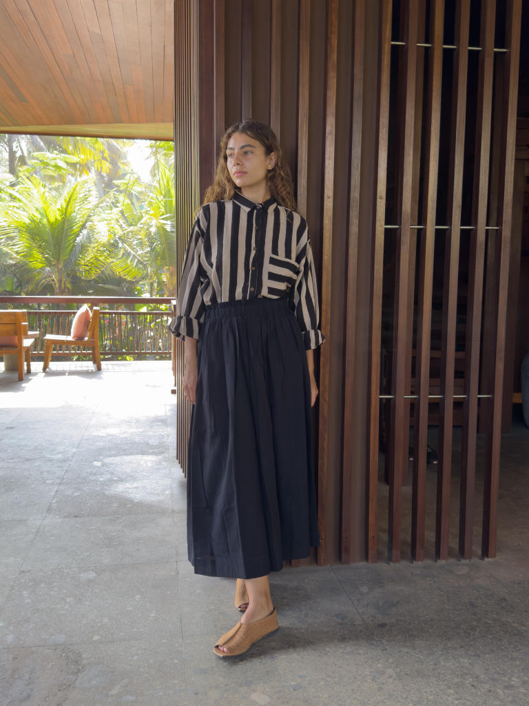 Introducing The Black Crow Pull-On Skirt from the Erica Kim x Crow collection. Crafted from handwoven cotton, this skirt is a perfect blend of style and comfort. The classic black shade gives it a timeless appeal, while the mid-rise elasticated waistband offers a flexible and comfortable fit. With a straight hem and mid-calf length, it drapes elegantly, providing a relaxed yet polished look..