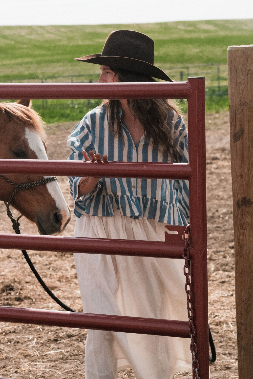 Elevate your everyday with this stylish blue and white striped peplum top designed in collaboration with World of Crow, Erica and Dee Dee.Featuring a modern stand collar and a playful ruffled hem make it perfect for a breezy, put-together look for any casual or semi-casual occasion.