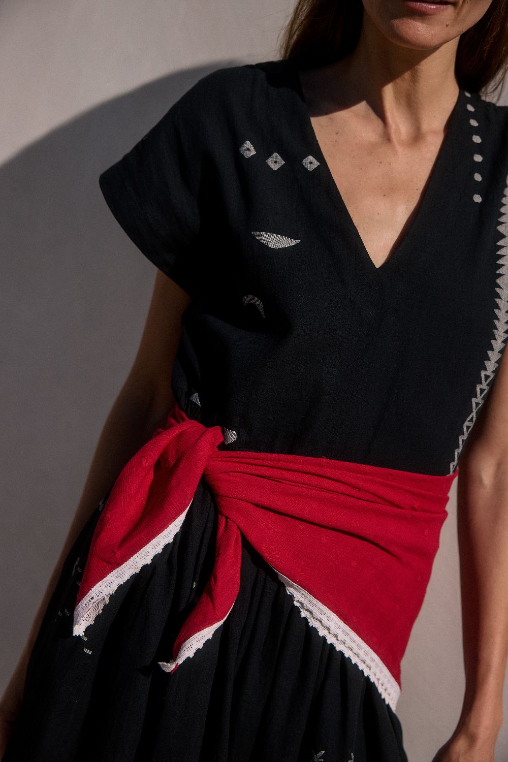Deep crimson Jamdani handwoven cotton with intricate crochet lace detailing.