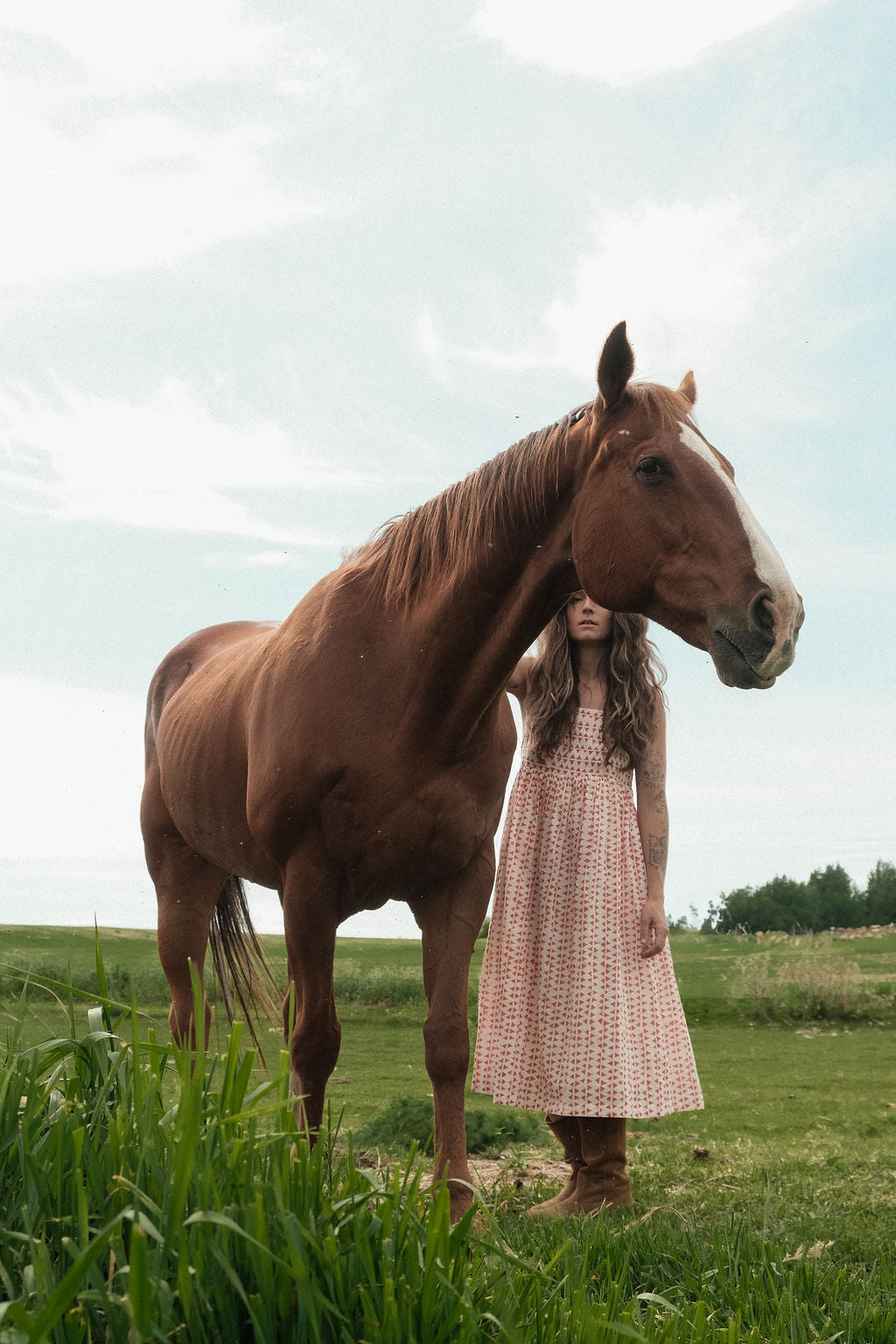 Discover effortless elegance with this comfortable, long-line sundress, a unique collaboration with World of Crow, Erica, and Dee Dee. Its vibrant red triangle print on a crisp white background offers a playful yet sophisticated look. Featuring delicate spaghetti straps and a flowing silhouette with a gathered bustline, it’s perfect for warm-weather adventures, from beach days to garden parties.