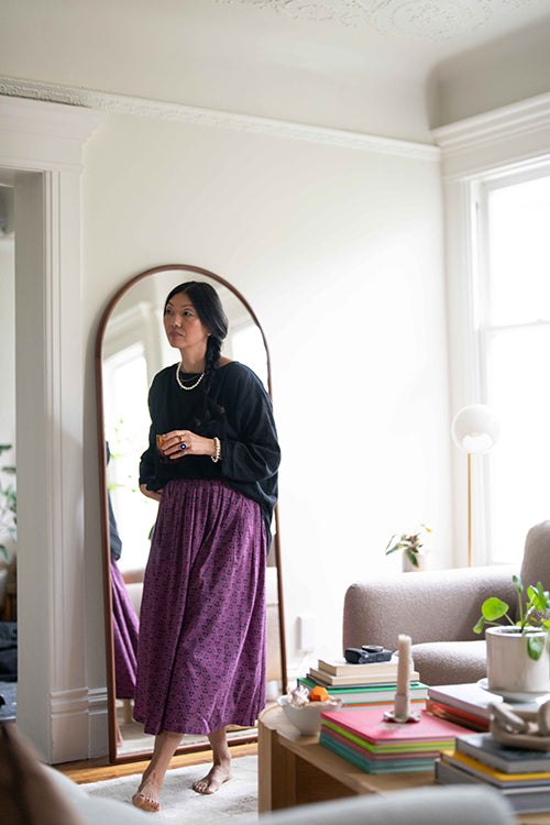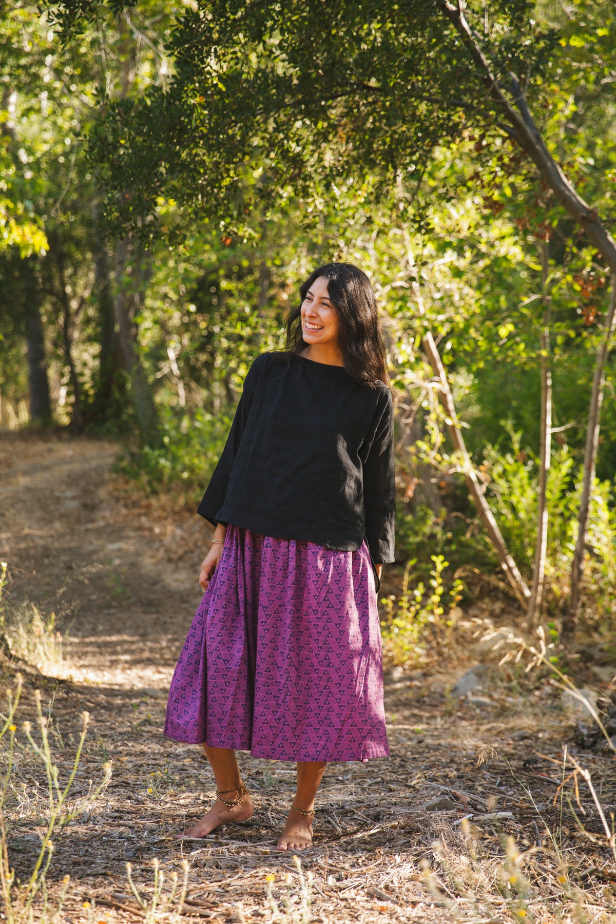 Styled by Meredith Peck, this elegant two-piece set pairs a Black mist Top with a Magenta Sash Skirt. The ensemble combines a relaxed, comfortable top with a flowing skirt that features a subtle geometric print and a high, gathered waist. This look has a chic and elegant feel, perfect for both casual outings and more dressed-up occasions.