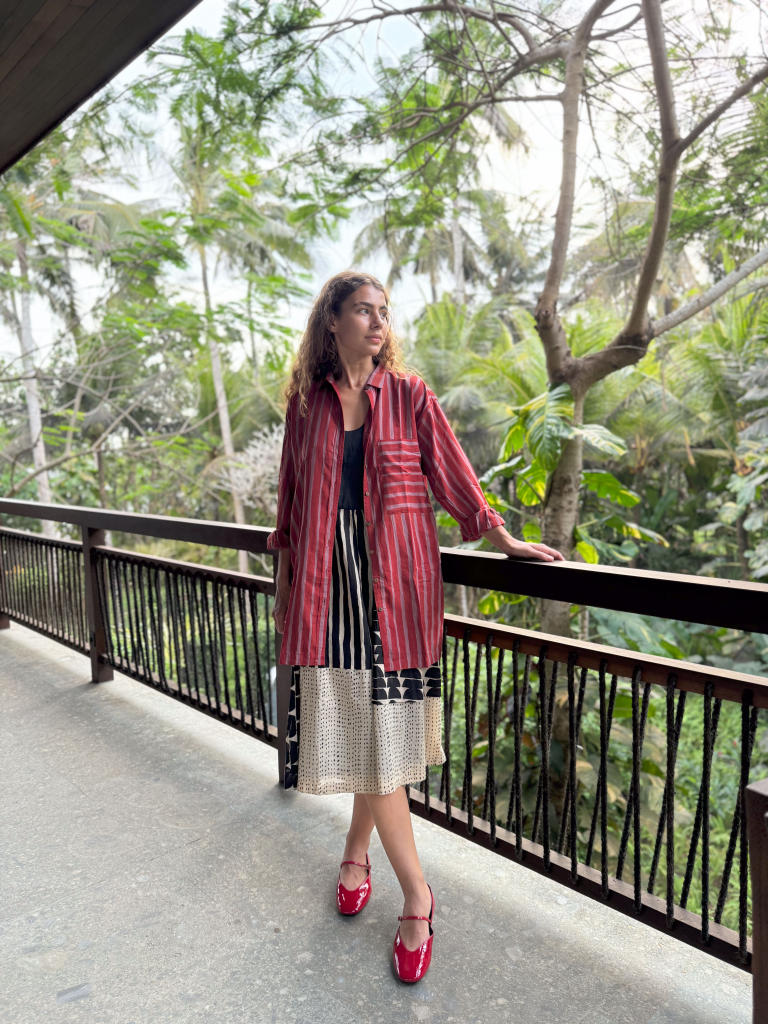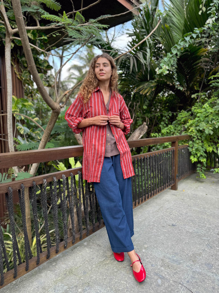 The Red-Striped Shirt from the Half Moons Collection by Erica Kim brings an artistic flair to your wardrobe. Featuring vibrant red and purple hand-block printed stripes, this shirt is meticulously crafted from hand-woven organic cotton. Its relaxed silhouette is enhanced by puff full sleeves, gathered cuffs, and a straight hem, making it both stylish and comfortable. With a classic straight collar and a short length, this lightweight piece offers versatility, perfect for both casual days and creative ensembles. Sustainable, organic, and effortlessly chic, this shirt reflects the blend of tradition and modernity that defines the collection.
