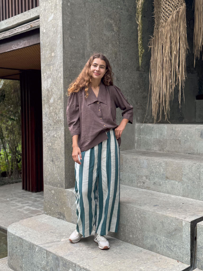 Channel the spirit of the '80s with the Retro Pants from the Half Moons collection by Erica Kim. Featuring bold green stripes and handwoven cotton, these pants offer a nostalgic nod to retro culture while maintaining a modern, artisanal feel. Hand-block printed and naturally dyed, they’re crafted with an elasticated waist for comfort and a straight hem for a tailored touch. Perfect for creating a laid-back yet stylish look, these pants are a versatile addition to your wardrobe. Made from 100% organic cotton, they balance vintage charm with sustainable craftsmanship.