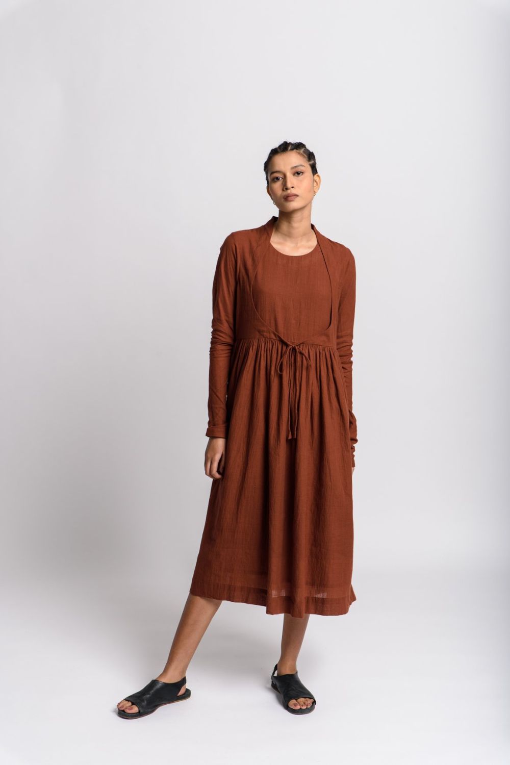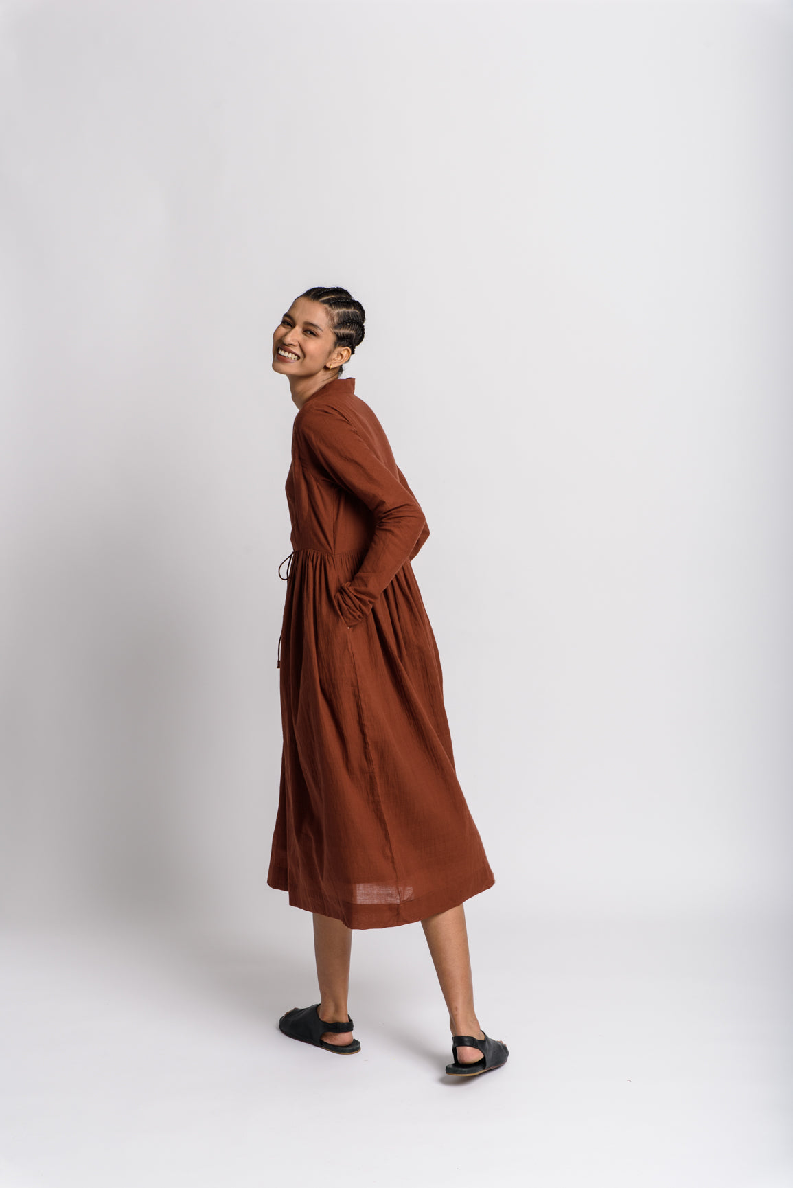 Our vintage long dress, made of hand-woven textiles by the skilled weavers of India. The fabric is made from 100% cotton and has a beautiful, unique texture. Layer it up at the yoke with a tie-up detail, round neckline, soft gathers around the waist, and long sleeves. You can wear it as a dress or as a tunic paired with denims.