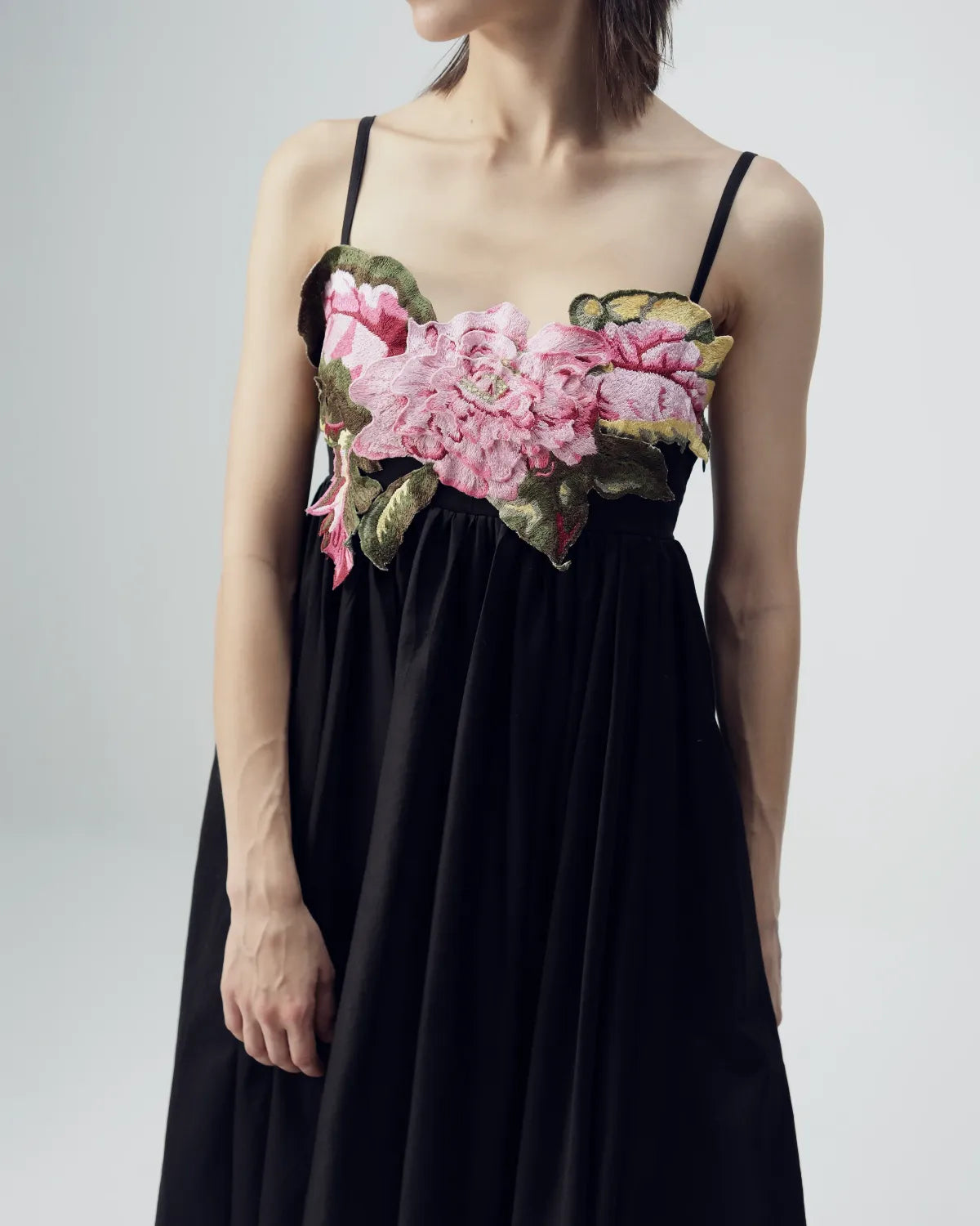 Elevate your wardrobe with this chic black midi dress, designed with a blend of minimal elegance and artistic detailing. The dress features delicate shoulder straps and a soft, flowy silhouette that falls gracefully below the knee. Its highlight is the beautifully crafted floral patch machine embroidery on the bodice—an intricate arrangement of pink blossoms and lush green leaves that adds a romantic, handcrafted charm to the otherwise sleek and modern design. Comfortable, lightweight, and effortlessly stylish, this dress makes a perfect choice for brunches, intimate gatherings, evening outings, or statement daywear.