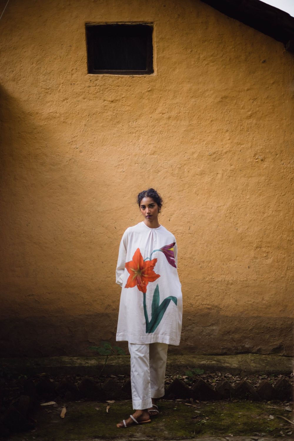 The print features in hand drawn botanical motifs in a white base The set includes a kurta with pleats on the neck and pearl detailing in cotton twill.