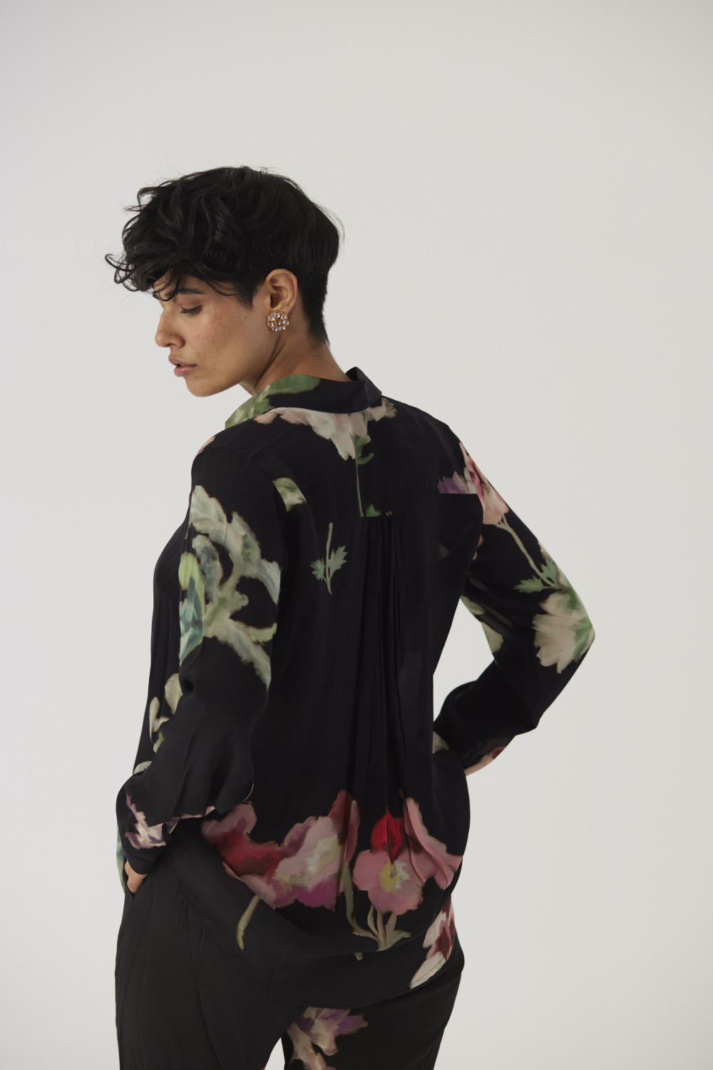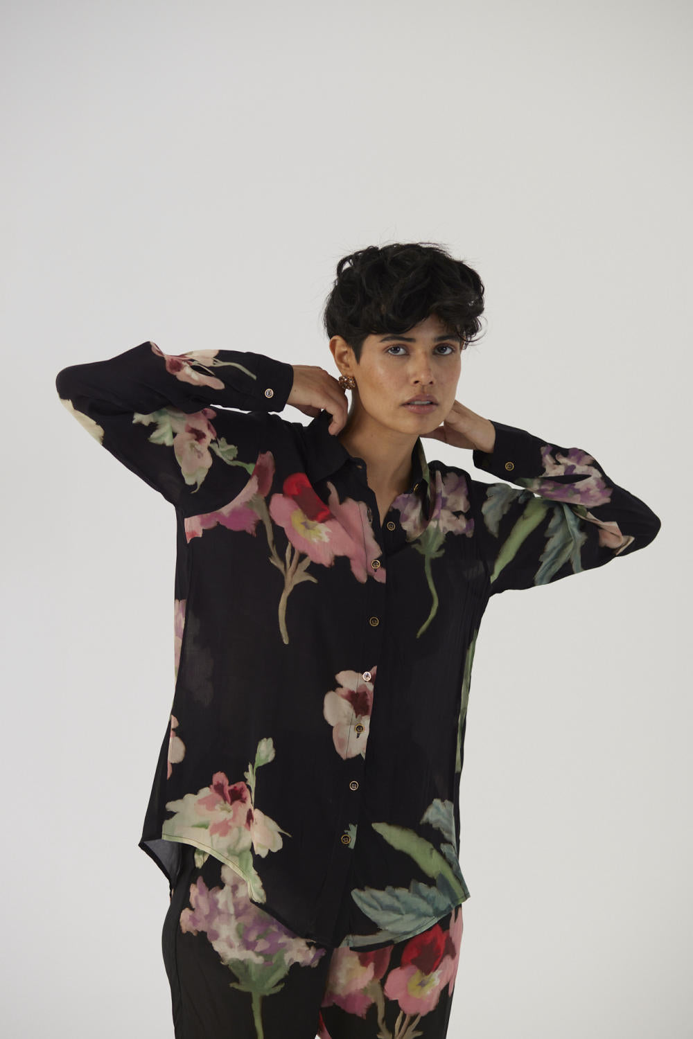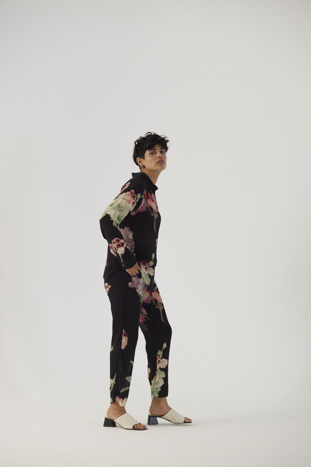 The print features hand drawn botanical motifs in a black base. This set is crafted in the Juliet print carefully printed on crepe featuring a set of shirt and pants.