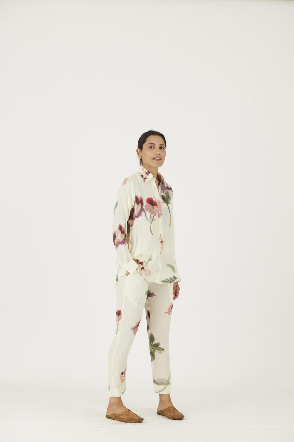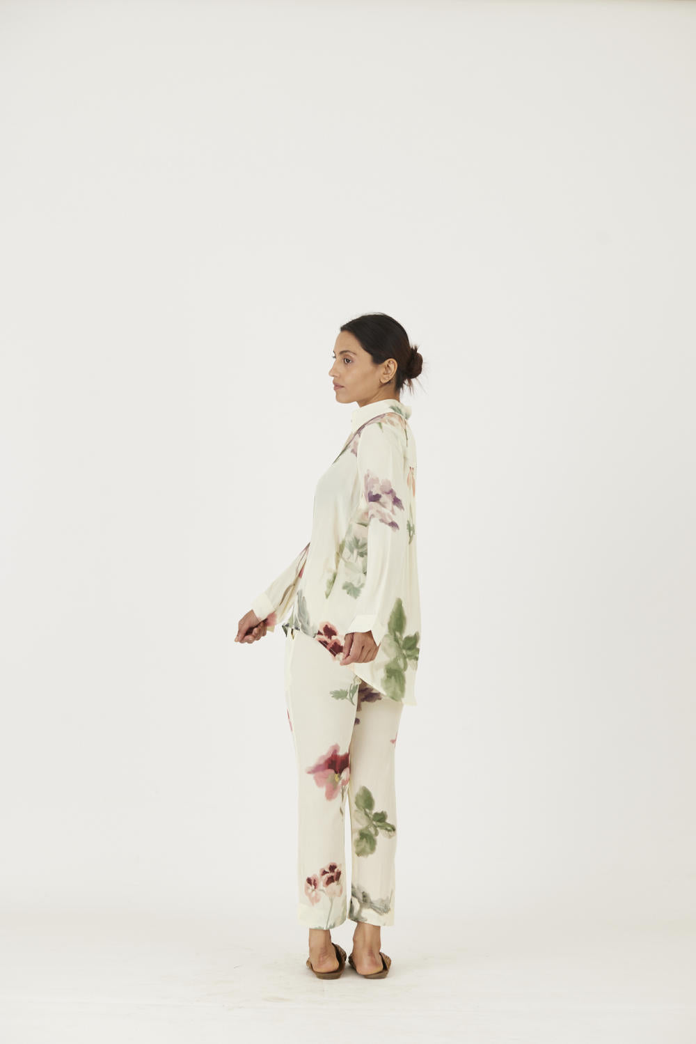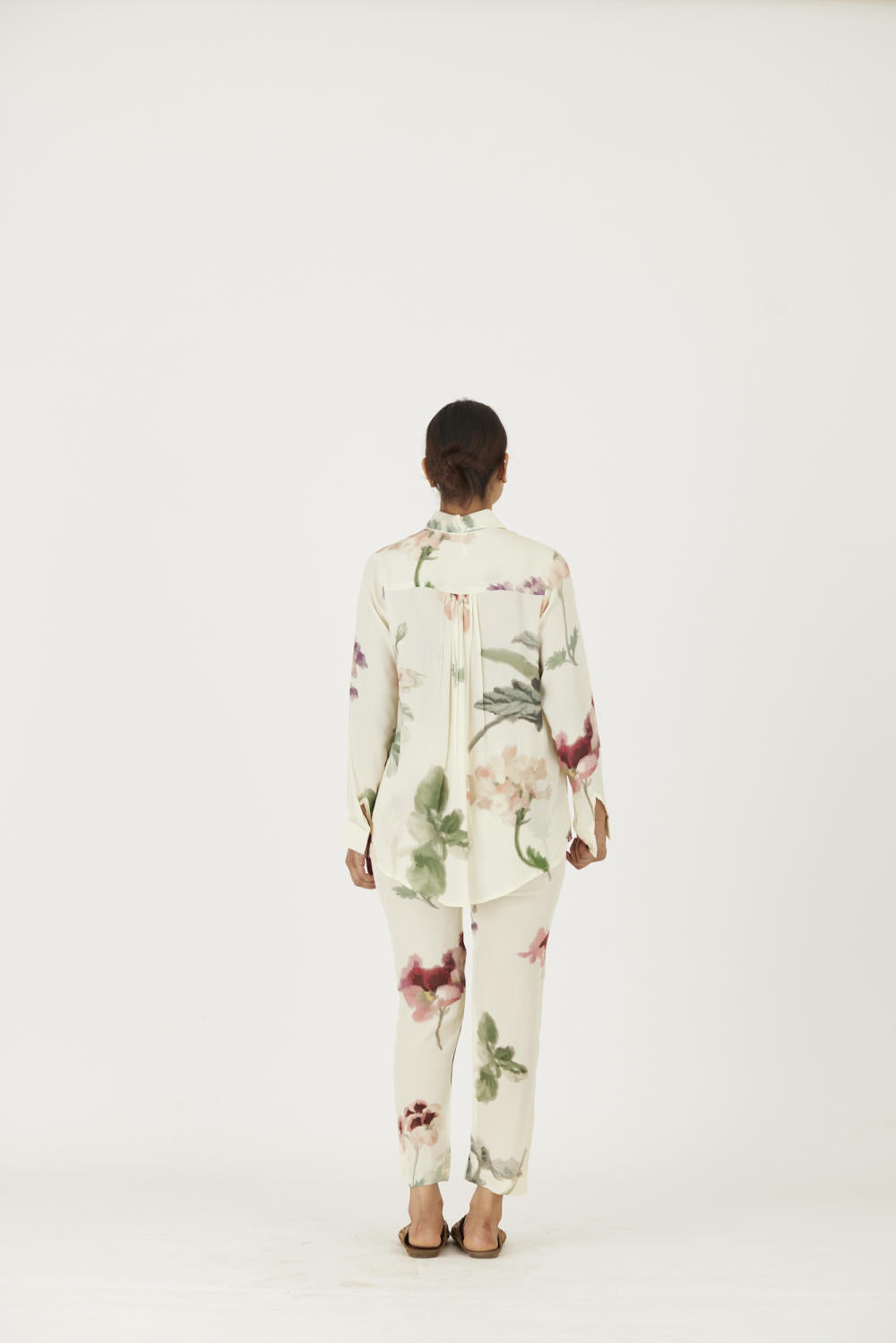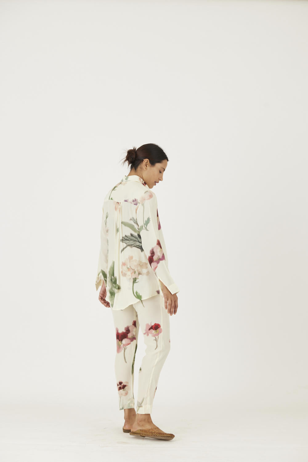 The print features in hand drawn botanical motifs in a soft white base. The set includes a button down shirt with back gathers and pants in crepe.