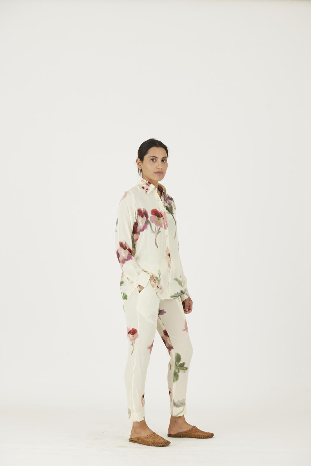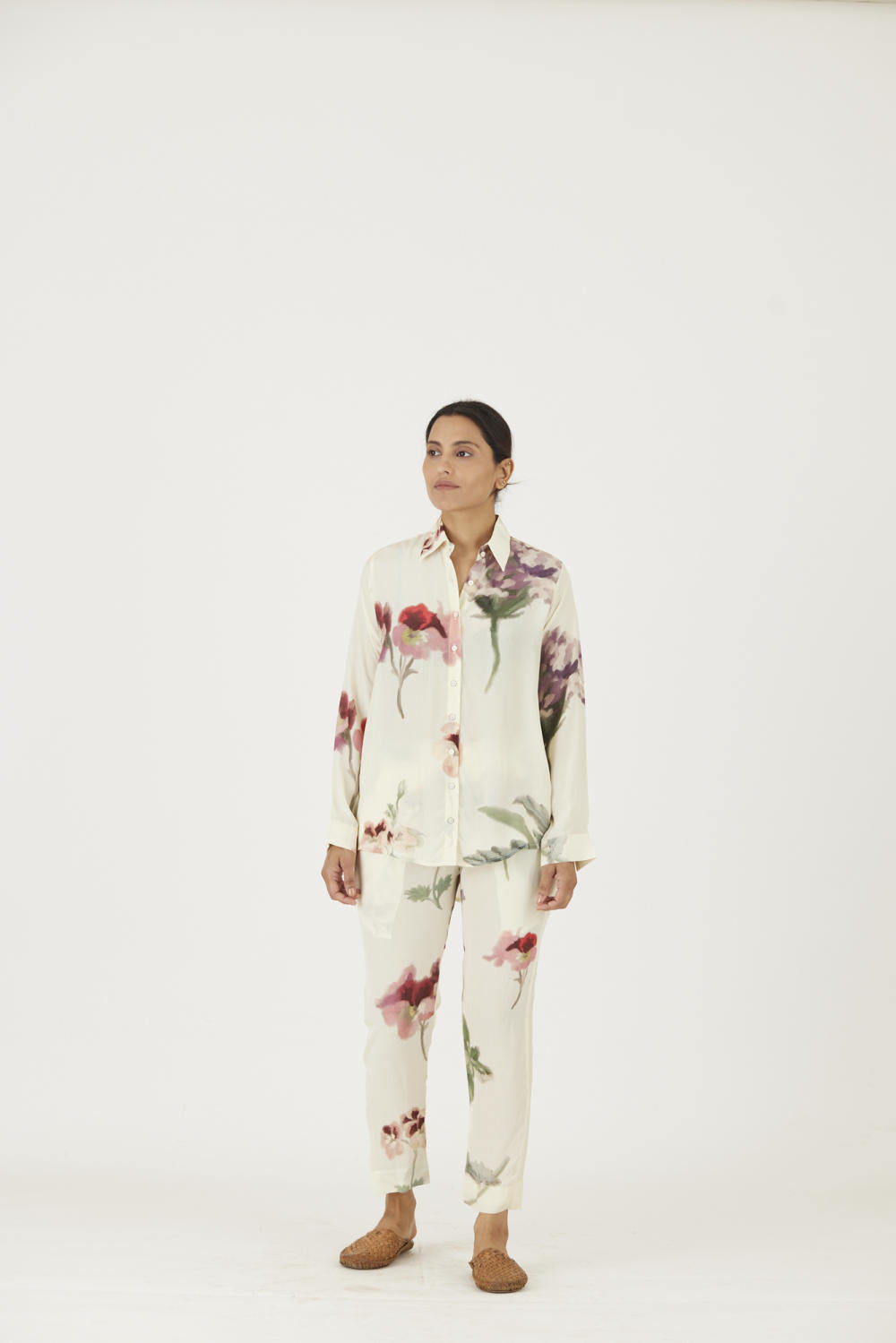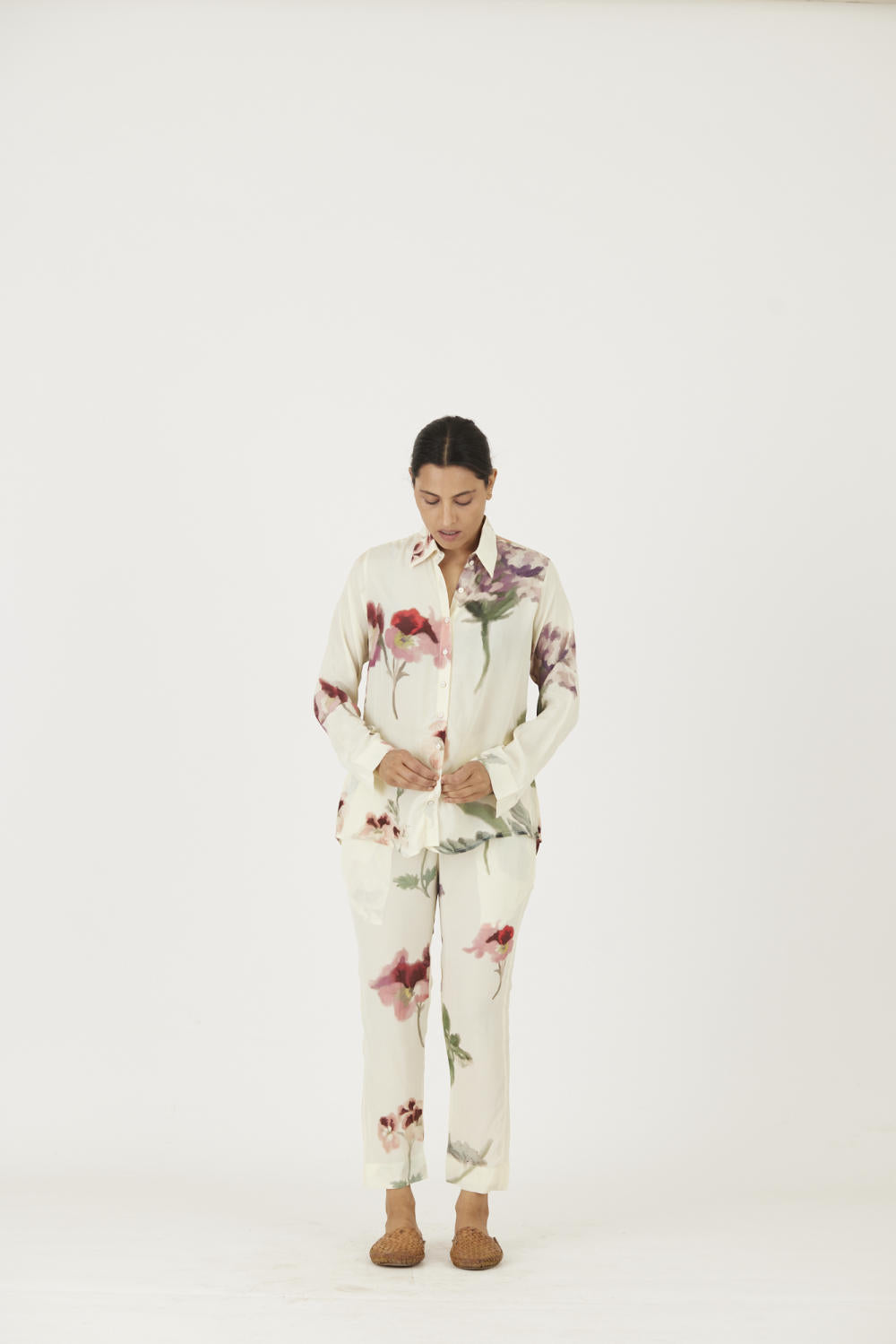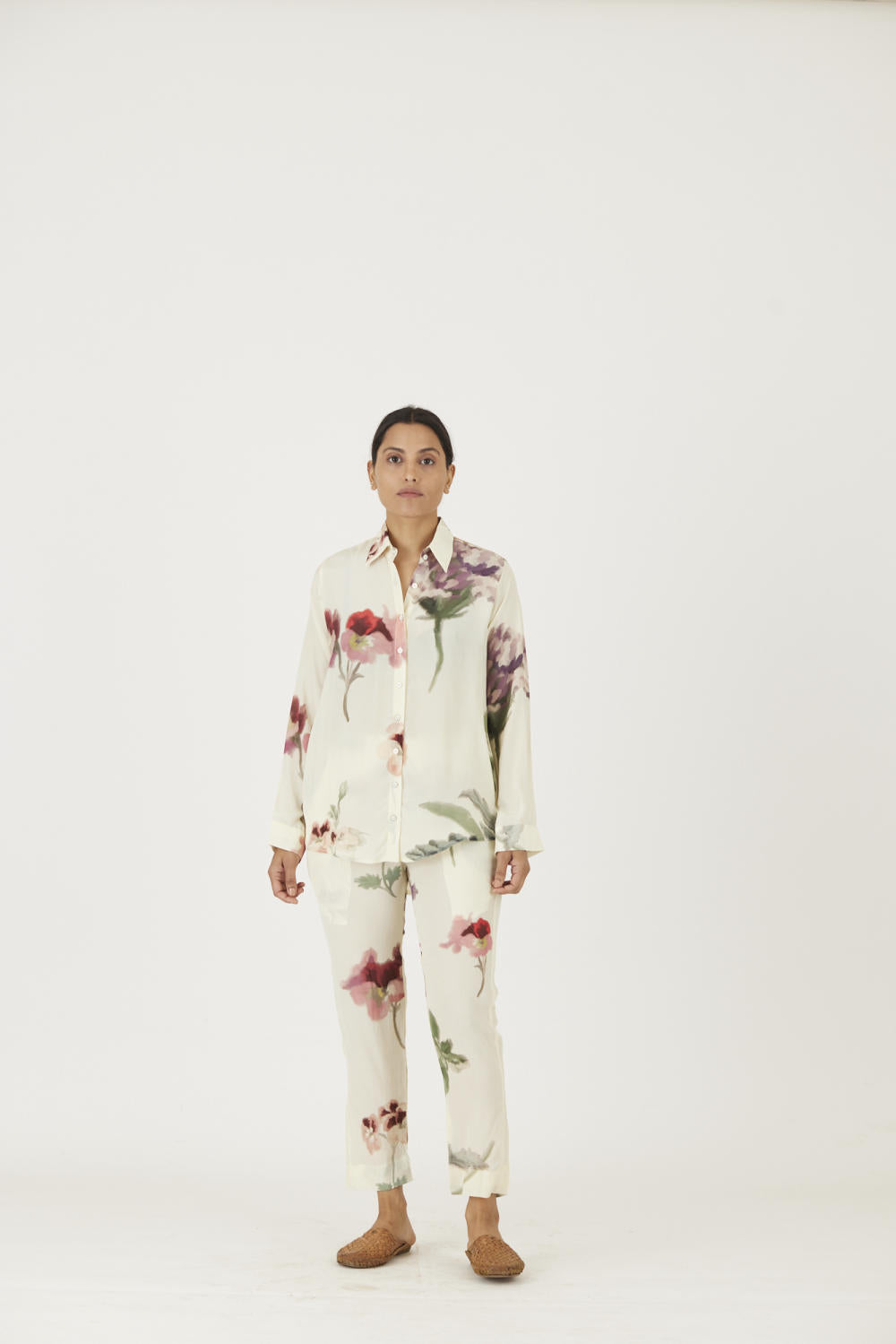 The print features in hand drawn botanical motifs in a soft white base. The set includes a button down shirt with back gathers and pants in crepe.