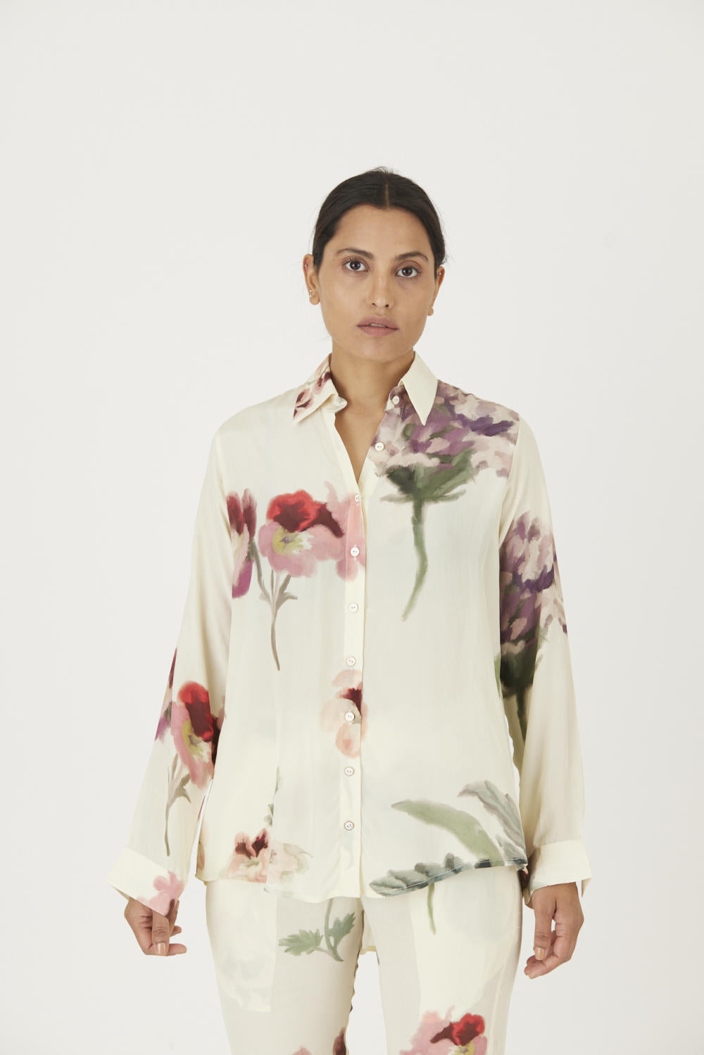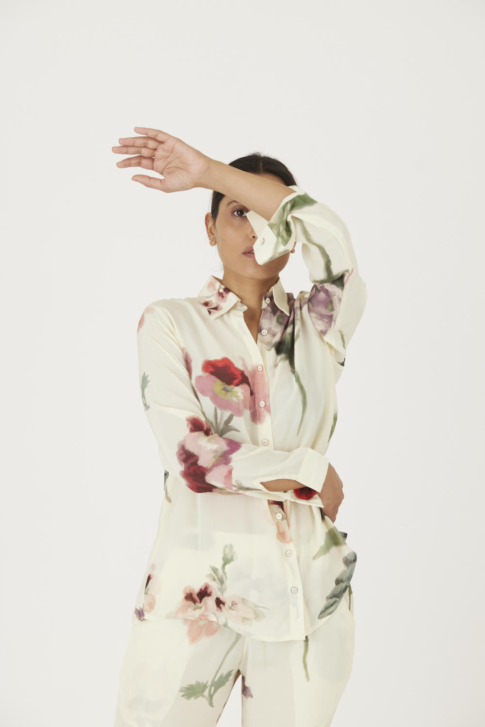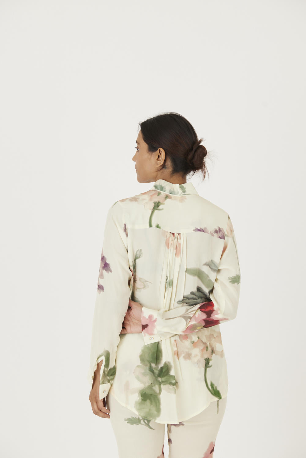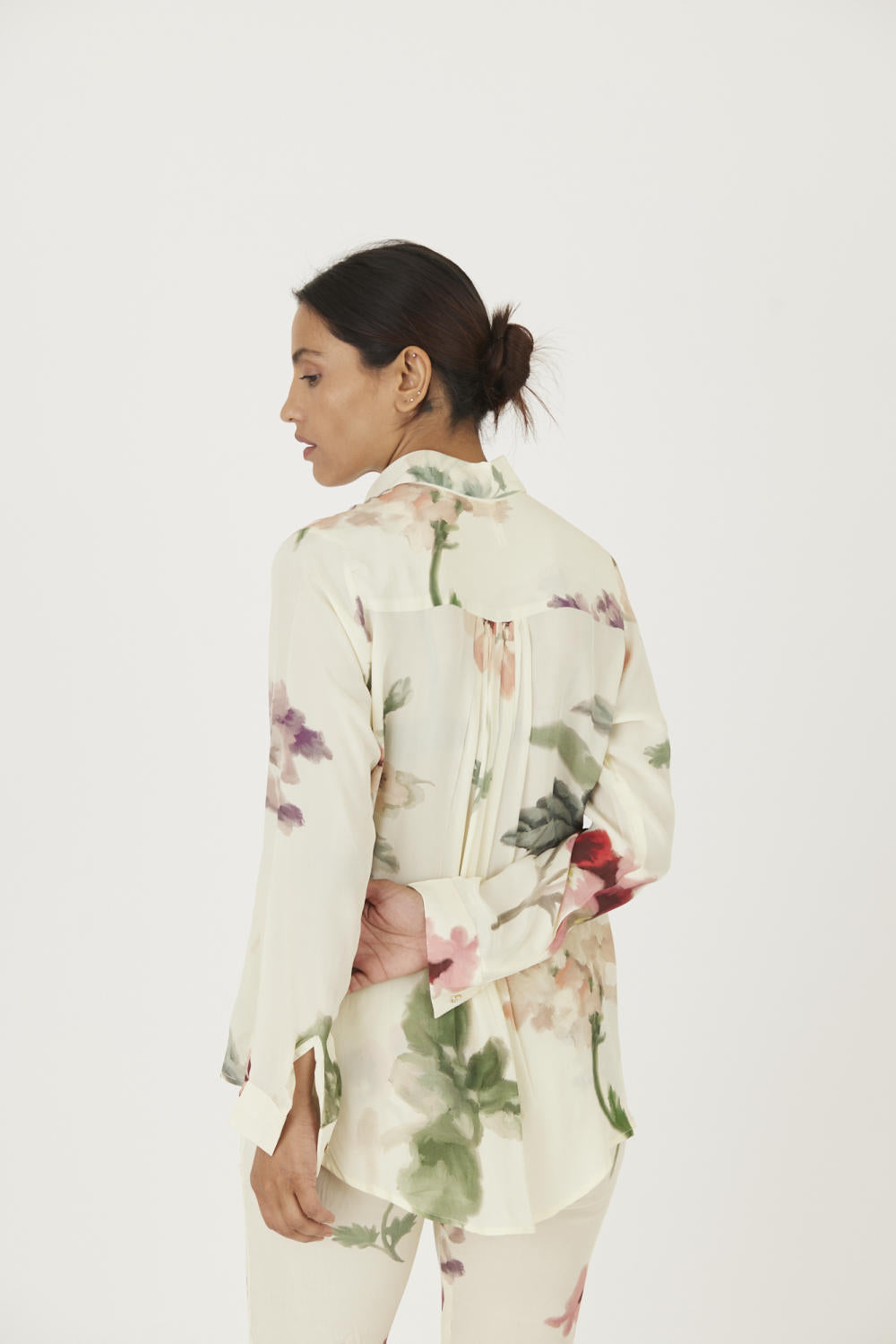 The print features in hand drawn botanical motifs in a soft white base. The set includes a button down shirt with back gathers and pants in crepe.