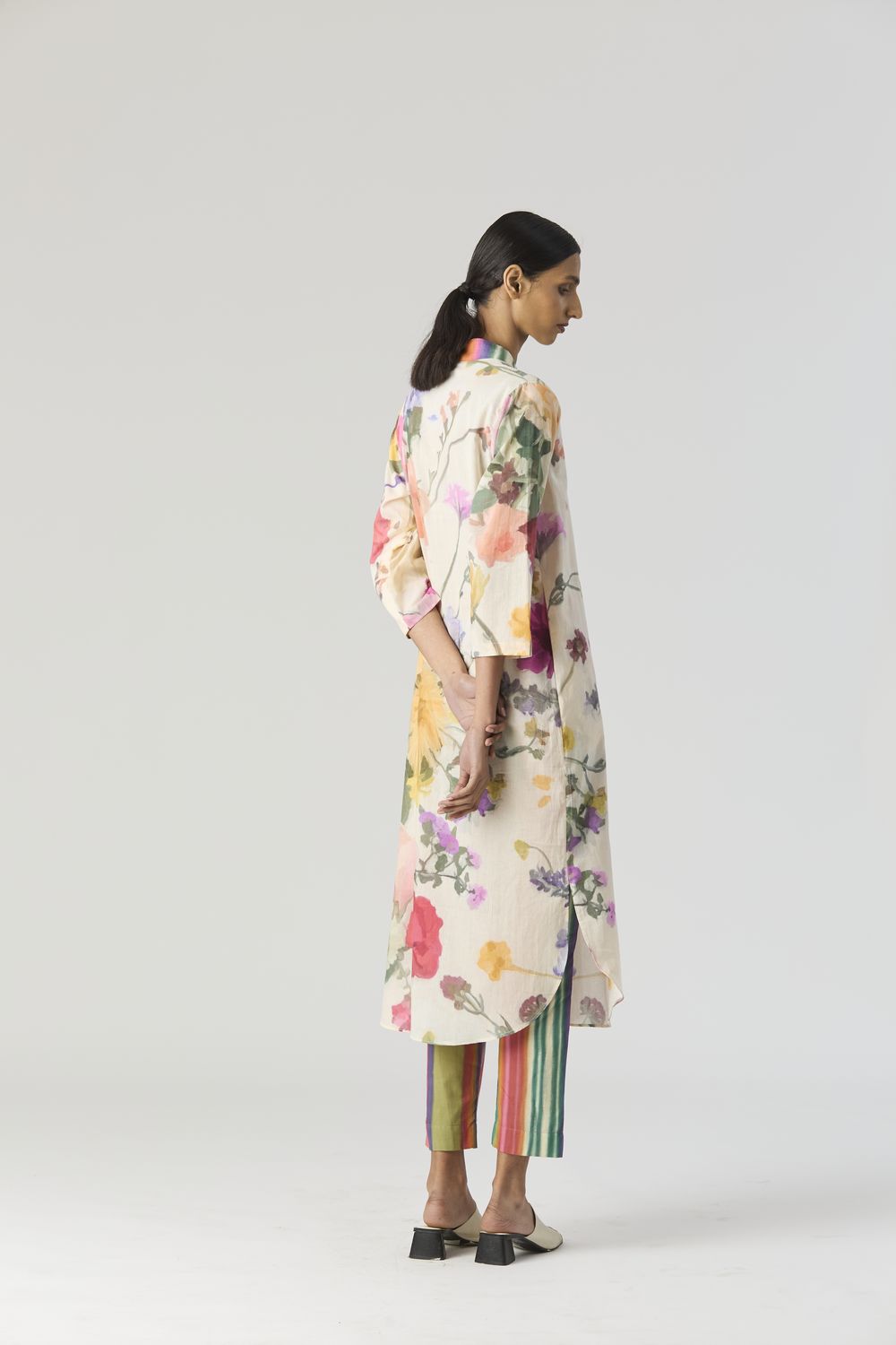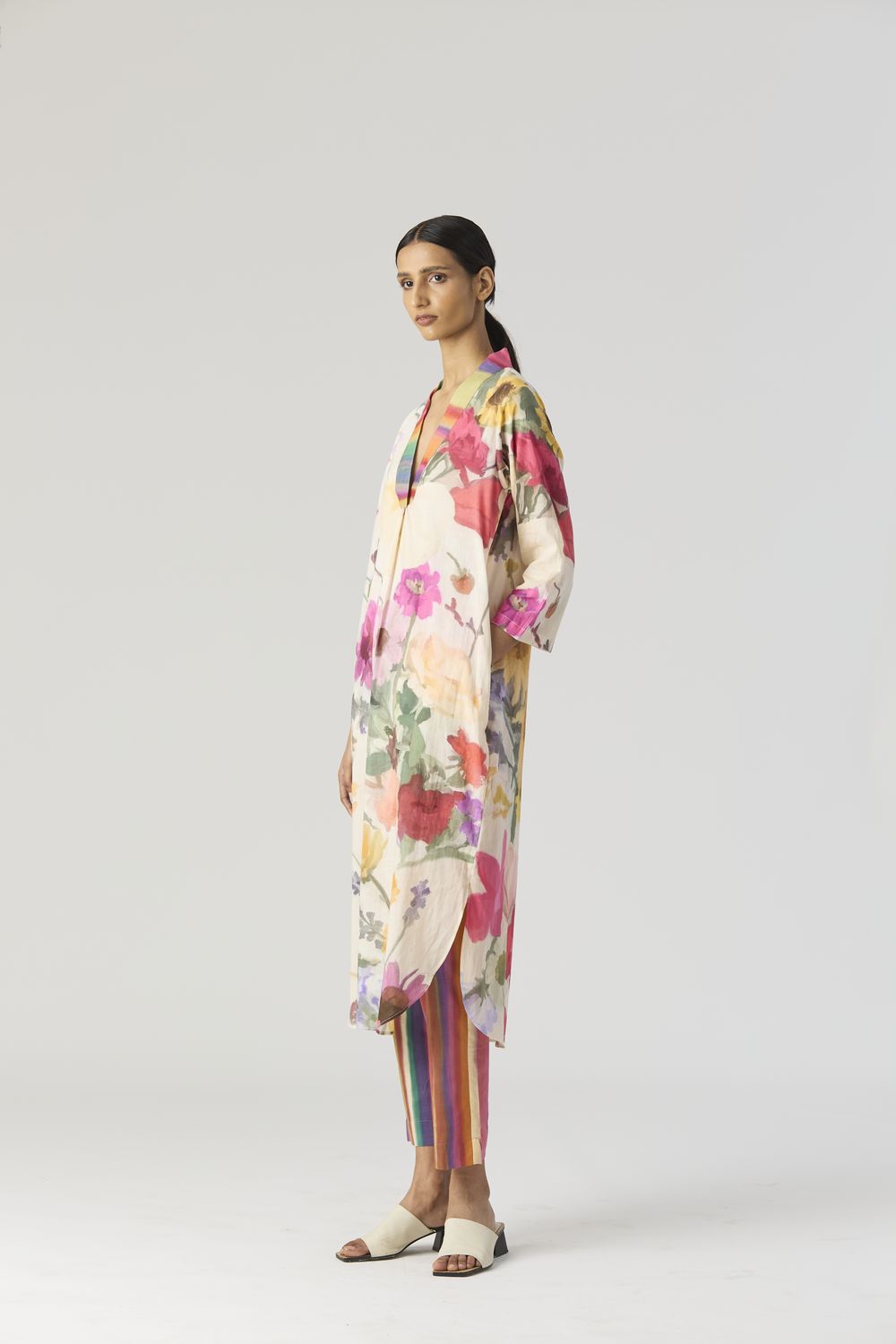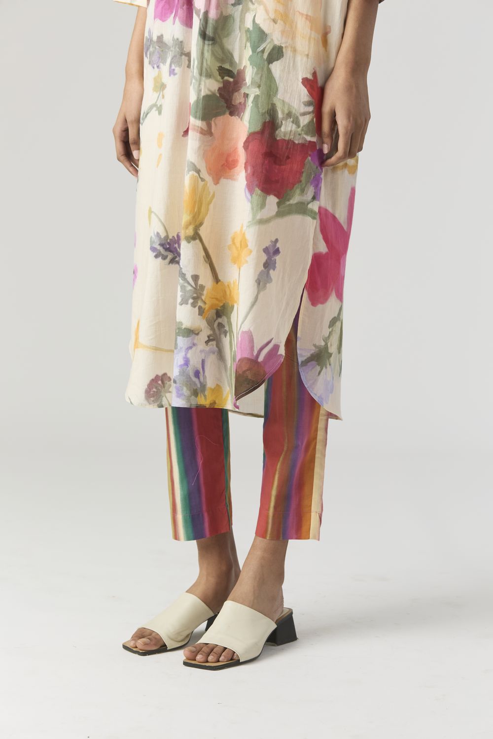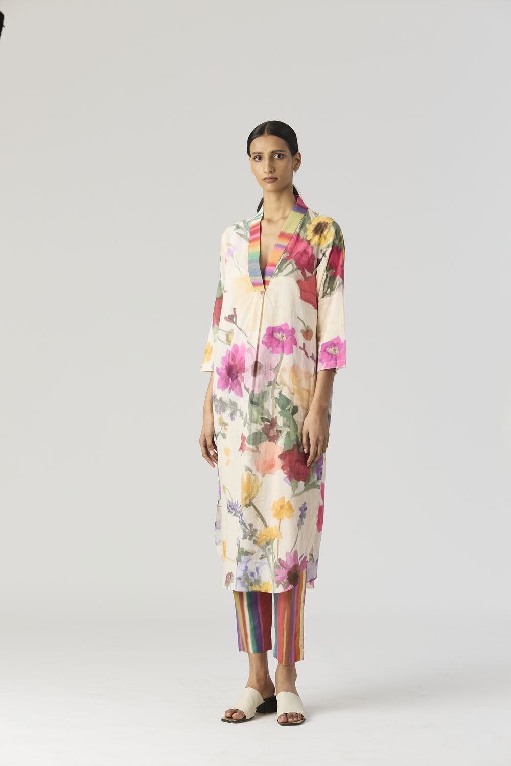 The set is crafted in the Maria print carefully printed on Cotton Cambric. The Kurta has stripes Collar patti detailing on the neckline