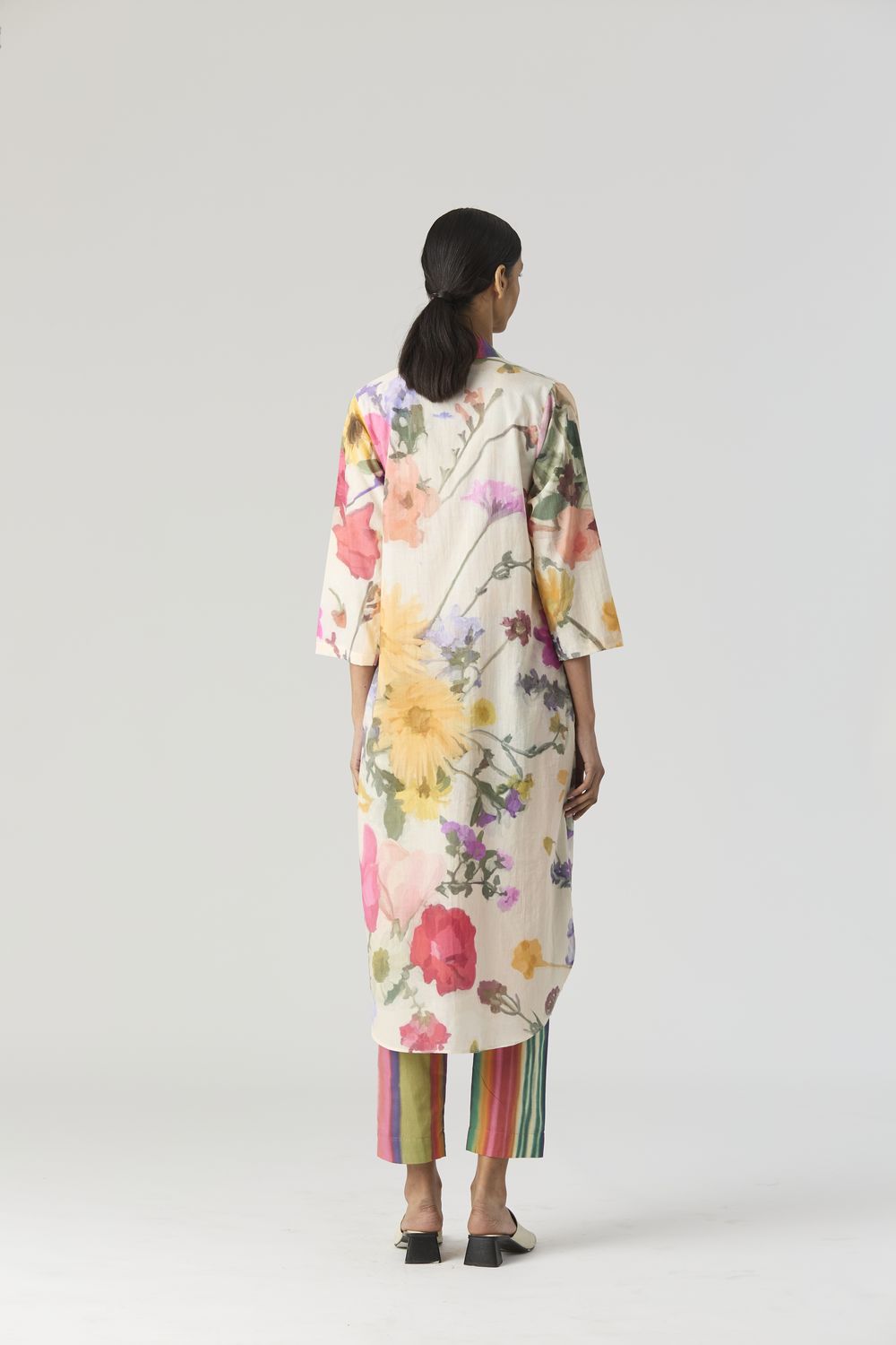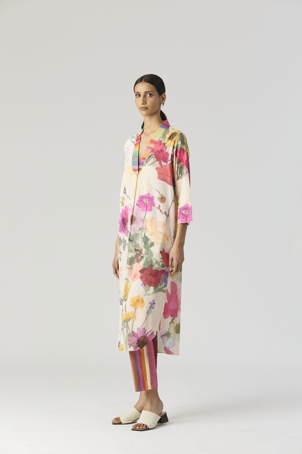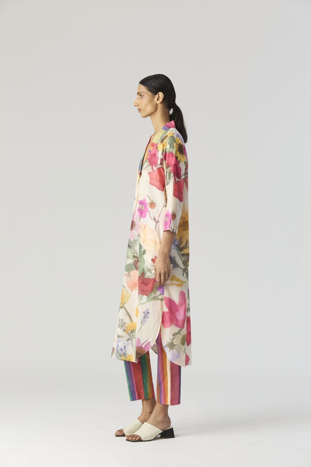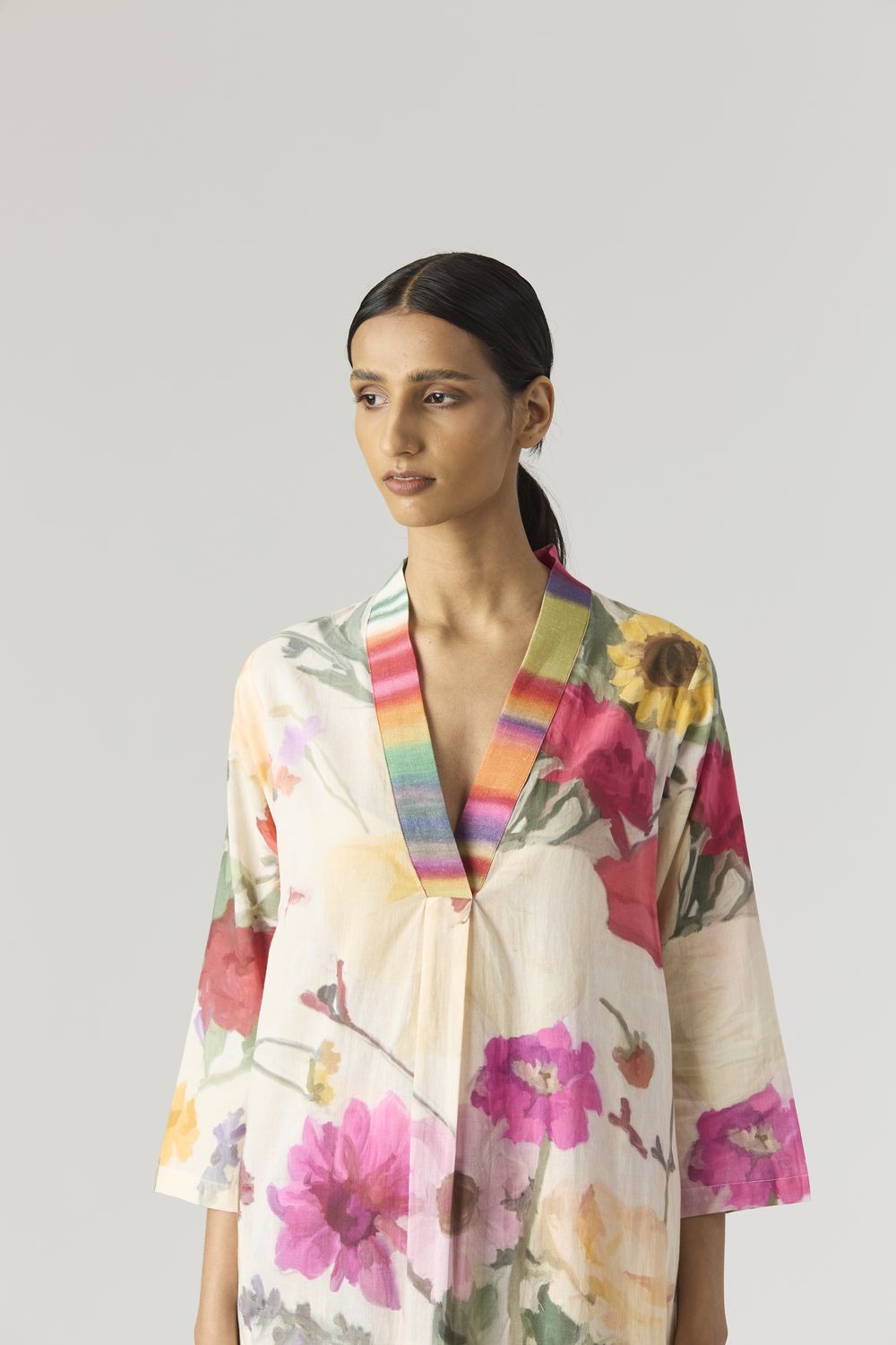 The set is crafted in the Maria print carefully printed on Cotton Cambric. The Kurta has stripes Collar patti detailing on the neckline