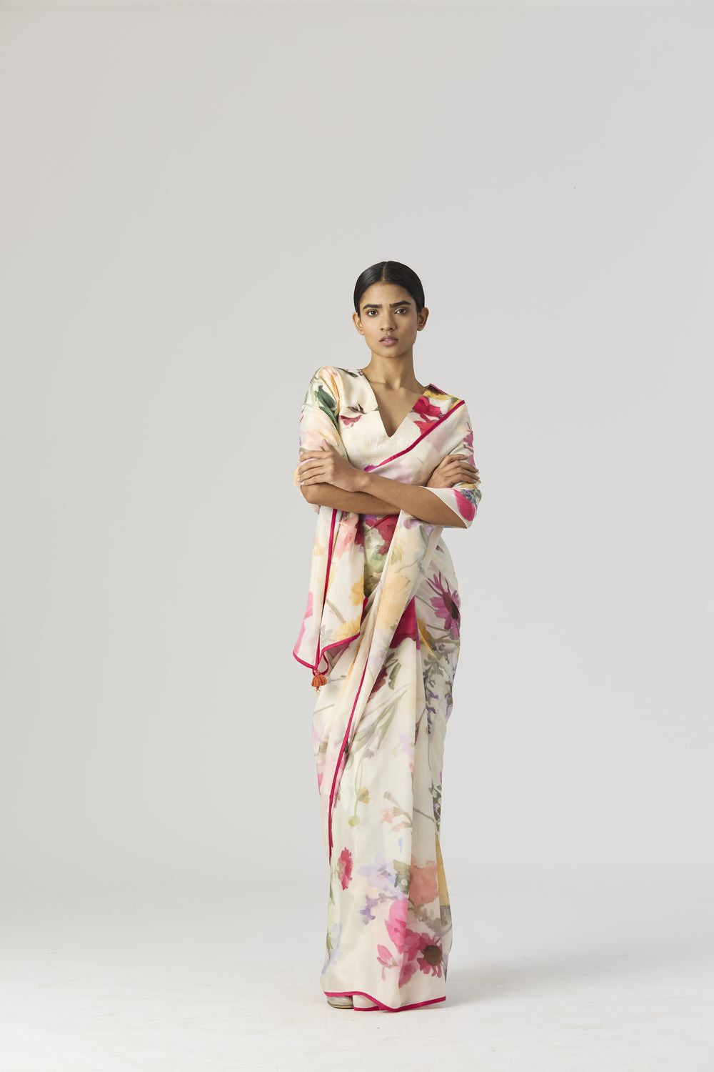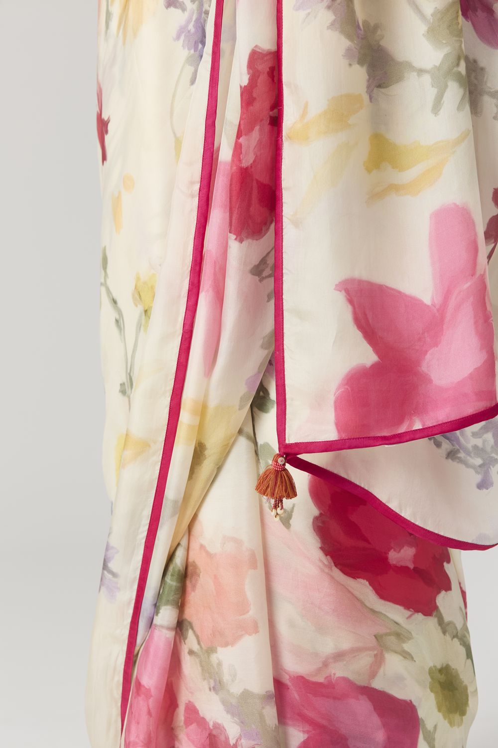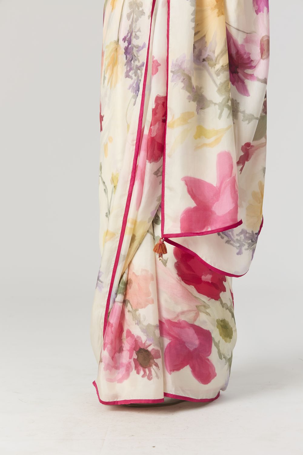 The saree is in pure silk and It is finished with a delicate satin piping of pink color all around with a tassel bunch on the pallu.