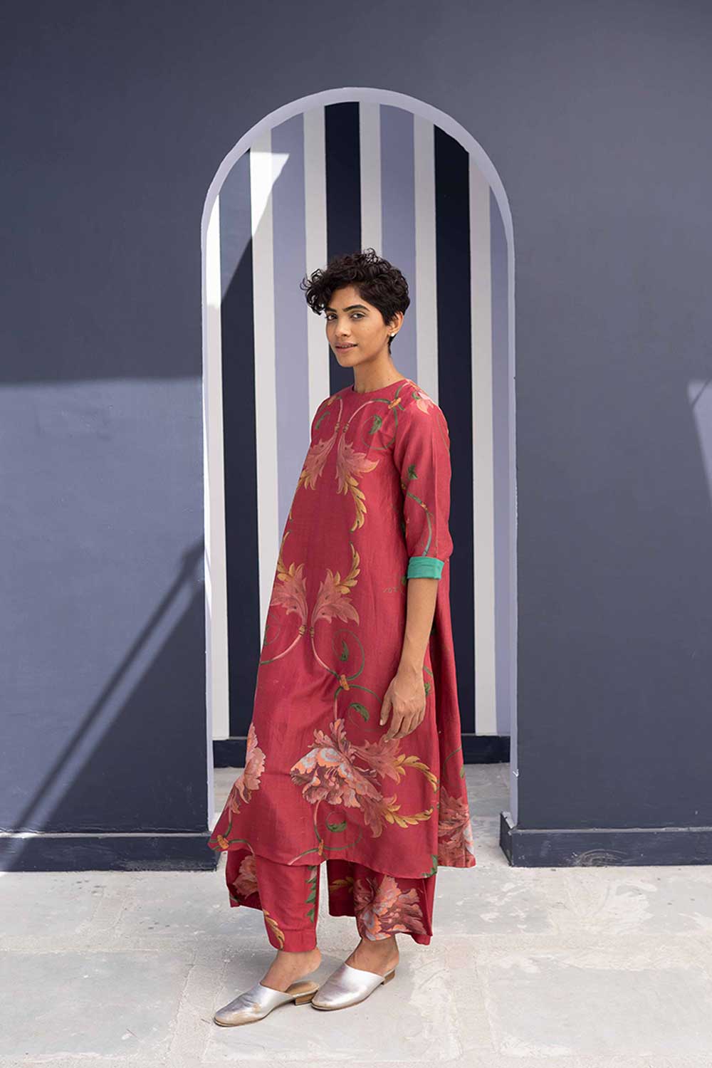 The kurta has a high slit from under the bust and a classic U neck. The pants are flared.