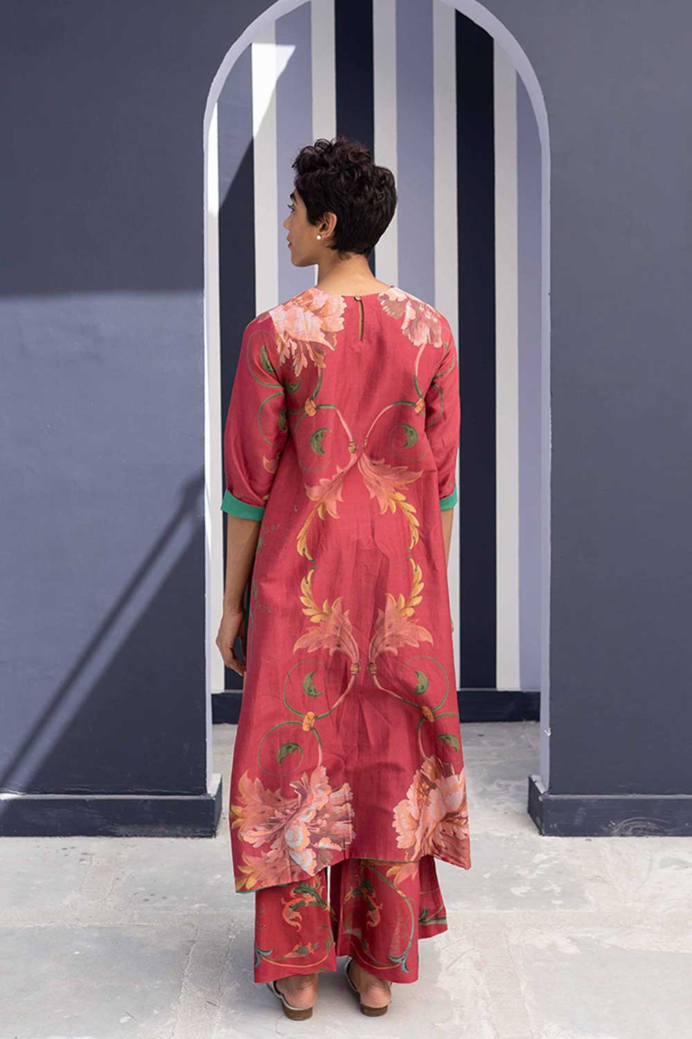 Rani Rose Silk chanderi set features an unusual placement of florals on a branch in a rani pink base. The kurta is lined with a contrasting royal emerald green visible whne sleeves are folded .