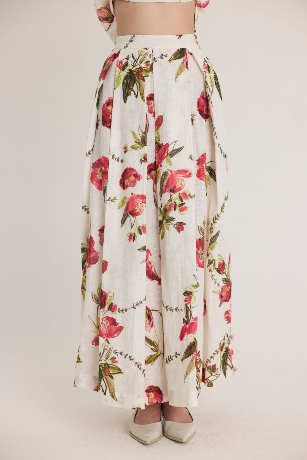 This co-ord set is a celebration of classic florals with a contemporary twist. The intricate print features vibrant red blooms interspersed with delicate green foliage, all set against a soft ivory canvas. The design evokes a sense of vintage charm while maintaining a fresh, modern appeal.
