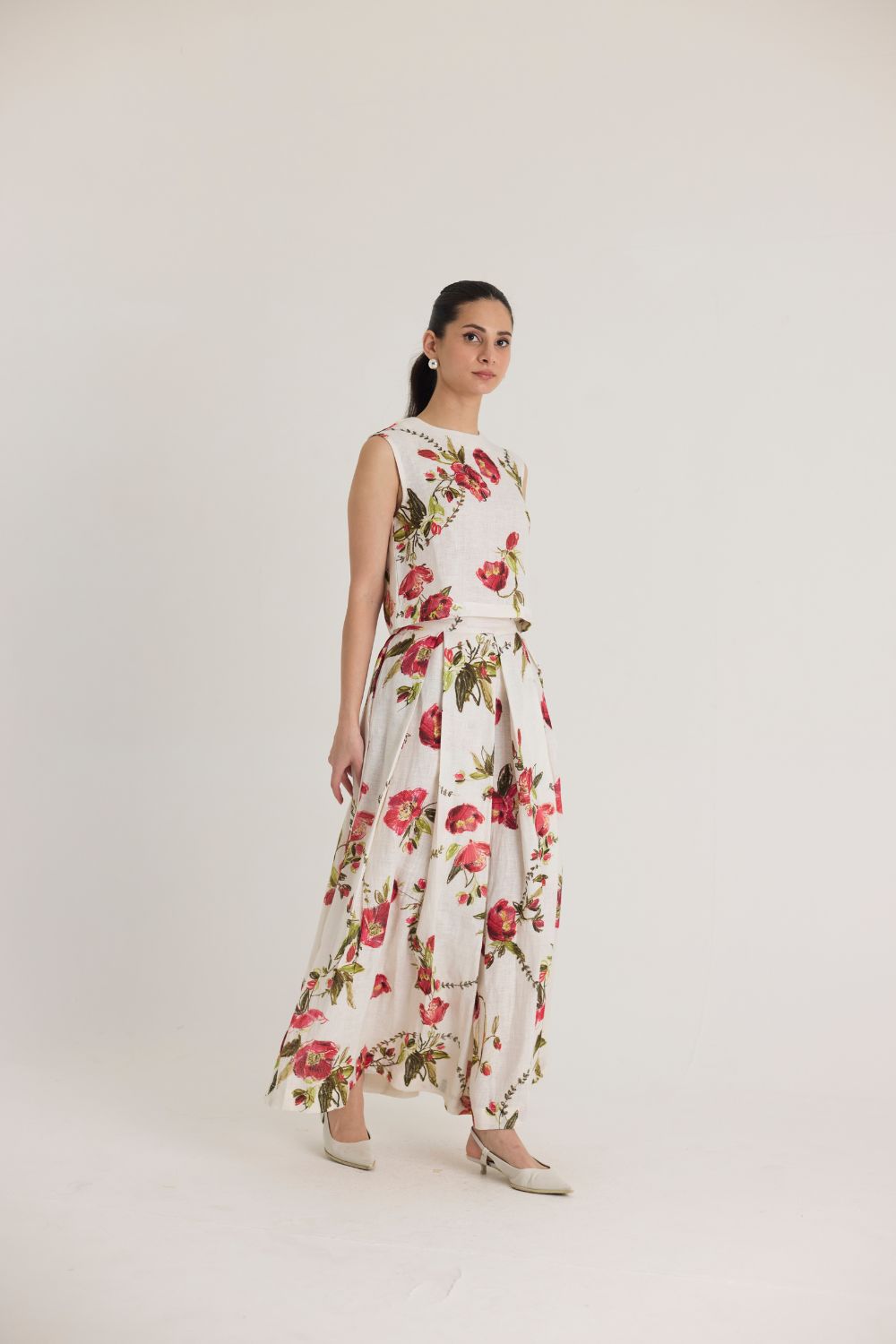 A breezy and elegant co-ord set features a sleeveless crop top and a flowing maxi skirt, adorned with a delicate floral print on a soft ivory base. Perfect for summer outings, vacations, or day events, this ensemble combines effortless style with comfort.