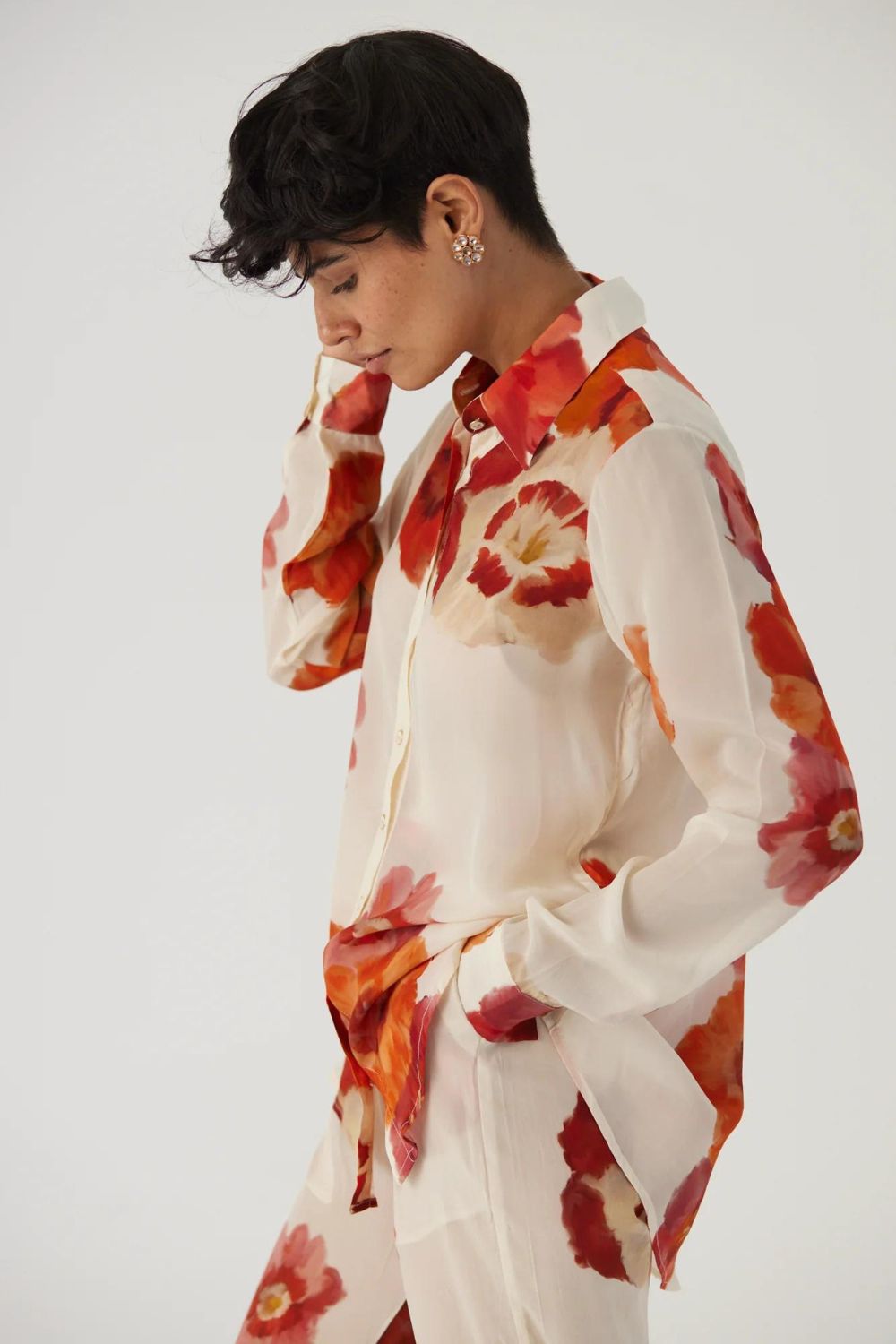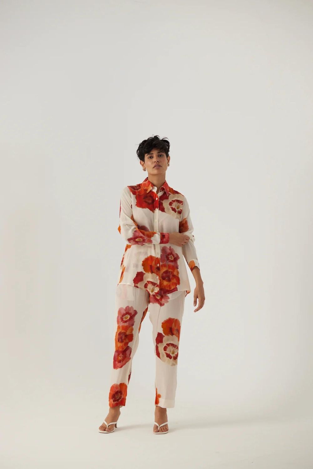 This print of the set is crafted in white colour with shades of massive poppies carefully printed on Crepe. This set is crafted in the Valentine print carefully printed on crepe featuring a set of shirt and pants.