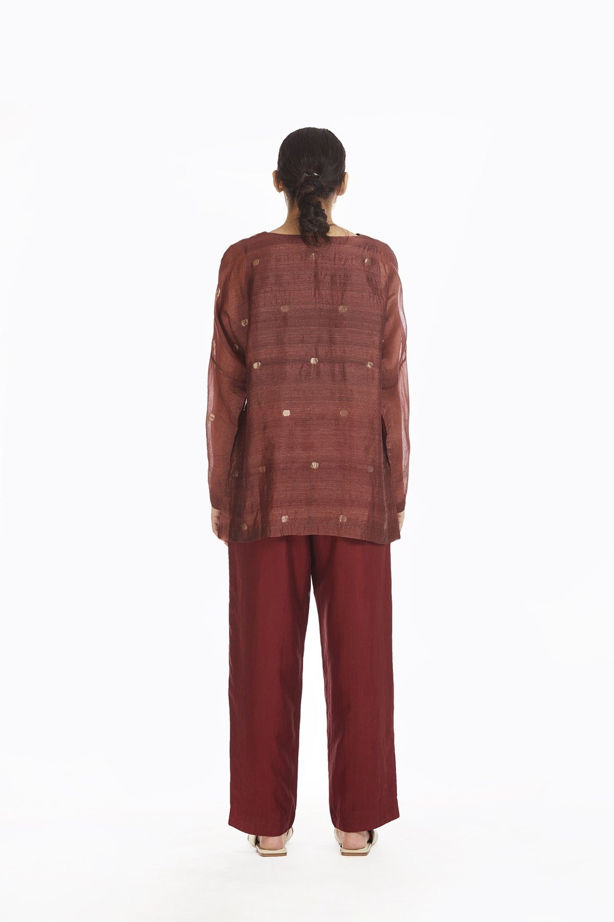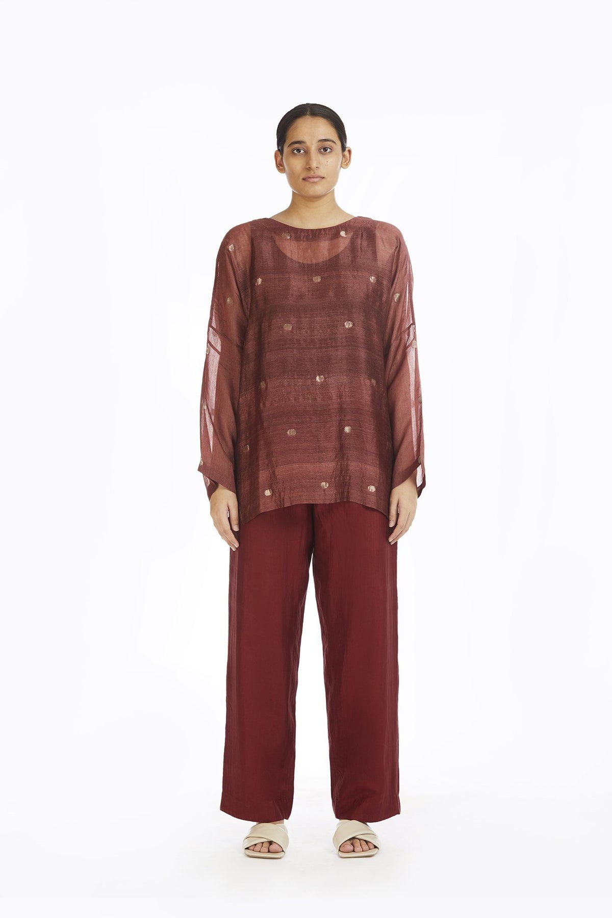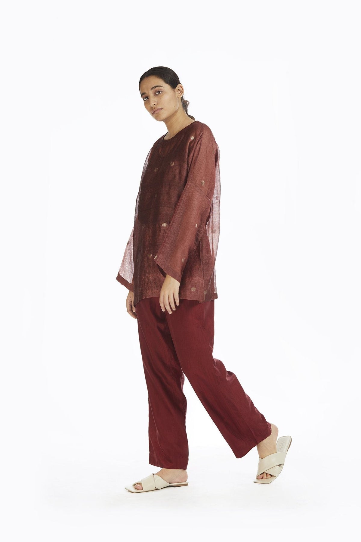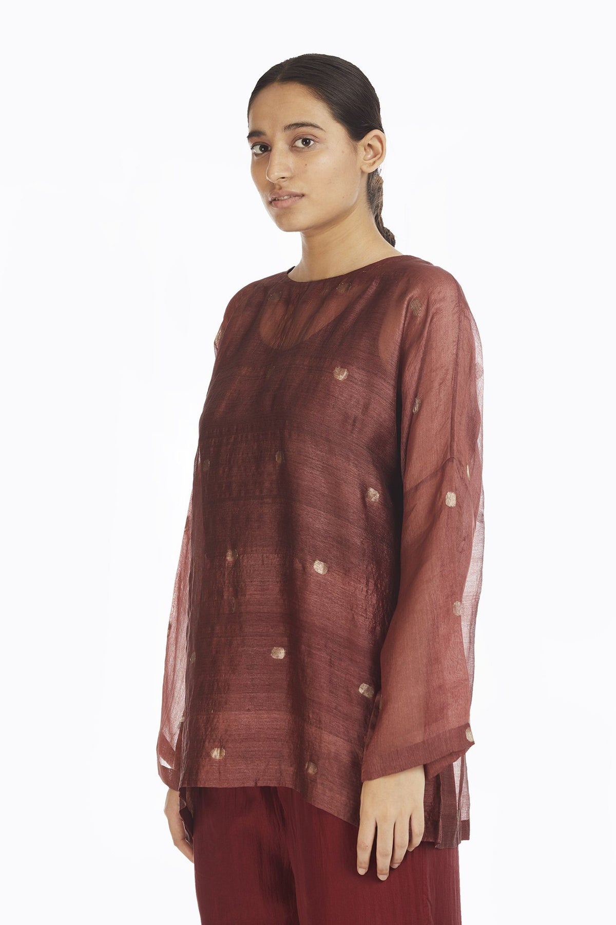 Handwoven in Silk and Zari , this engineered top makes for a luxurious and comfortable wear. A wardrobe classic this is an innovative smart mix of two different kinds of silks ; the circle motif and minimal glaze makes it a must have due to the optical appeal. An akaaro bestseller the fabric is designed by AKAARO and hand woven using Jaamdani technique in West Bengal , India.