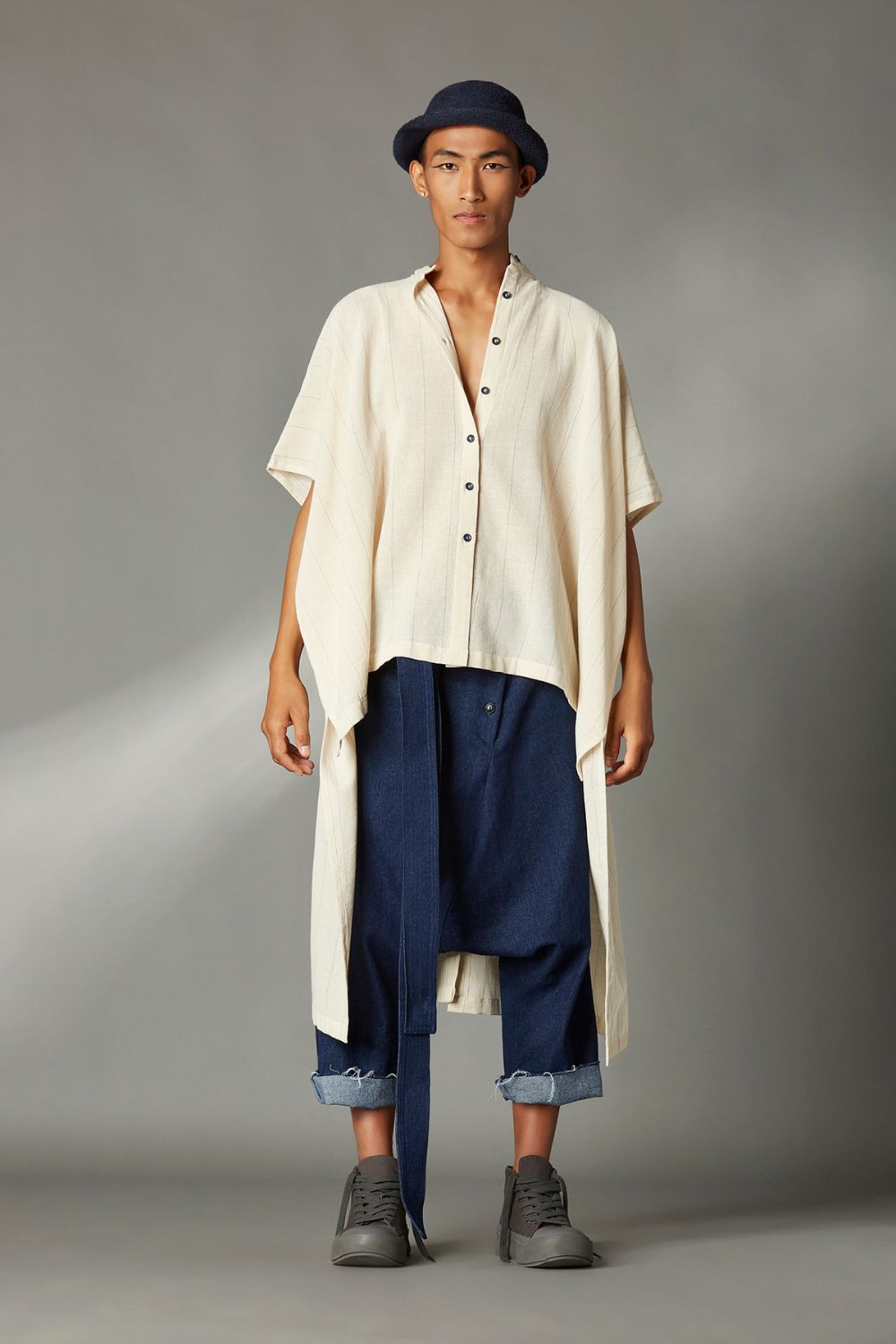 LONG LOW CROTCH DIAGONAL TROUSERS WITH SIDE PLEATS, FRONT BUTTON FLY AND A BELT