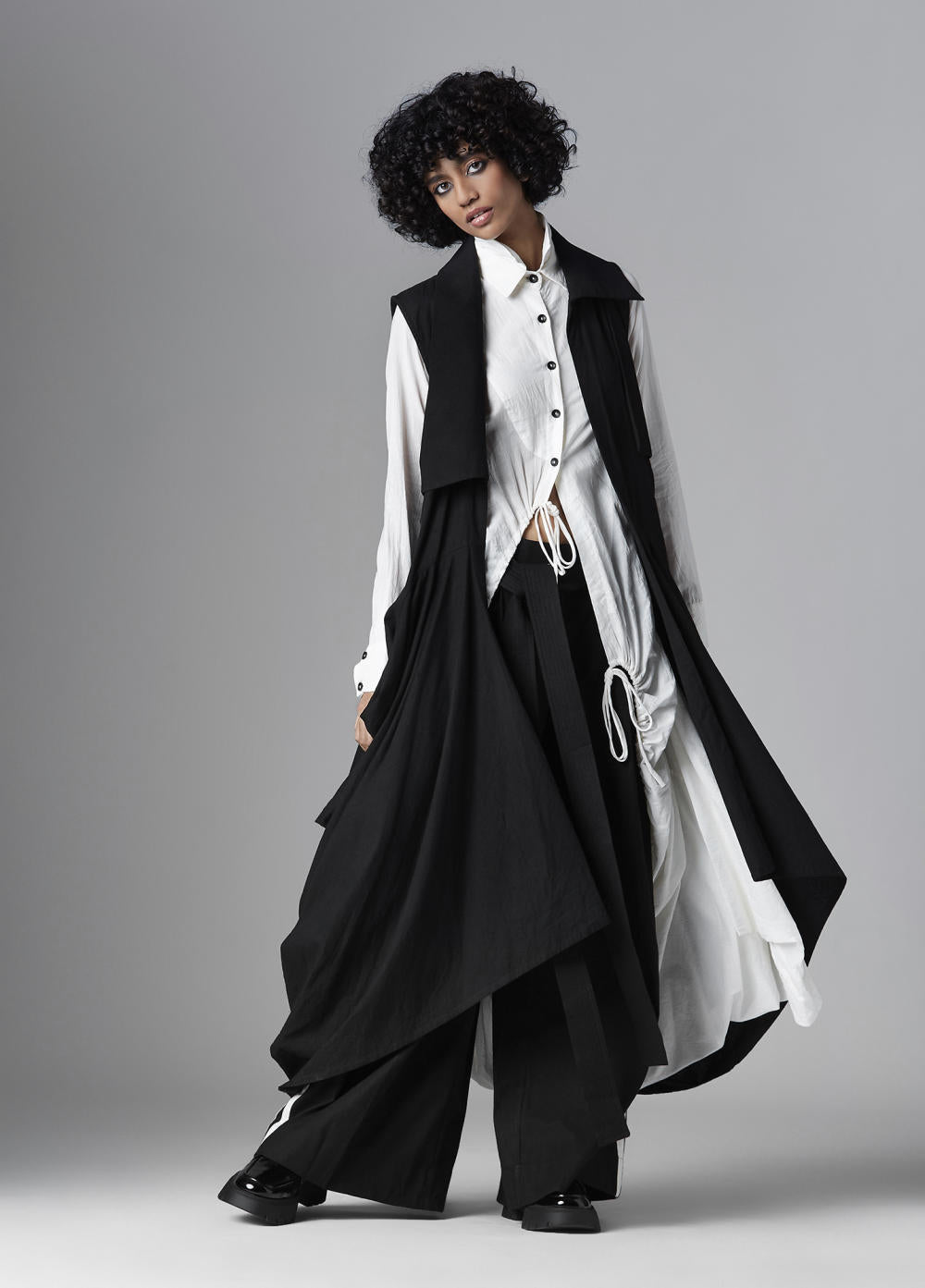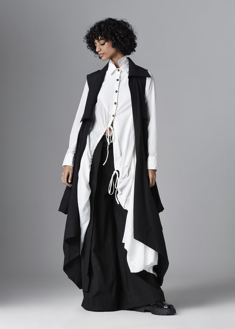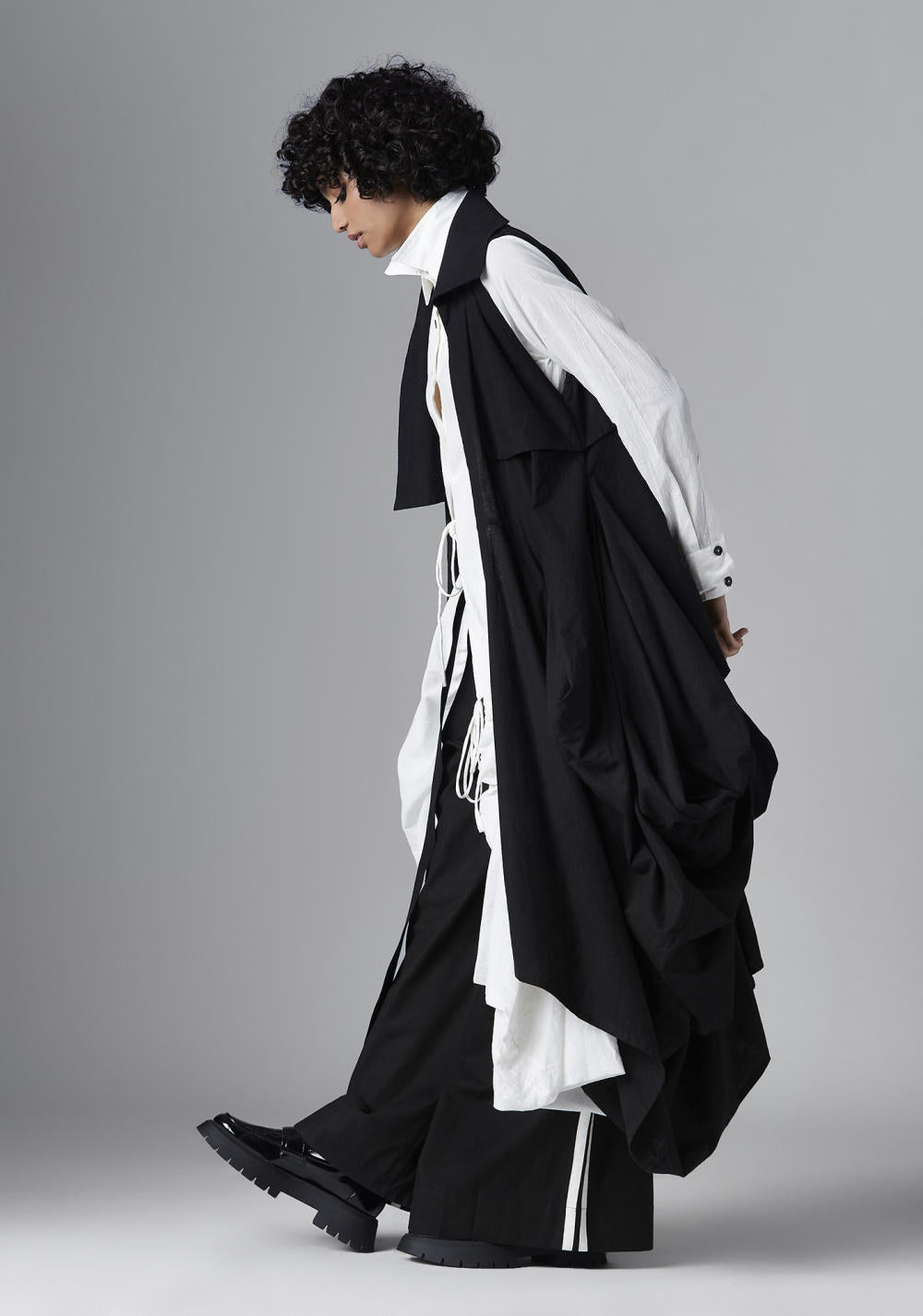 Chola’s universe begins with thoughtful materials. Recycled cottons, post-consumer fabrics, and free-cutting techniques come together in a kind of mindful choreography—one that honours form without creating waste, and prioritises movement over rigidity. This is clothing that feels lived-in yet architectural; pared-back yet quietly avant-garde.