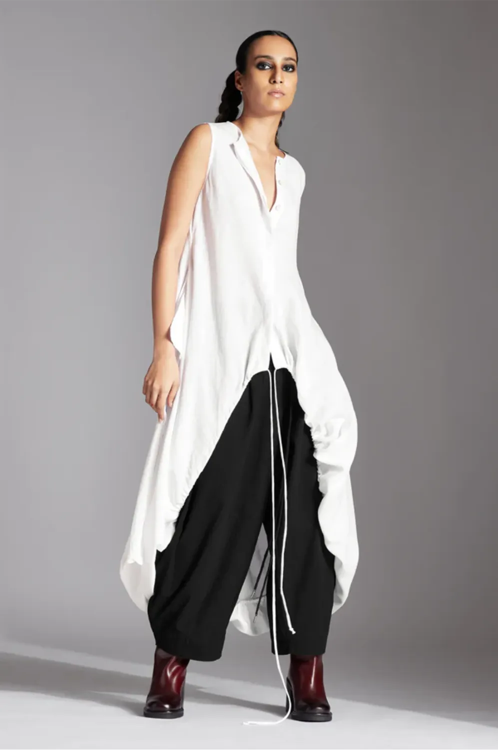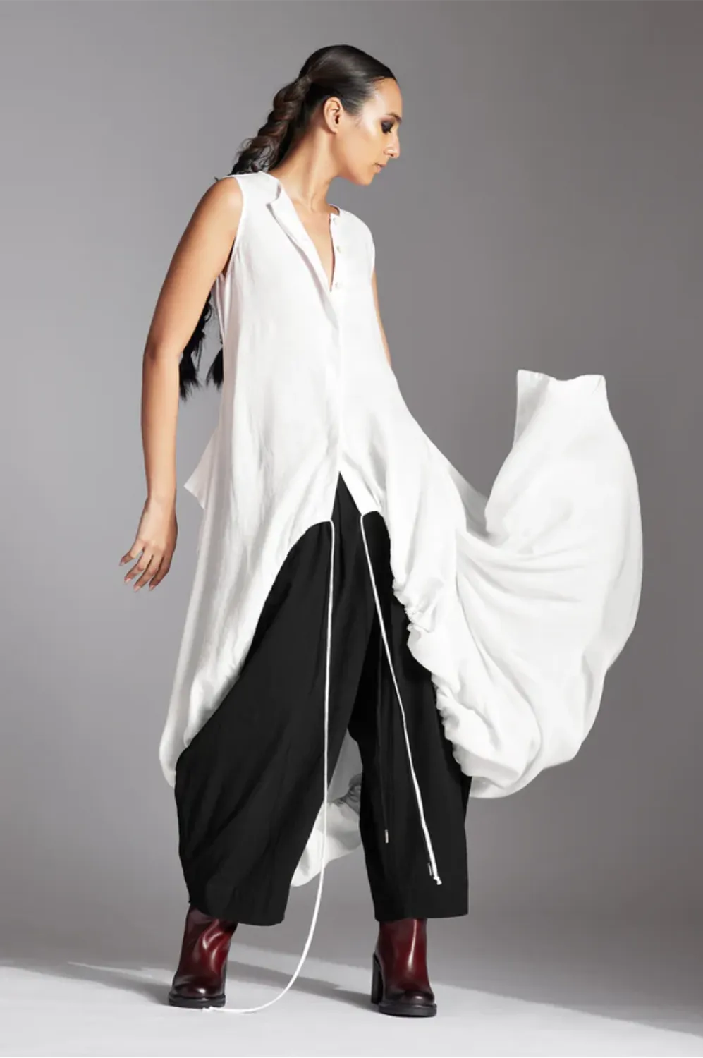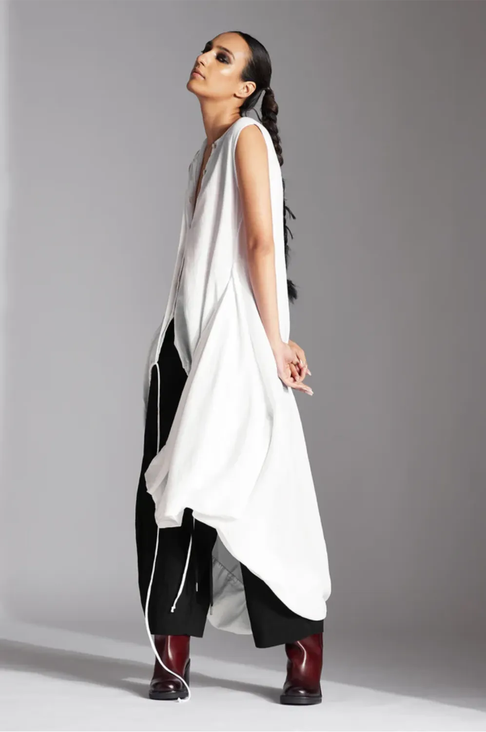 The Tia shirt exhibits a high-low style and features a round neck with invisible front button placket and drawstring at the hem.