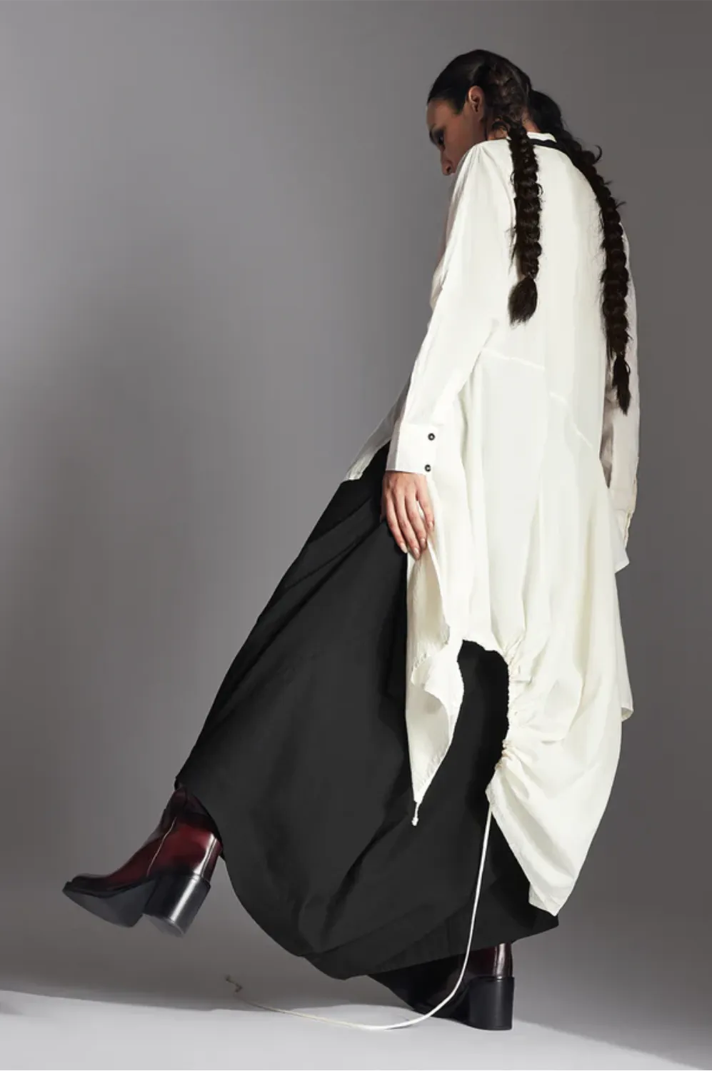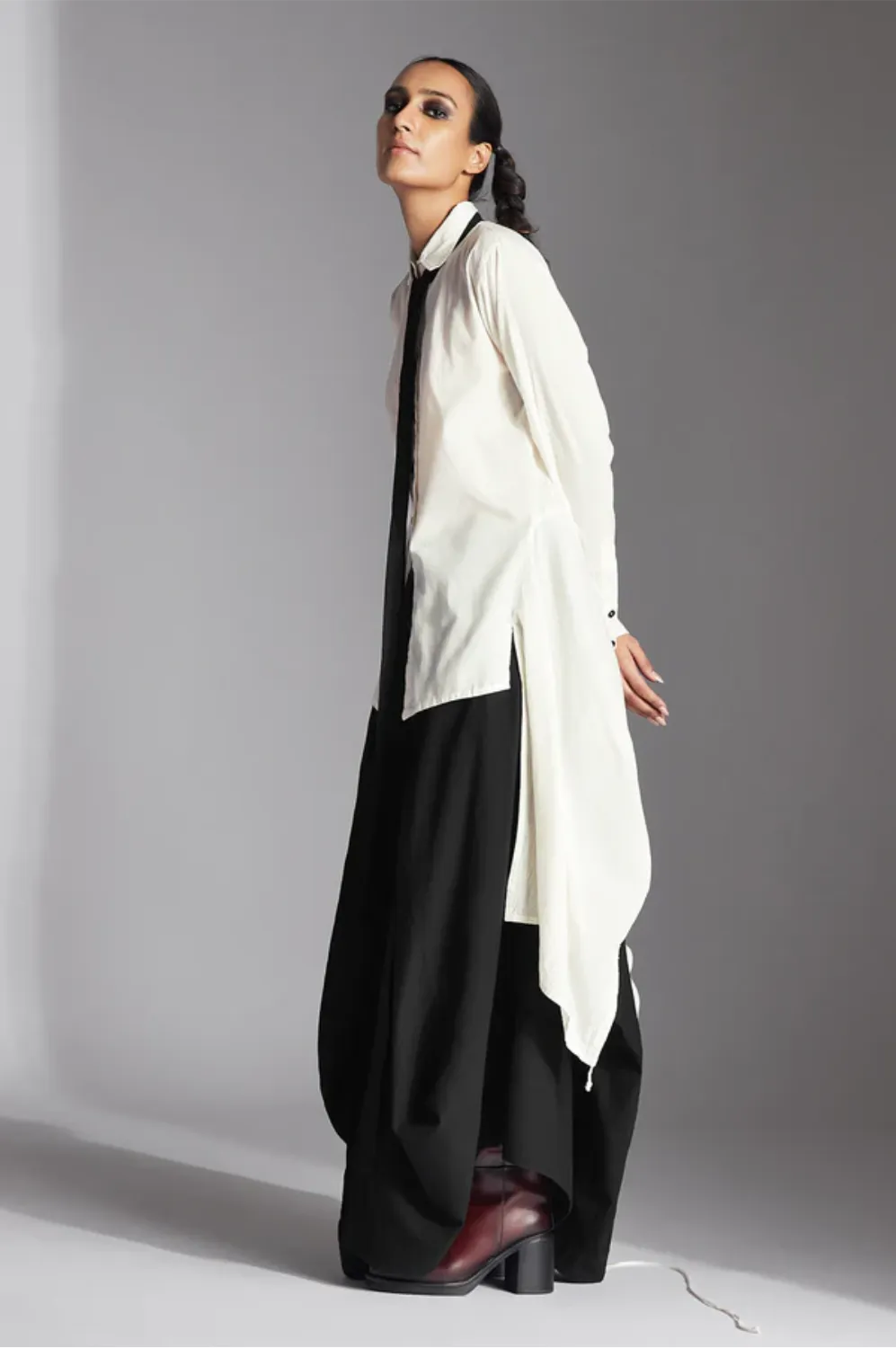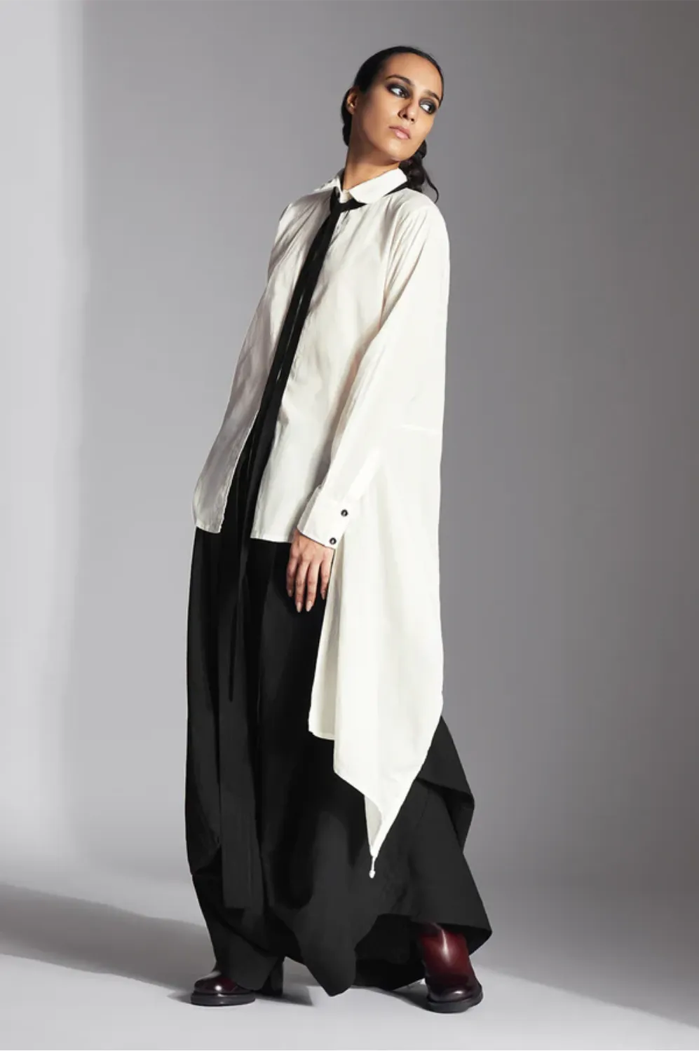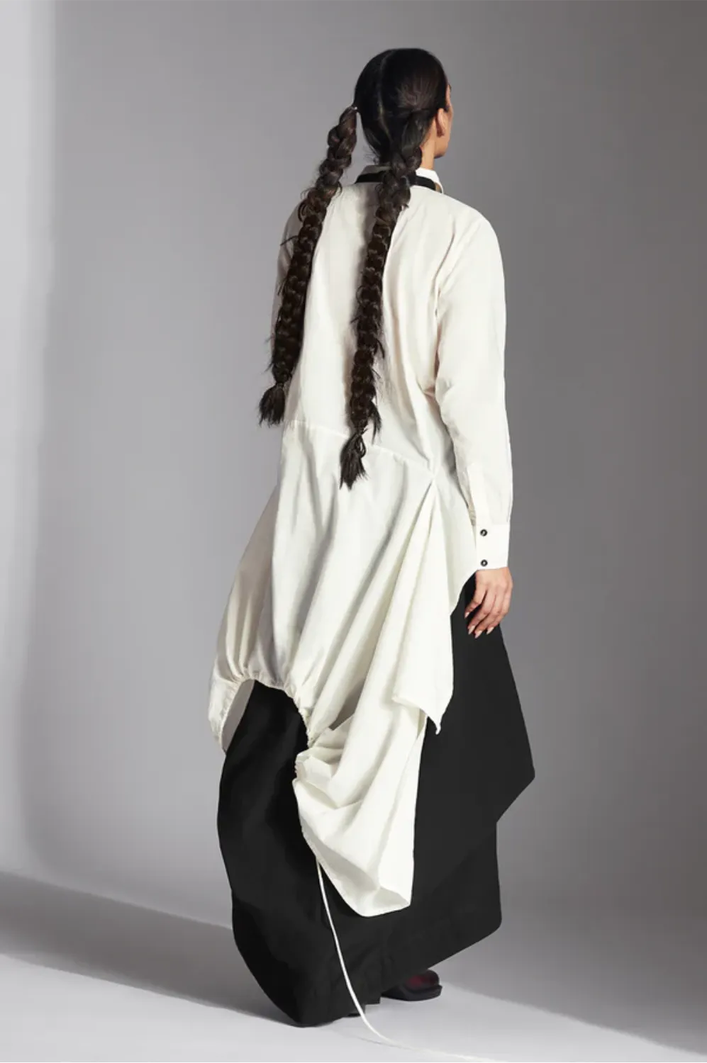 The Alin shirt features a shirt collar, narrow full sleeves and back hanging panel with drawstring at the hem. Additionally, it features a detachable contrasting tie at the neck.