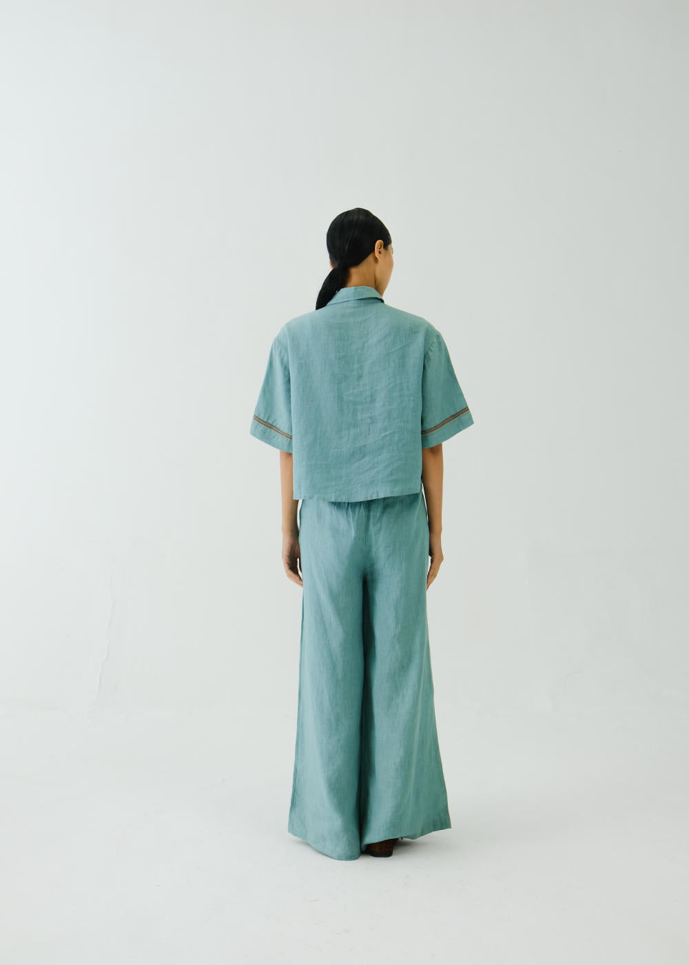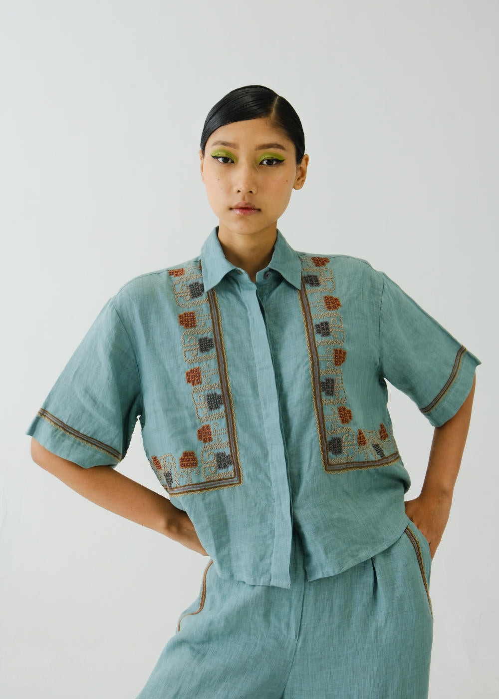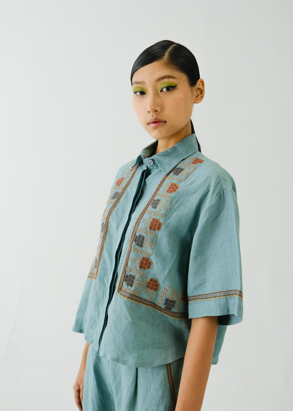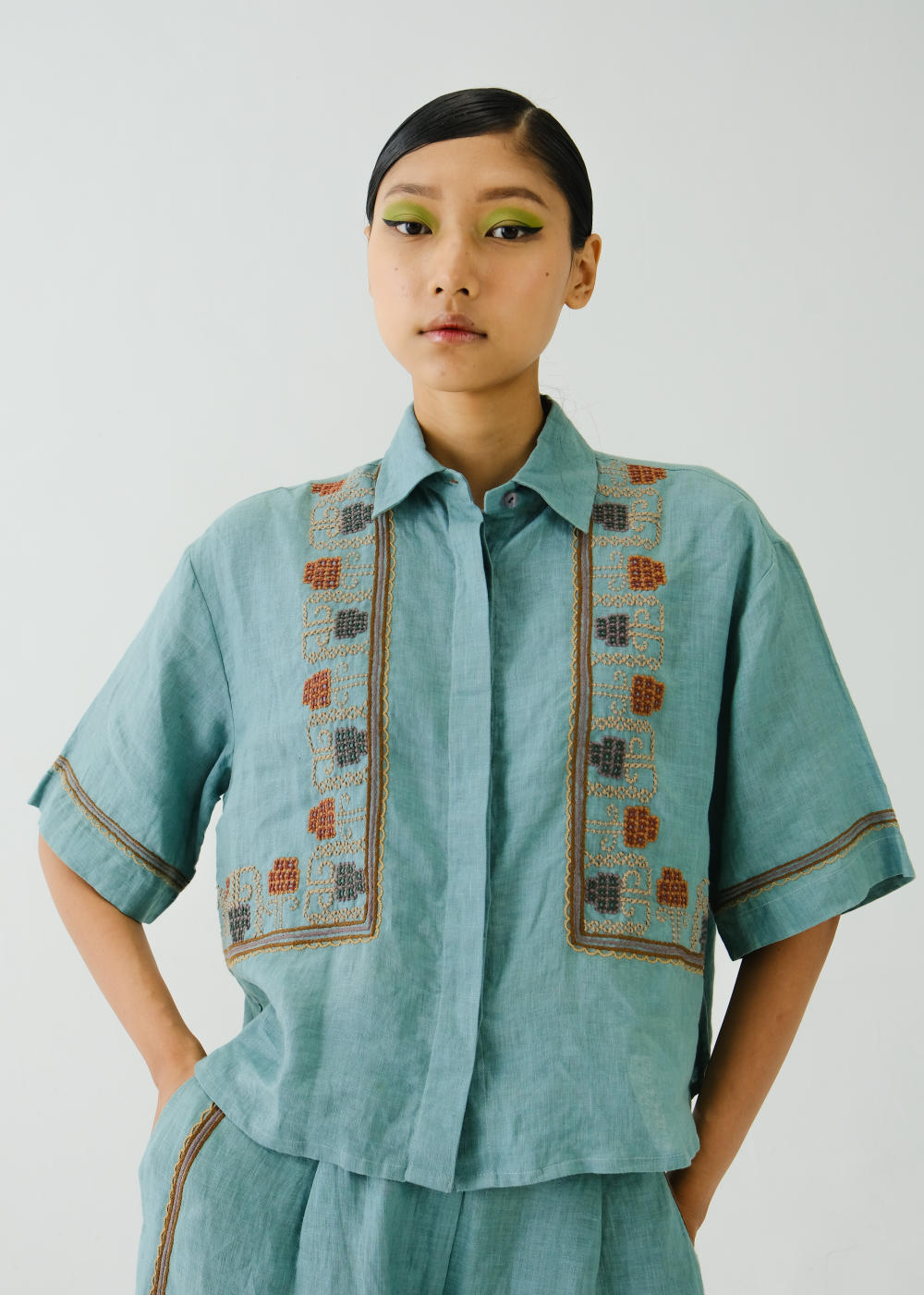 Crafted with meticulous attention to detail, this Ava shirt is sure to become your go-to choice this season. Embrace the charm of our Cross stitch emb. Pale Blue print. Each stitch tells a story, adding a touch of artisanal flair to your wardrobe. Fabric : Linen