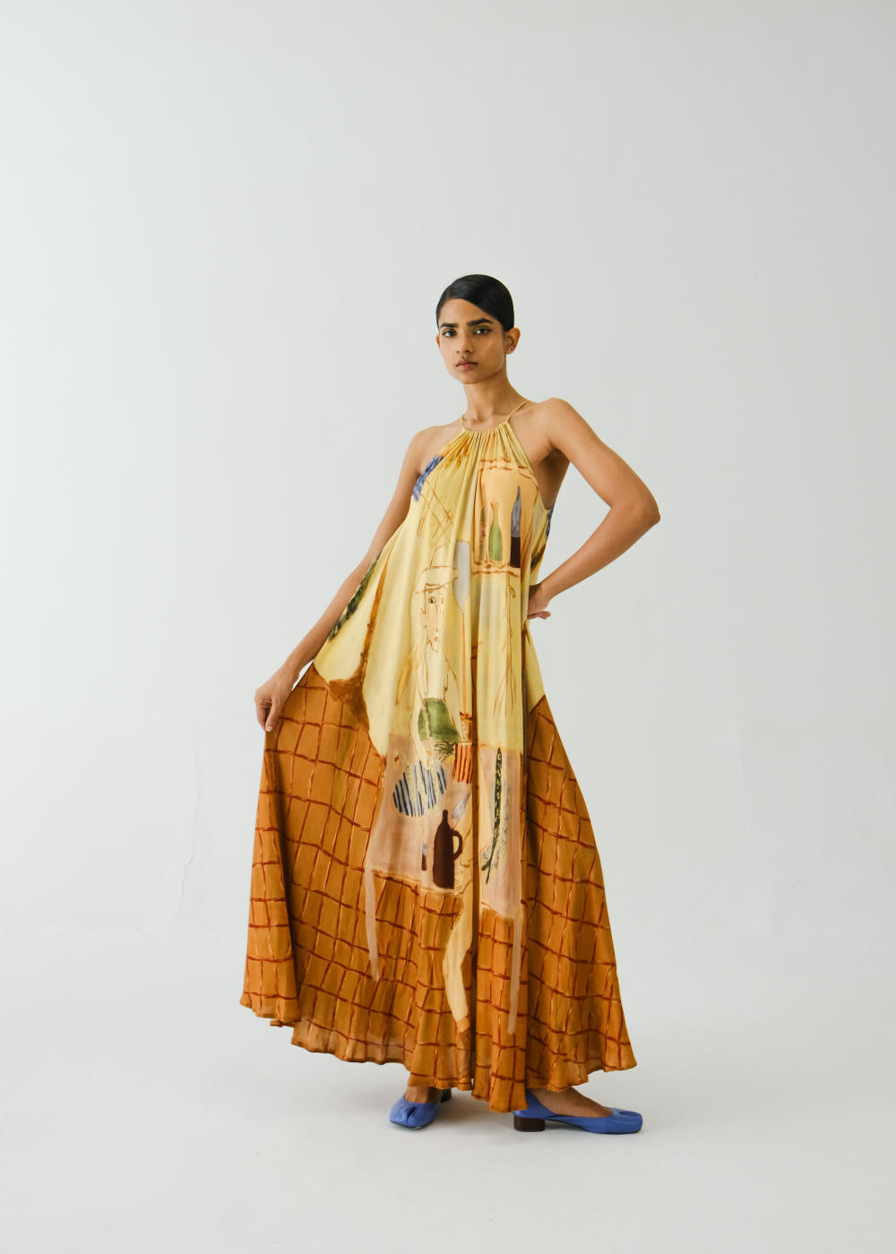A flowy Dress crafted with careful attention to detail, the adjustable drawstring neckline allows for a customizable fit, ensuring comfort and style tailored to your preference. Its ankle length strikes the perfect balance between chic and practicality, while the sleeveless design provides freedom of movement and breathability