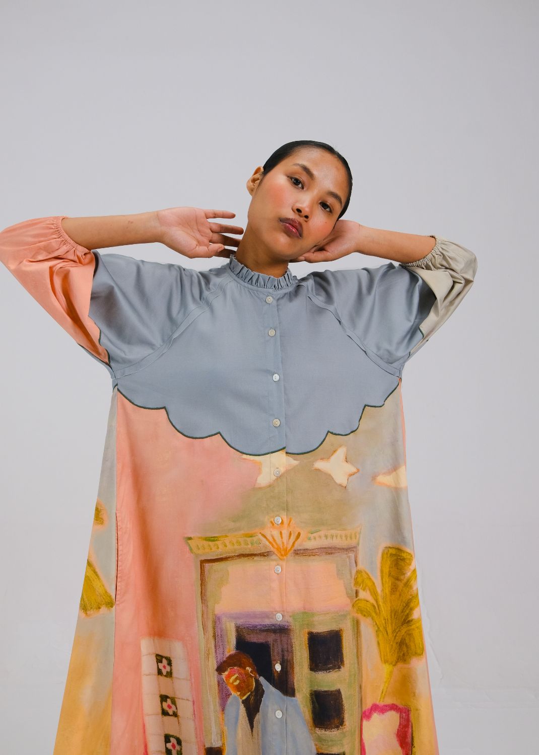The Deuce Dress in Morning Coffee is shaped in a relaxed silhouette that blends comfort with considered detail. Featuring soft raglan sleeves in a three-quarter length, it carries an effortless drape and ease of movement. Scalloped color blocking and a gently ruffled collar add a subtle, artful finish — expressive yet refined, and thoughtfully designed for everyday elegance.