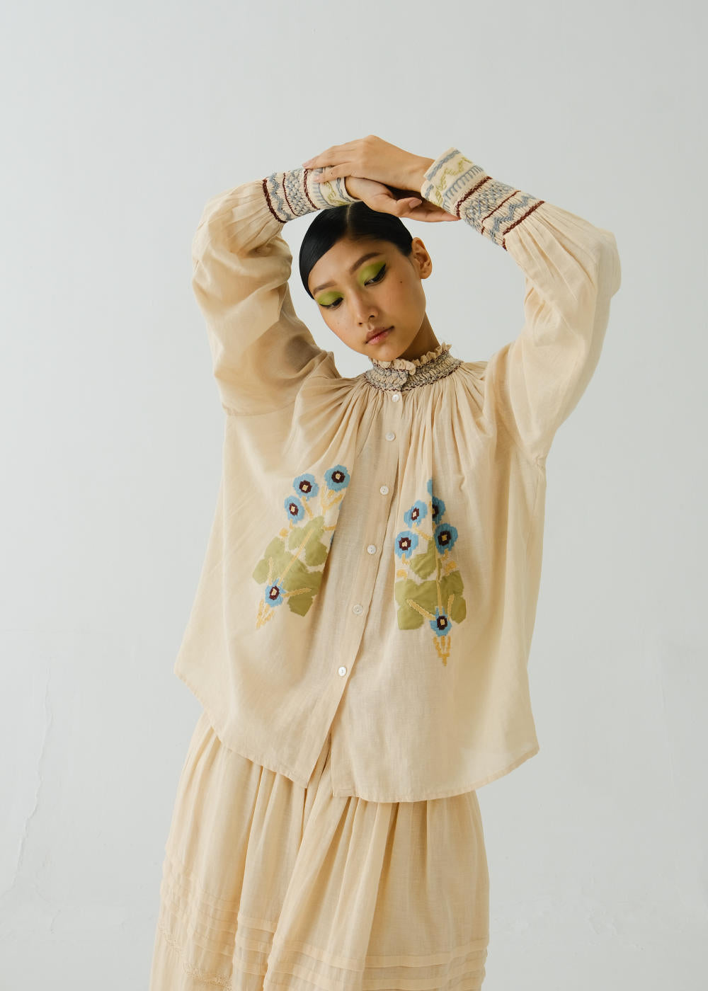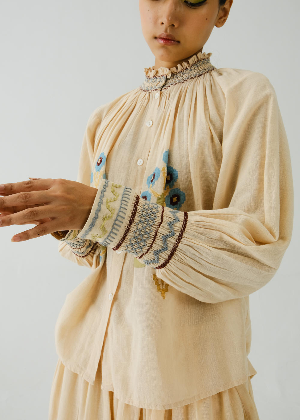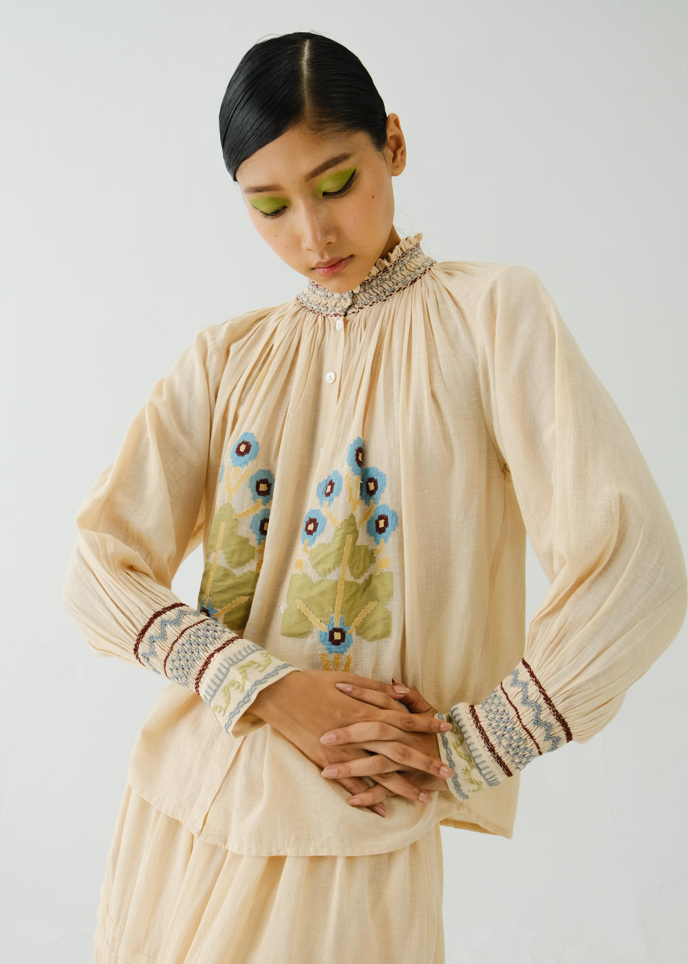 The Farmer Top is made from 100% pure cotton fabric in Ivory Pixel Applique. It features hand-smocking details on the neck and the bishop sleeves along with front button details. Fabric : Cotton