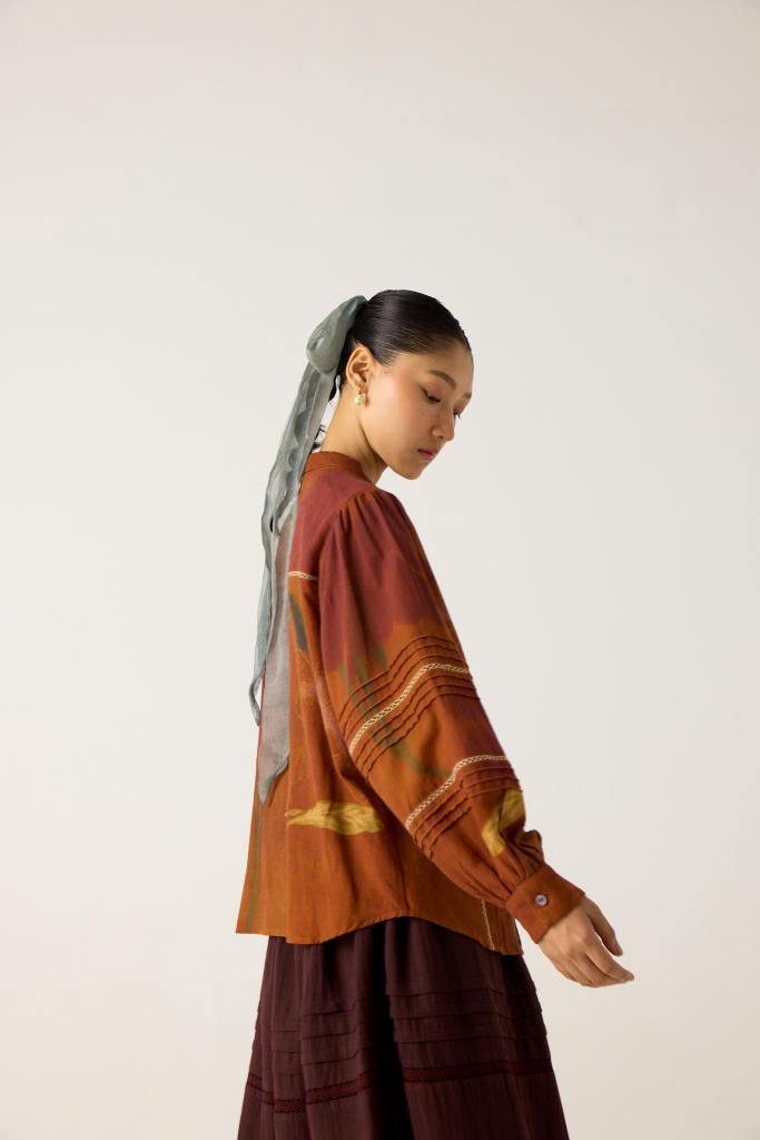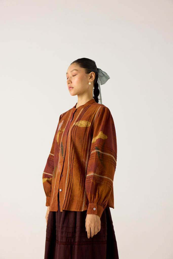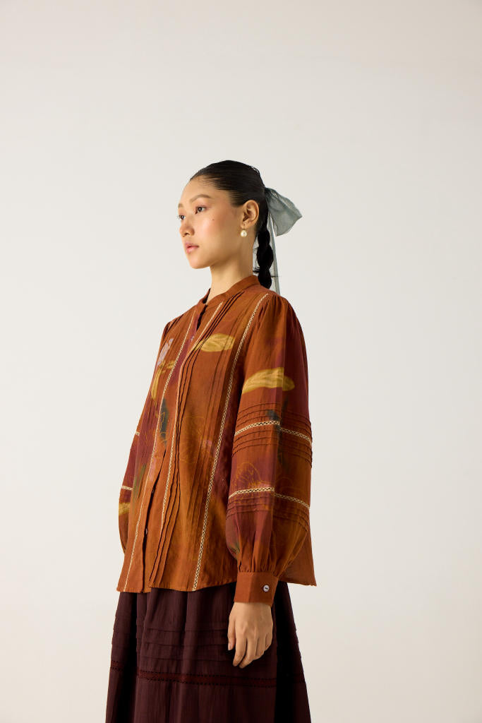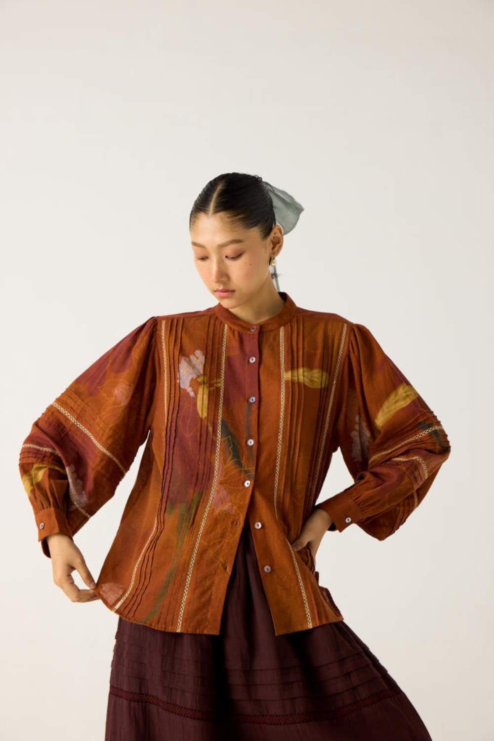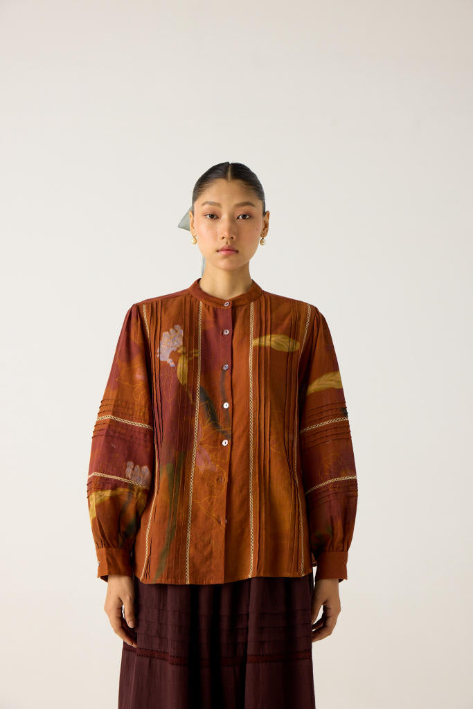 The Hazel top is made from cotton in our foliage print. it features a front button fastening, band collar, bishop full sleeves, contrast lace inserts on the yoke, and sleeves. perfect staple to mix and match.
