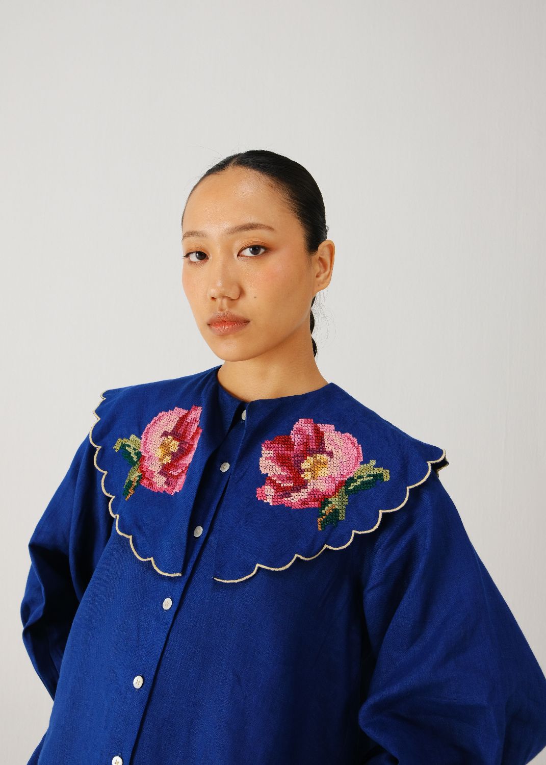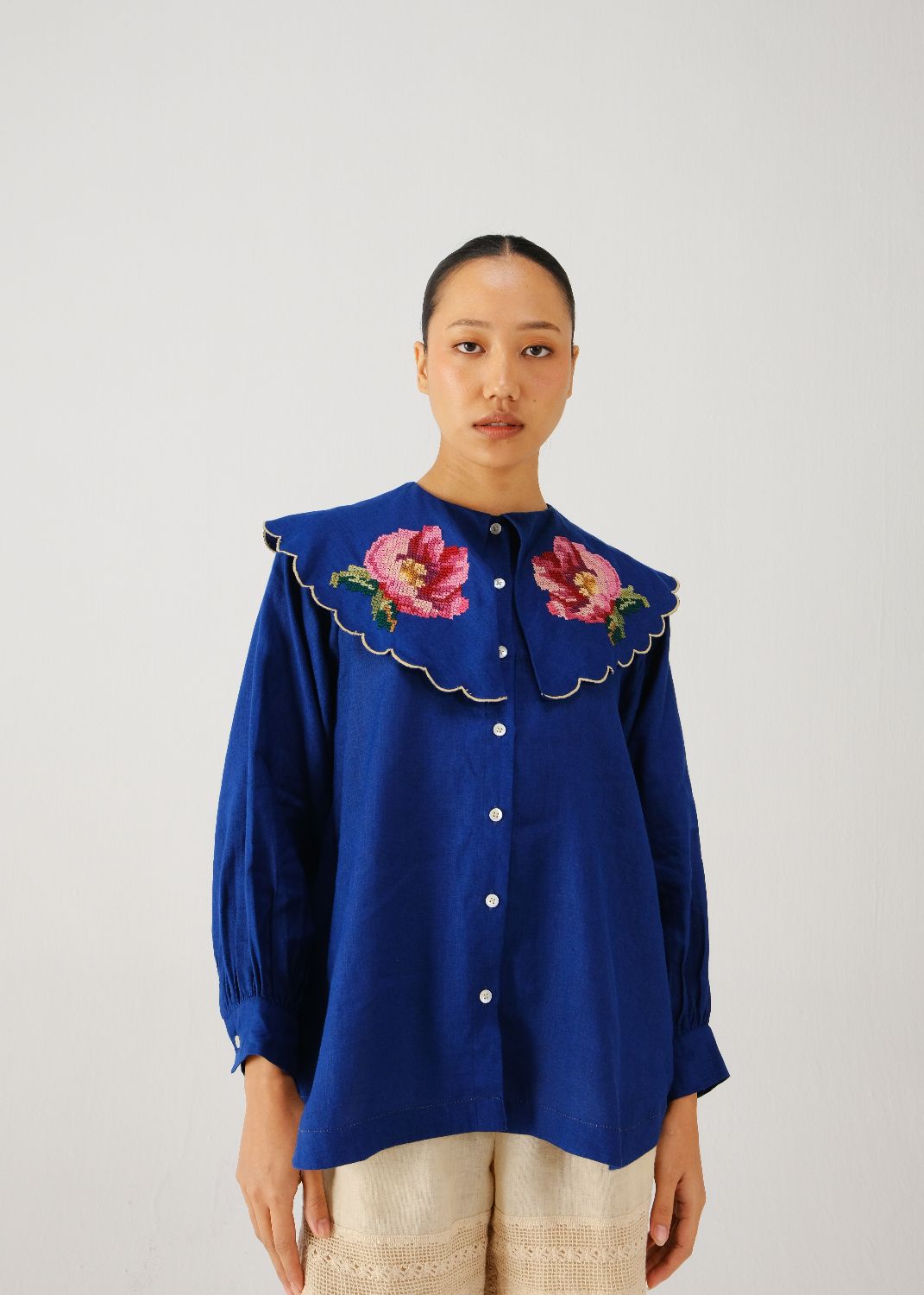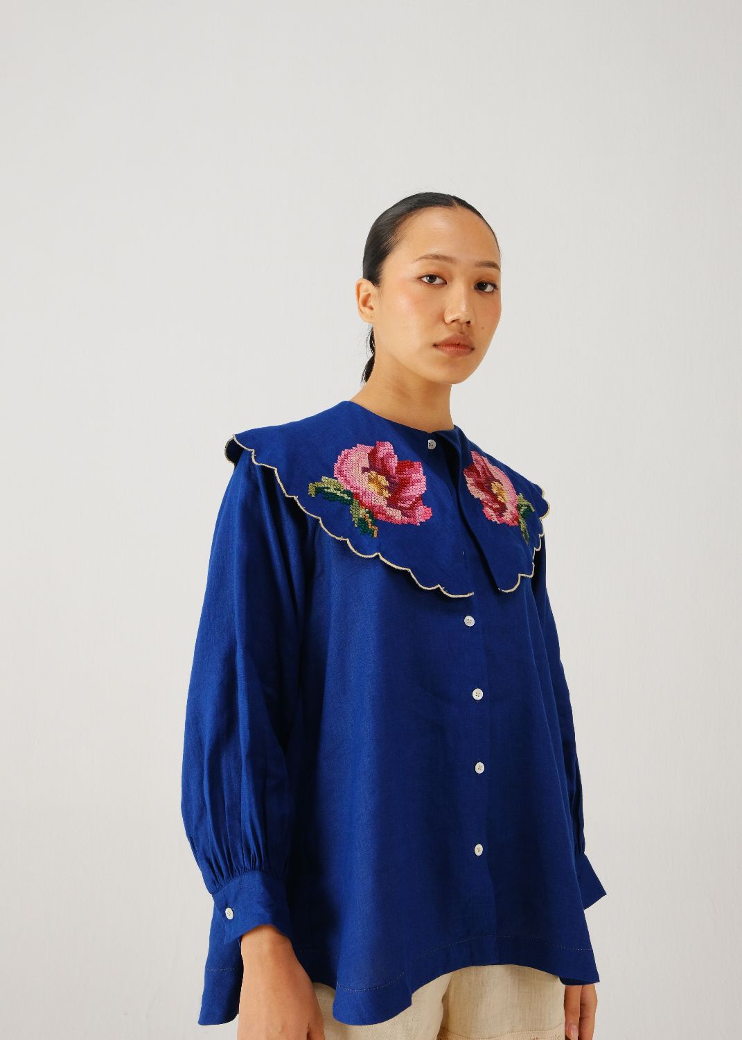 The Julia Top is a shirt made in linen with a Peter Pan collar. The collar has contrast scallop edging. The shirt has full sleeves with buttoned cuffs and a button-down front. A cross-stitch rose is hand-embroidered on the collar, adding a detail to the design.