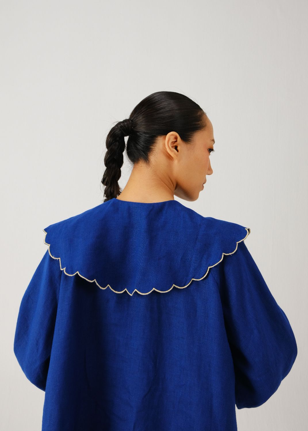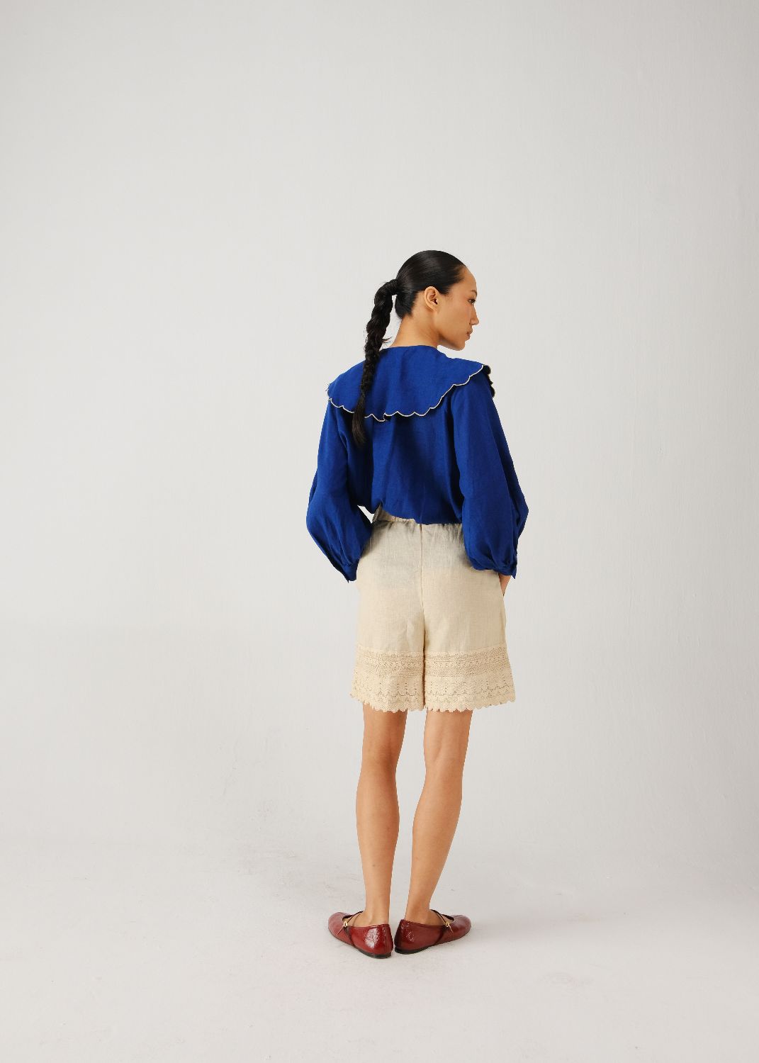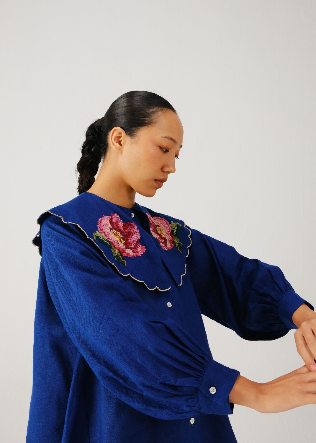 The Julia Top is a shirt made in linen with a Peter Pan collar. The collar has contrast scallop edging. The shirt has full sleeves with buttoned cuffs and a button-down front. A cross-stitch rose is hand-embroidered on the collar, adding a detail to the design.