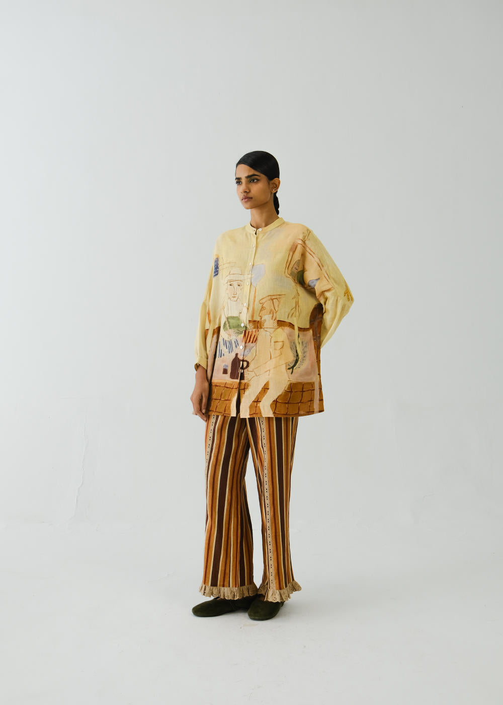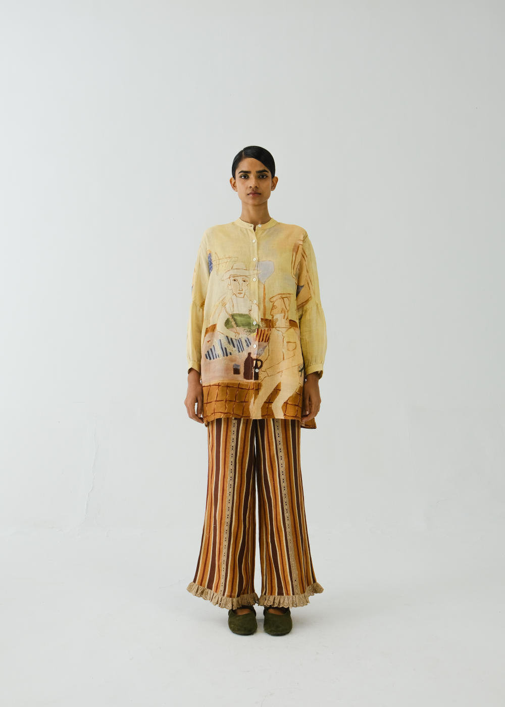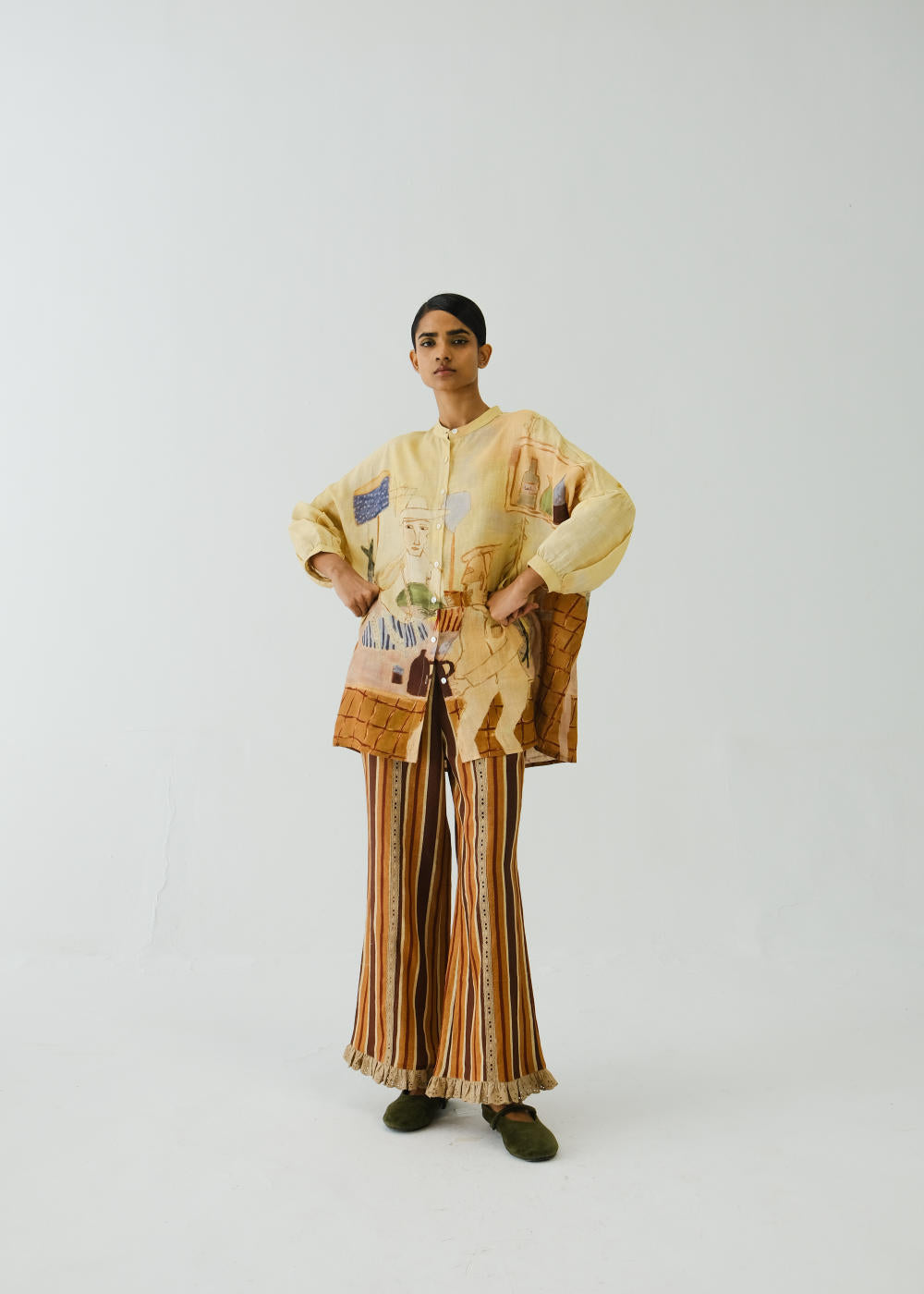 The Mia set is a two-piece set that includes the Mia shirt along with pants. Both are made from Linen in our Fisherman print and Striper Pant. The Mia shirt is a button-down shirt with a band collar. The Ruffled Pants are designed in a relaxed, comfortable fit with lace inserts running down the front for added detail. Soft ruffles along the hem give it a subtle, feminine edge — an easy pick for casual days or dressed-up looks.