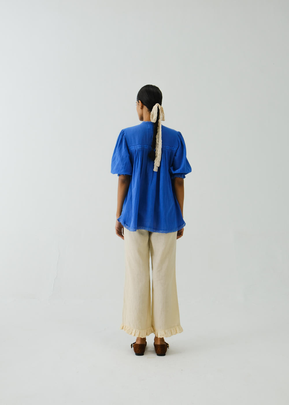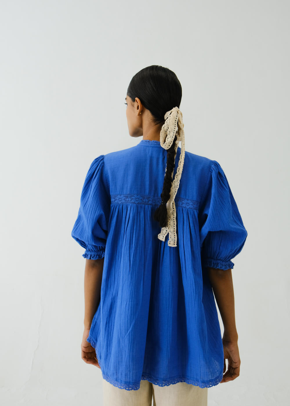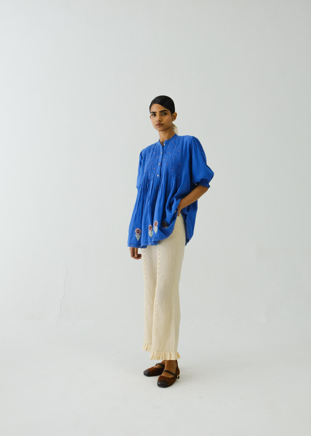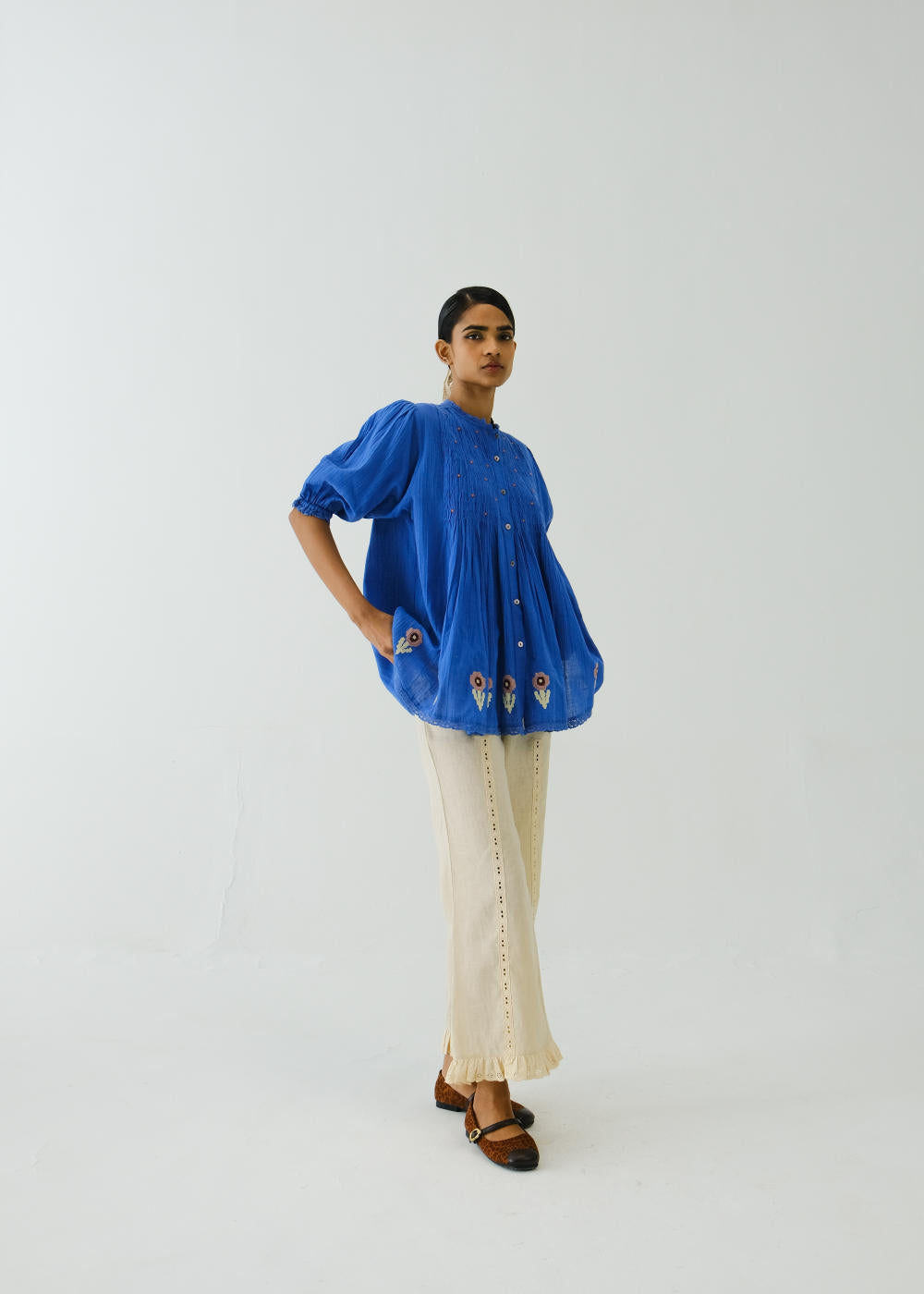 The Nova top is made from cotton in our Electric Blue Flower Applique, a button-down top. It features scallop lace detail on the neck, cuff and hem.
