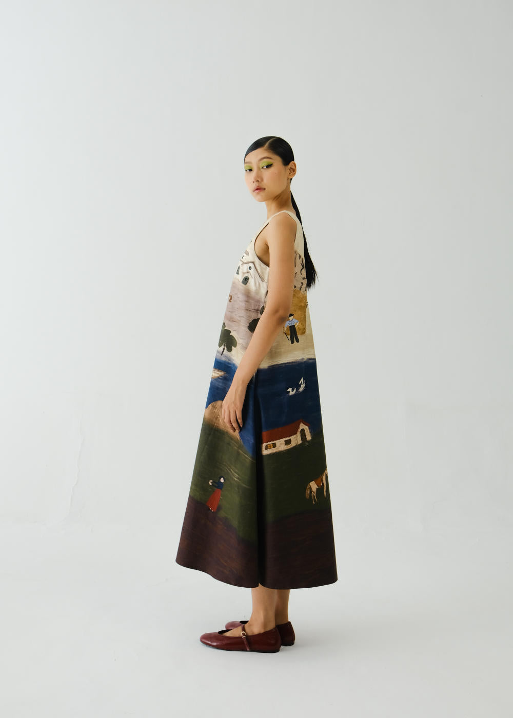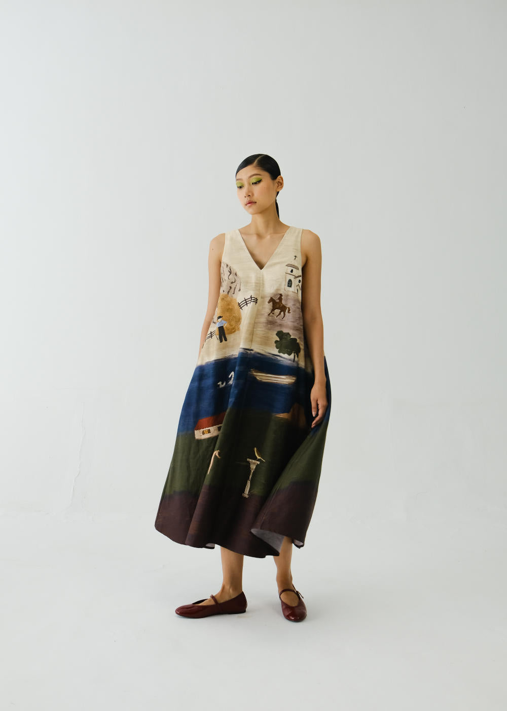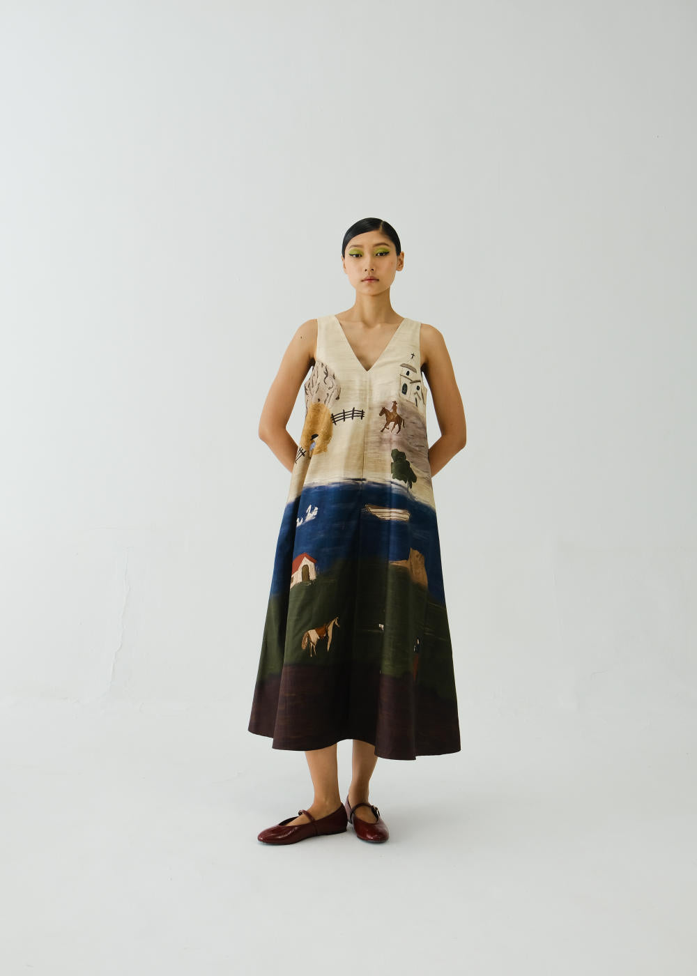 A perfect A-line dress with pockets in the side to give comfort yet an elegant look. Made with breathable cotton satin fabric in our Village print. Fabric : Cotton Satin
