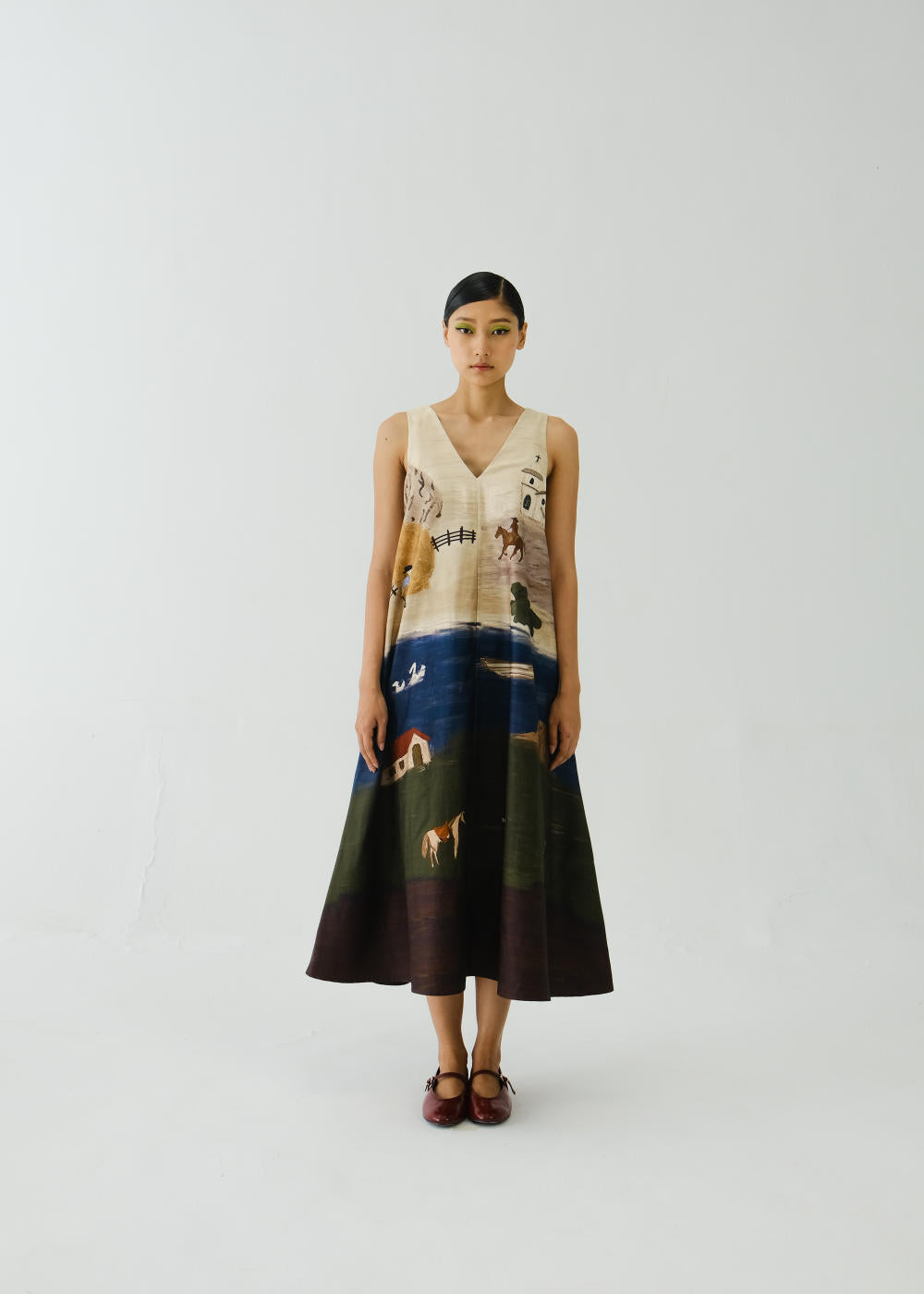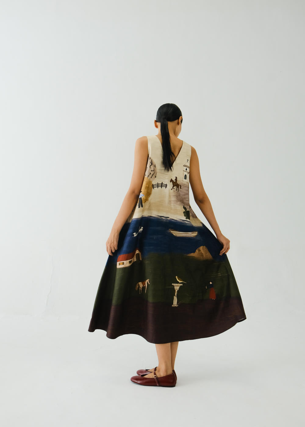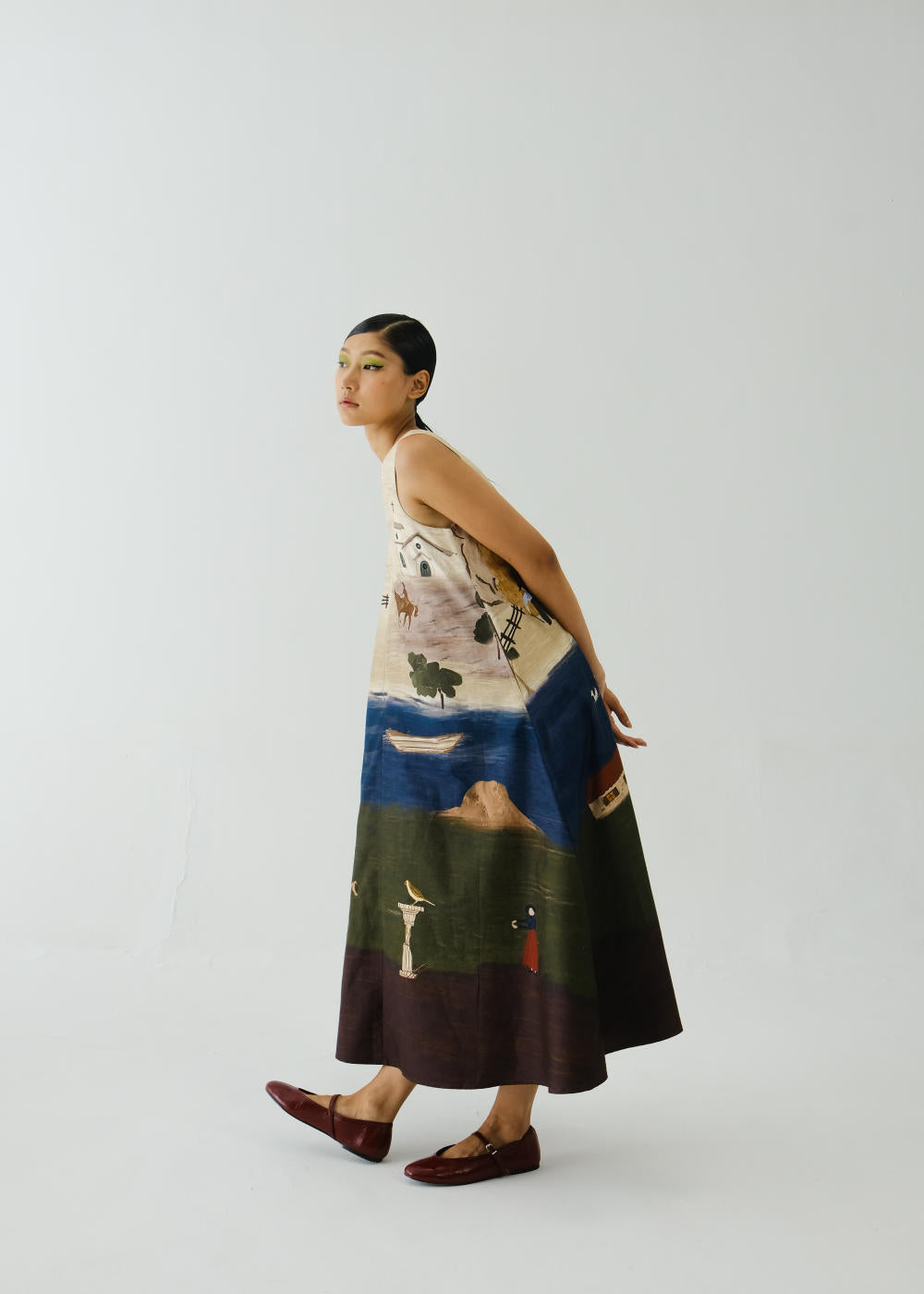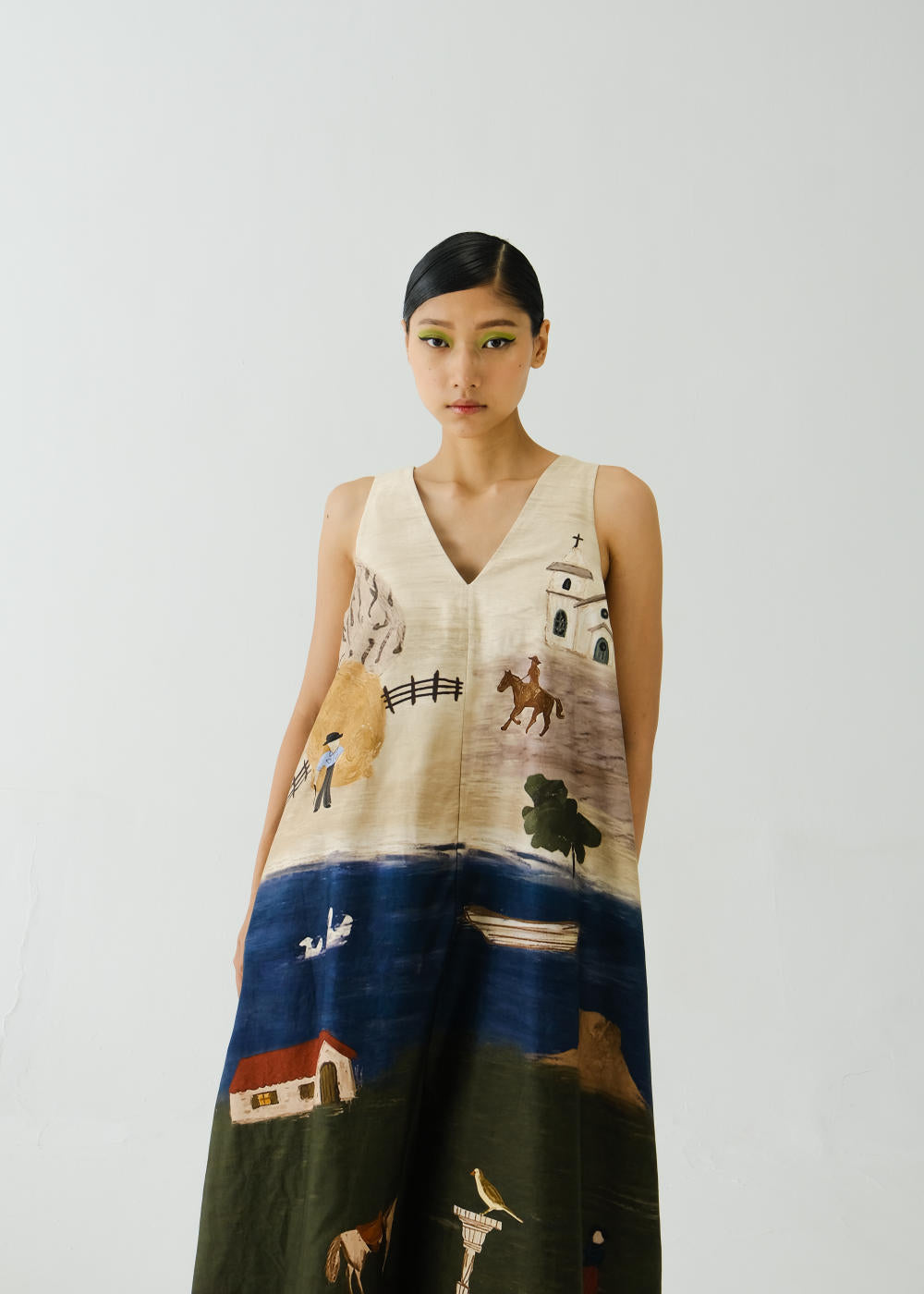 A perfect A-line dress with pockets in the side to give comfort yet an elegant look. Made with breathable cotton satin fabric in our Village print. Fabric : Cotton Satin