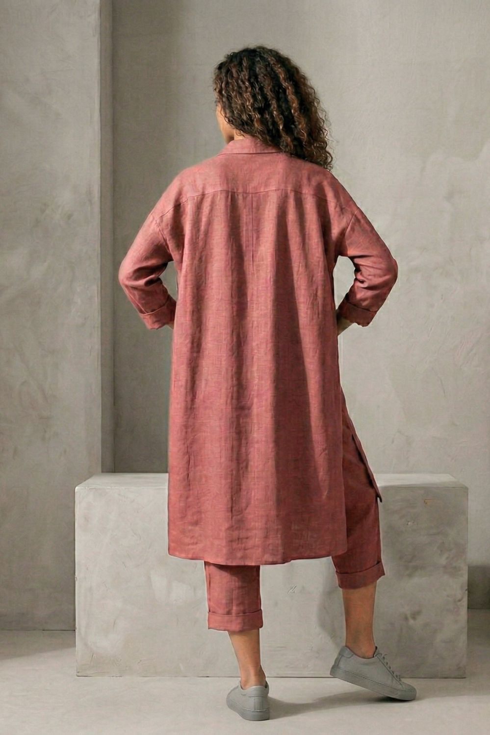 The tunic is designed in an oversized silhouette with long side slits and a functional top pocket, offering ease of movement and everyday versatility.