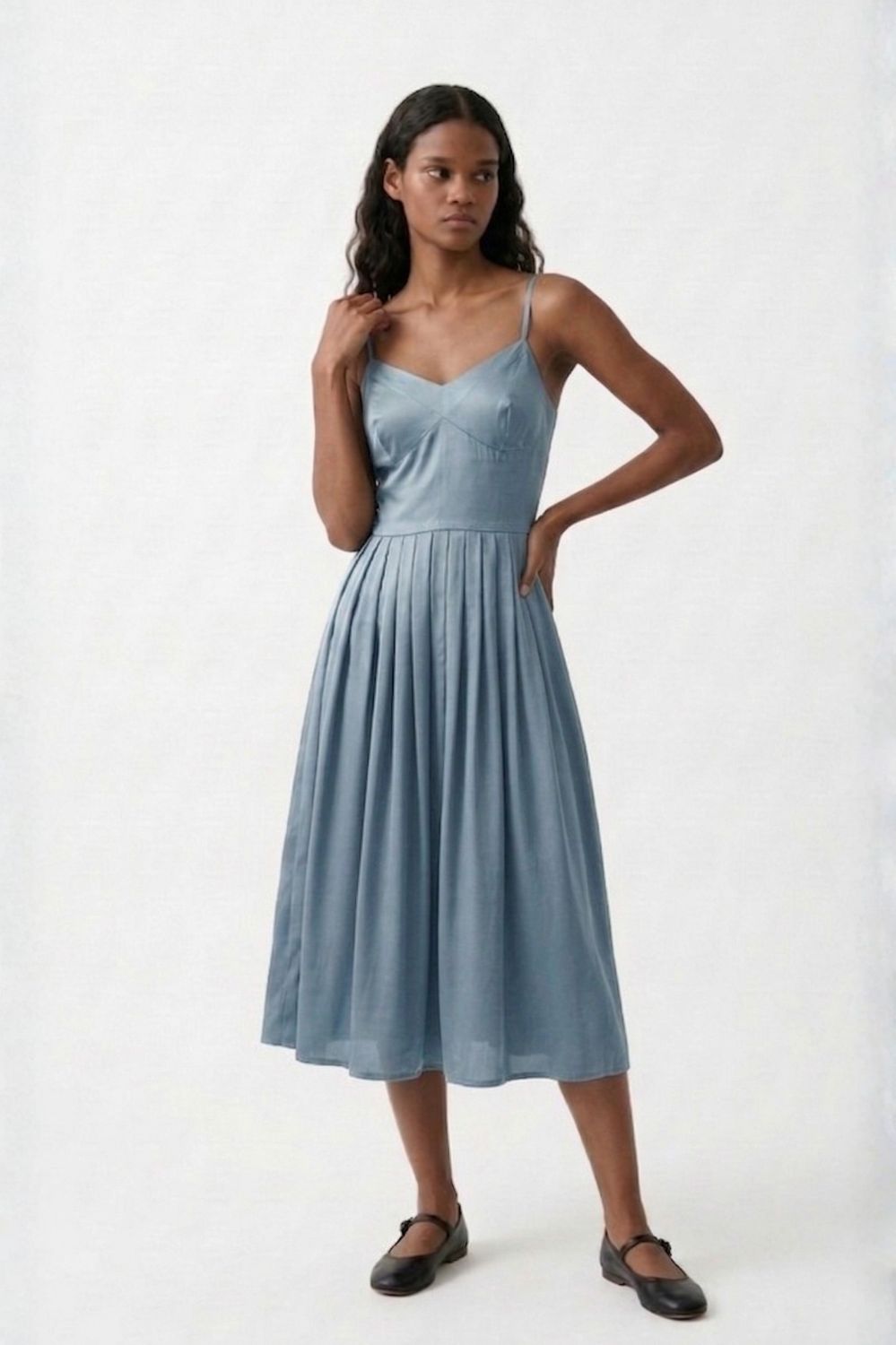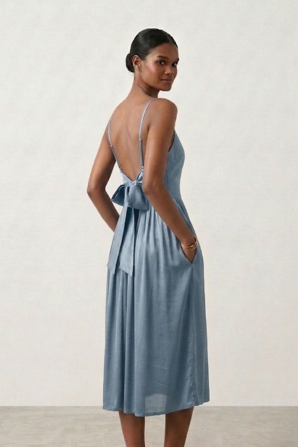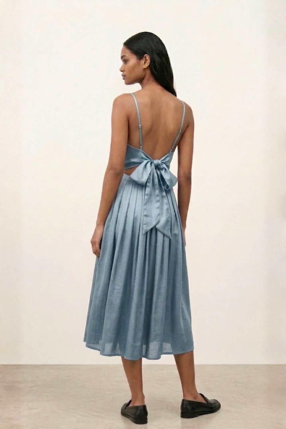 Description: A playful sundress with pleated waist, a charming back bow, and inseam pockets. Perfect for sunny days, wear it solo or layer under a denim jacket for a casual look.