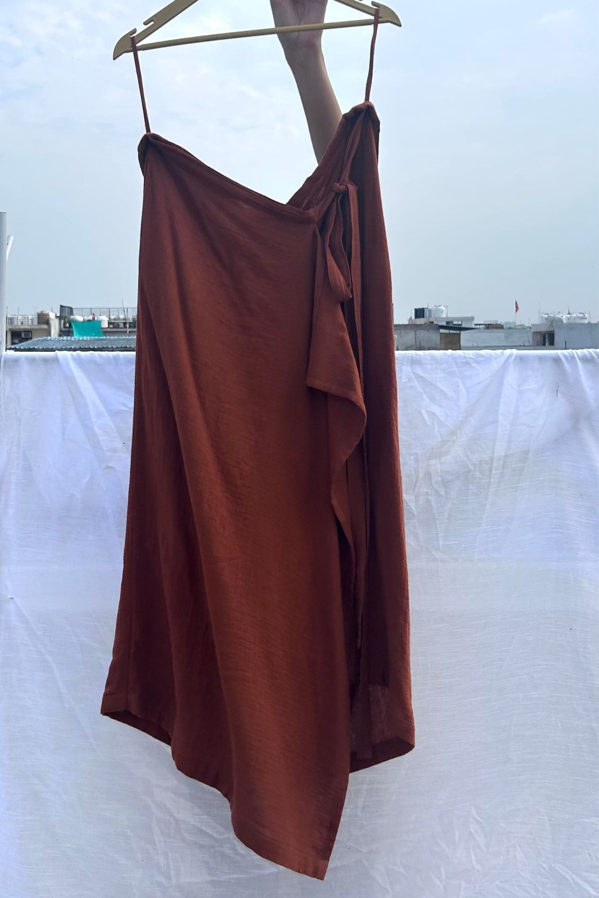 Description: Adjustable asymmetrical tie skirt with a side pocket.